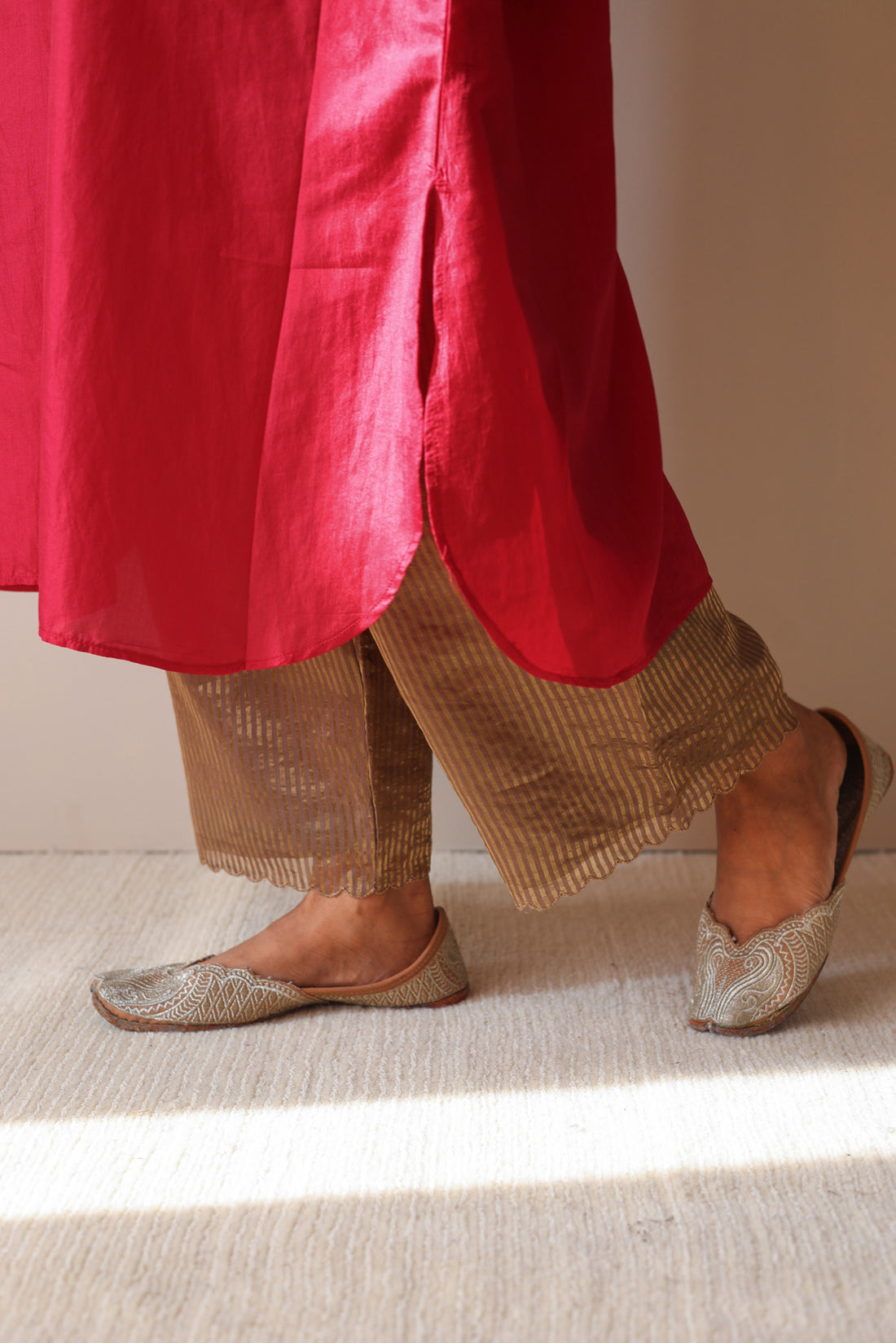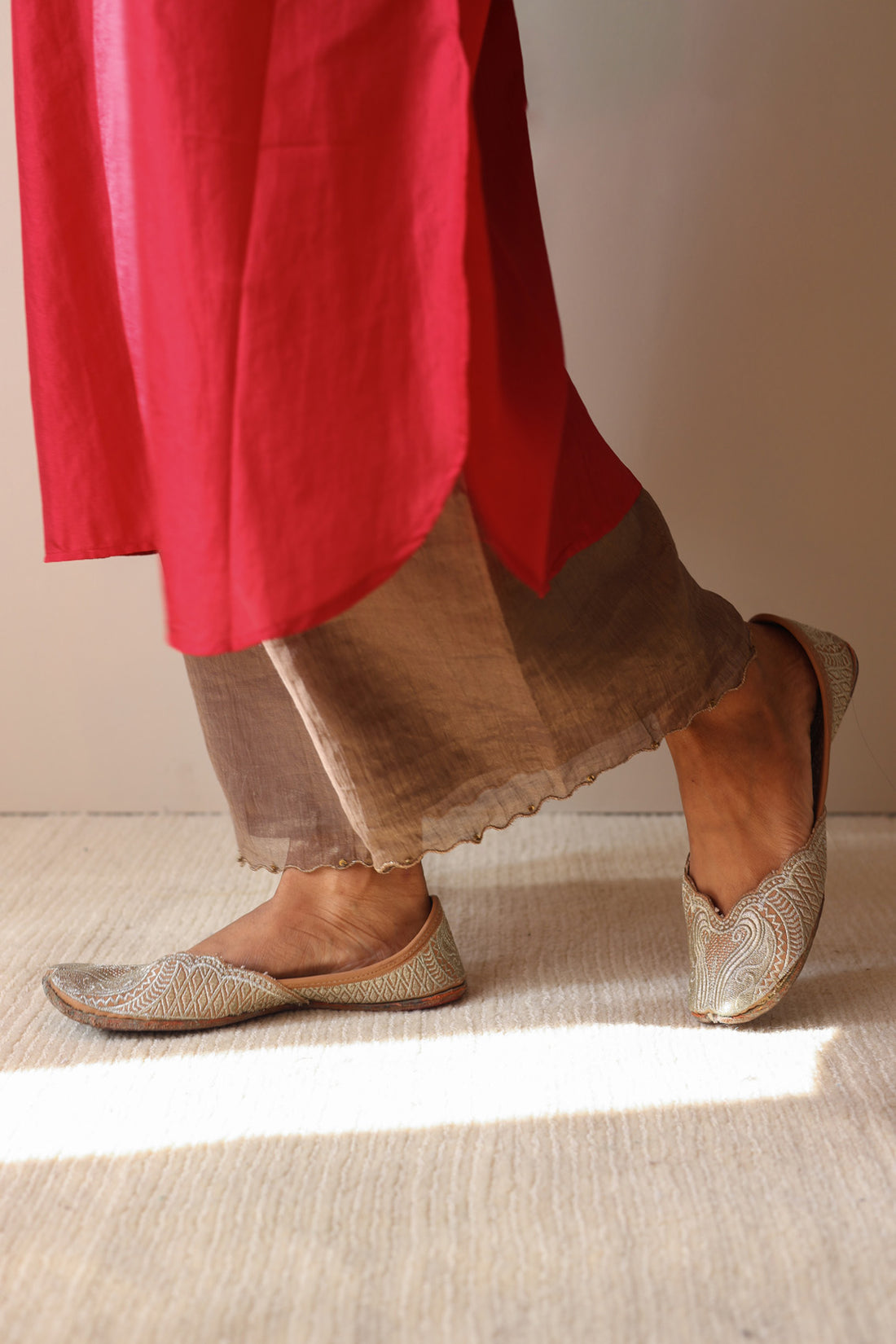 The scarlet silk farshi with delicate pitta embroidery at the bottom is a must-have in your...