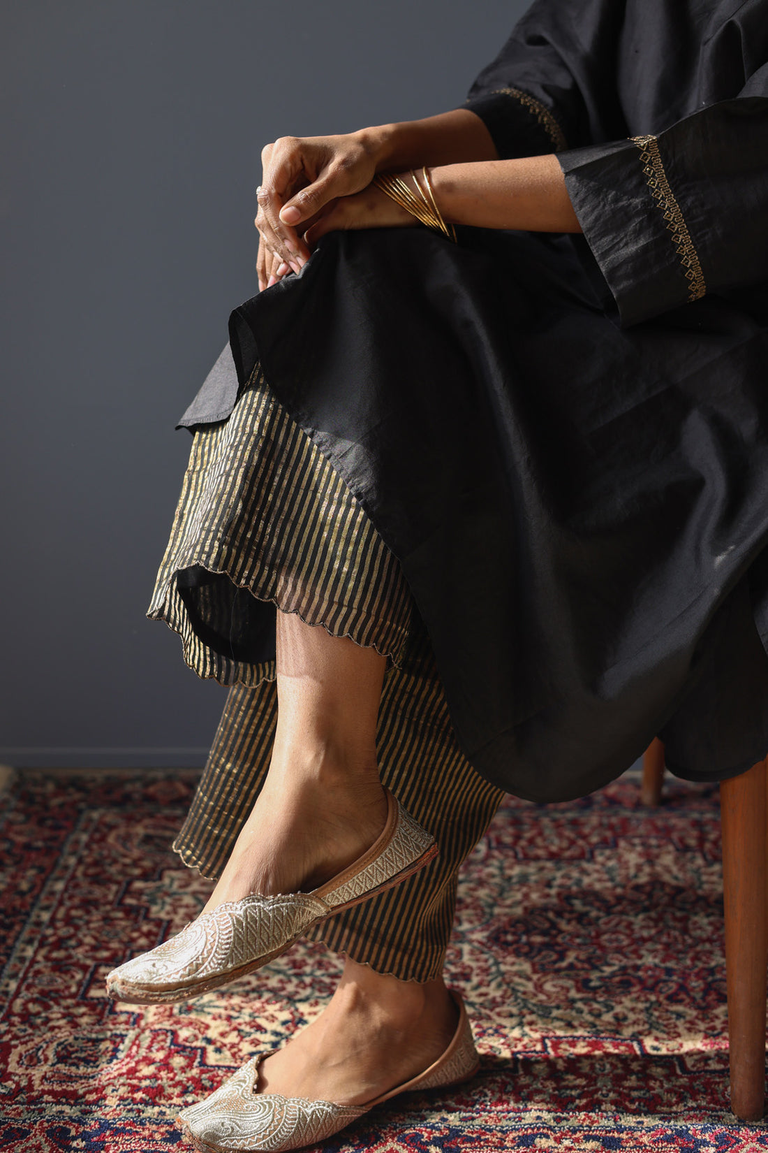 The zari striped farshi - a wardrobe essential in midnight black. It is handcrafted in...