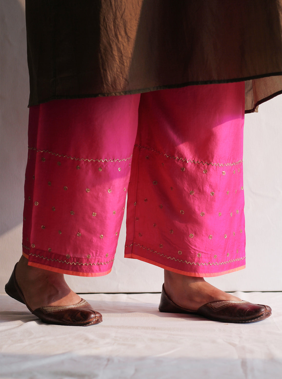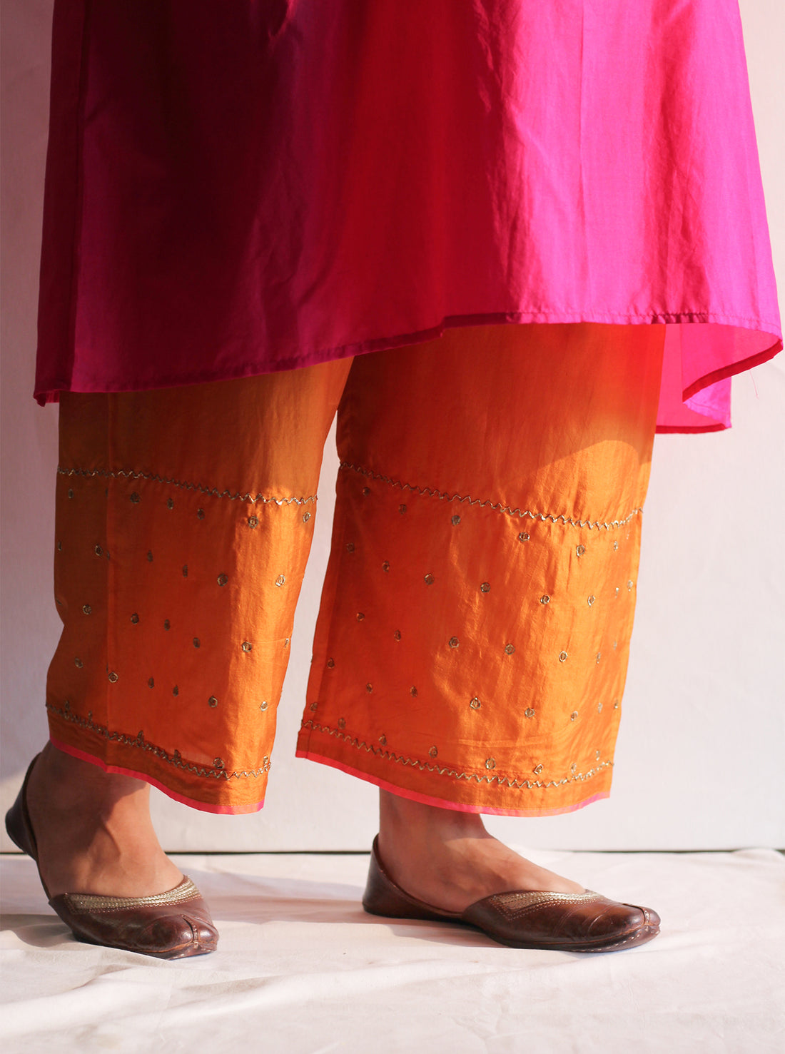The fuchsia silk farshi with delicate pitta embroidery at the bottom is a must-have in your...