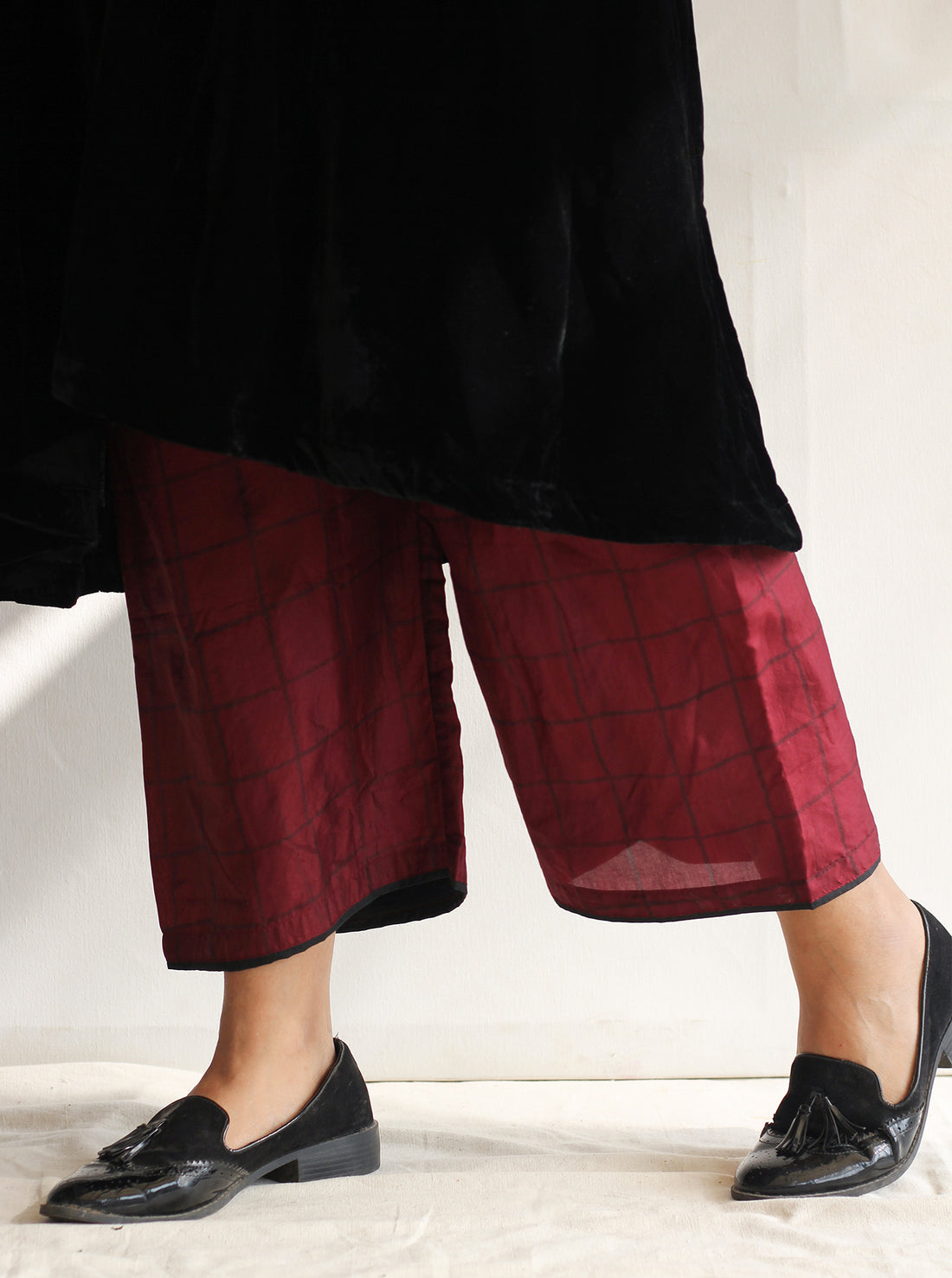The burgundy silk farshi with printed black checks is a must-have in your day to evening wardrobe...