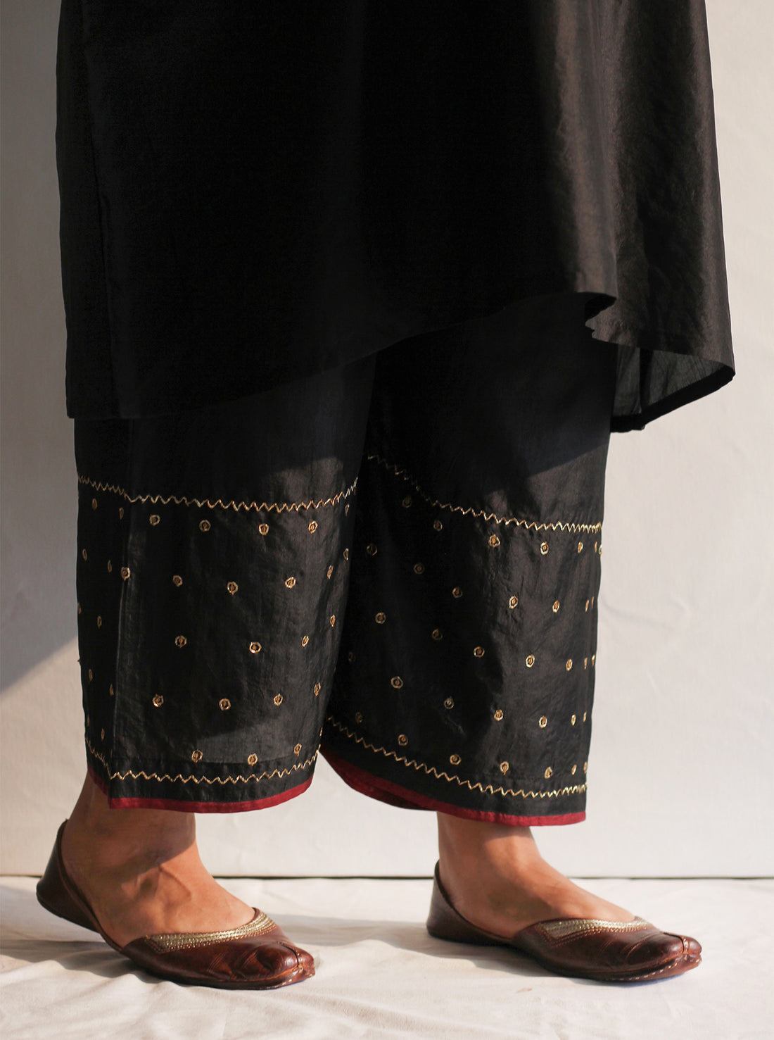 The midnight black silk farshi with delicate pitta embroidery at the bottom is a must-have in your...