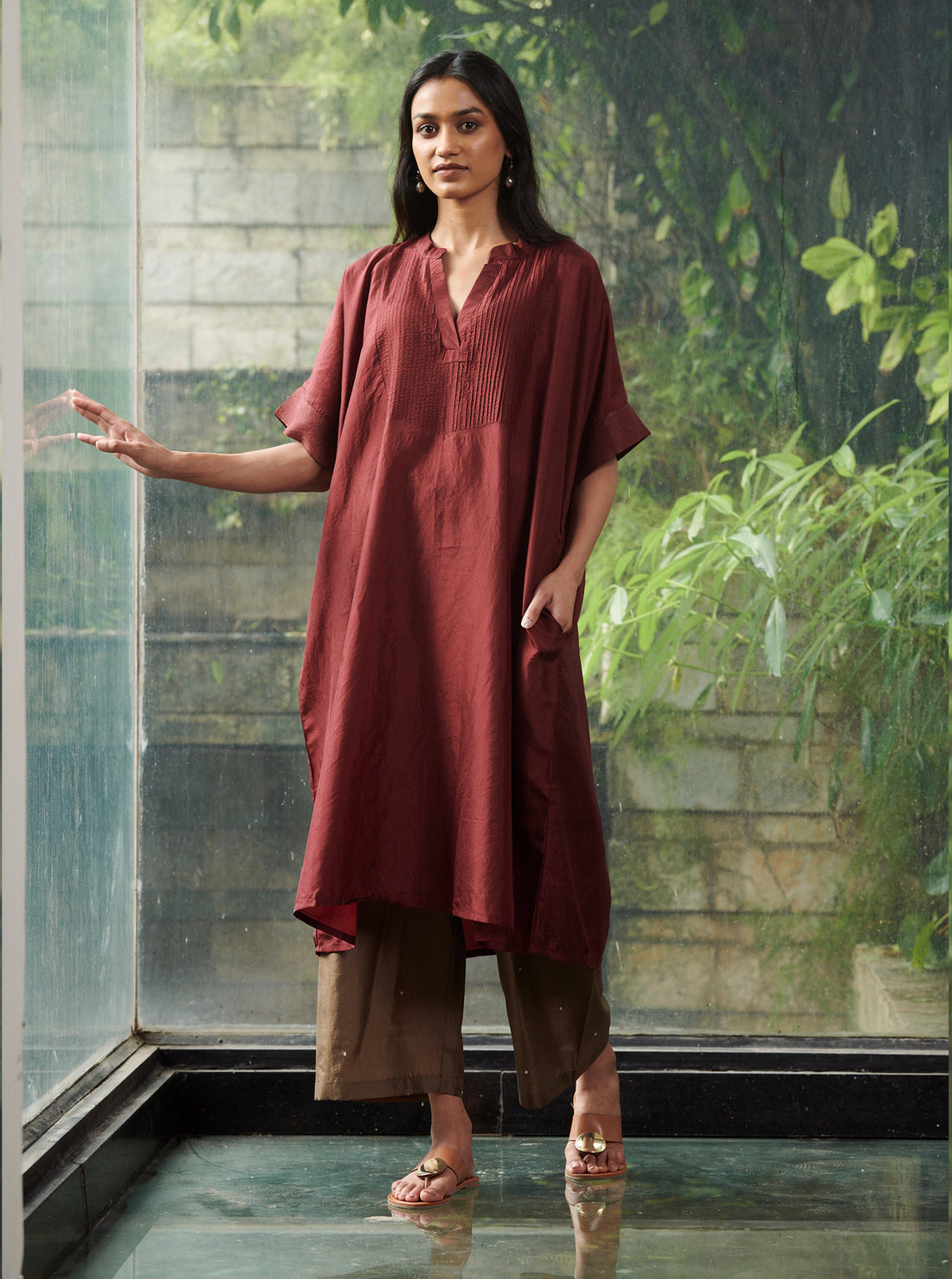 Our breezy kaftan style kurta in a deep burgundy features pintuck details along the...