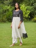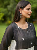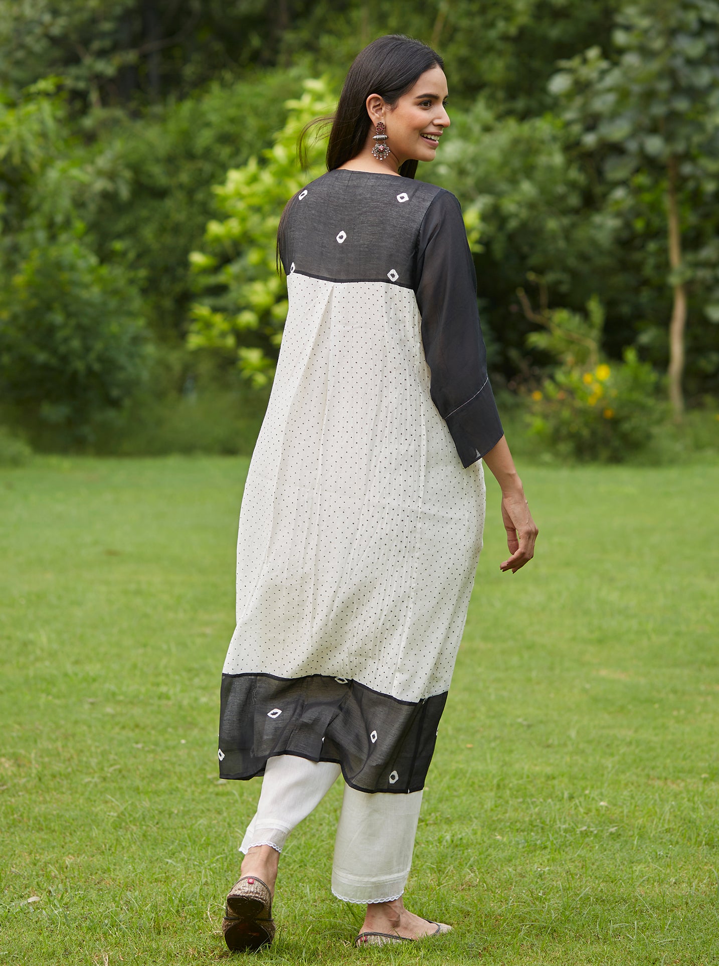 This ivory kurta features panels of tie dyed black chanderi and delicate tagai embroidery details on the chest as well as a subtle dotted block print on. Gathers below the bust give this kurta a flattering silhouette.