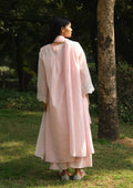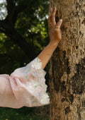 Soft and sophisticated, our blush pink kurta set features delicate pintucks on the yoke, intricate cutwork on the sleeves accented with bead embroidery, and a breezy silhouette. Paired with a matching stole and farshi, this ensemble is perfect for intimate celebrations and sunny afternoons.