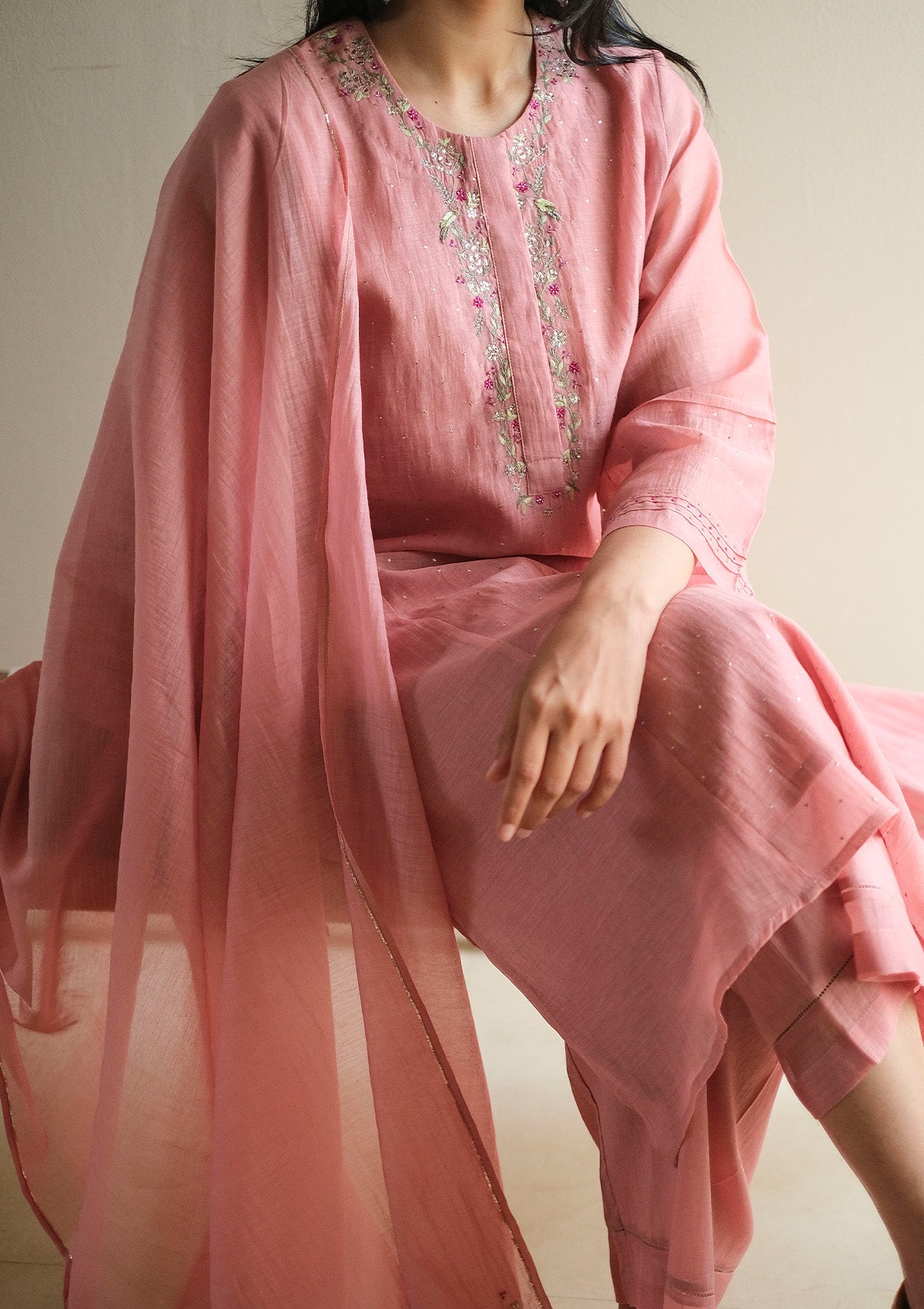 In a soft, warm hue, the Blush Pink Embroidered Kurta Set is crafted in fine handwoven Chanderi, featuring delicate floral embroidery along the neckline with scattered zari accents across the kurta. Designed in a straight, easy silhouette with a round neckline, it is finished with subtle stitch detailing at the sleeve cuffs.