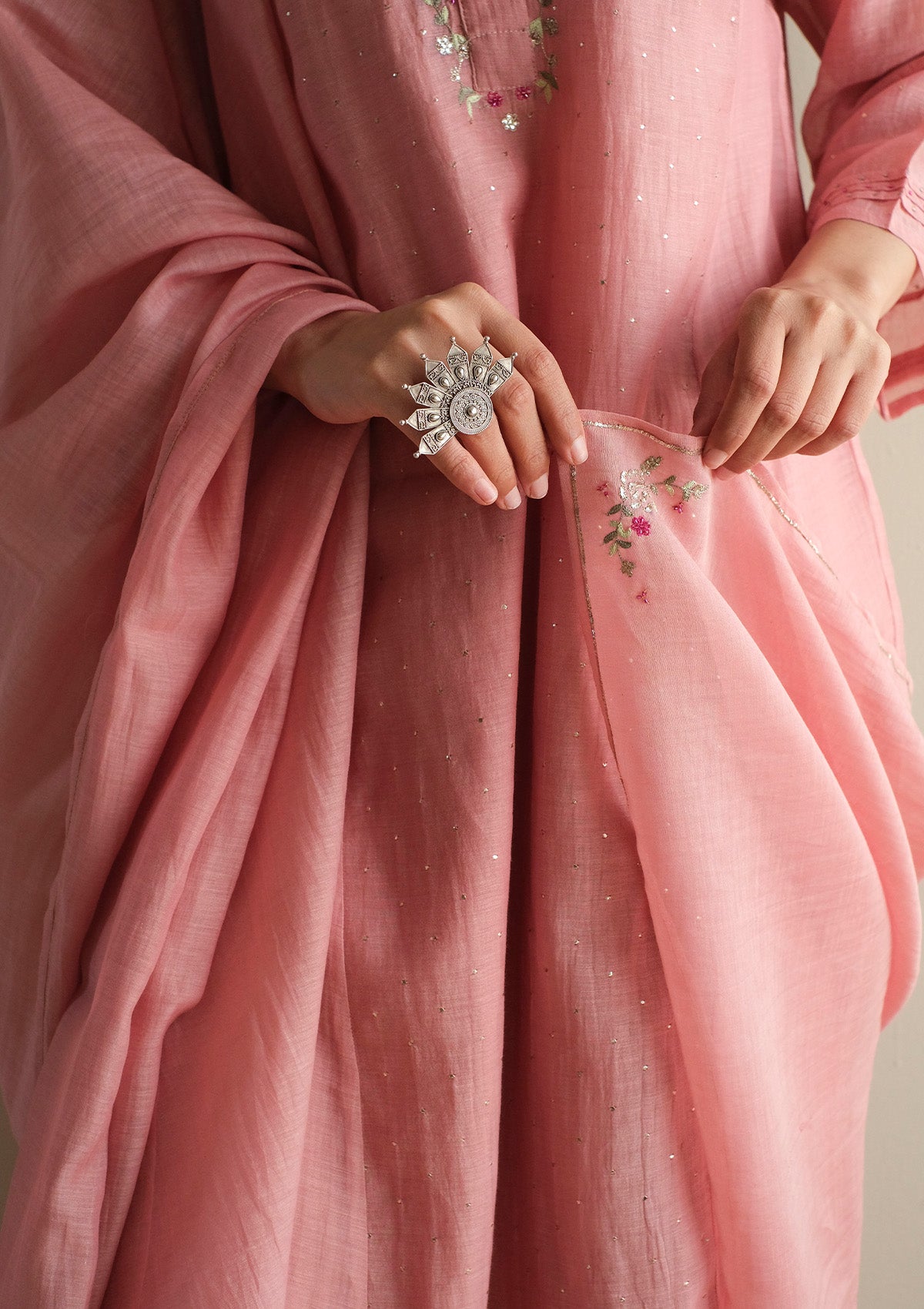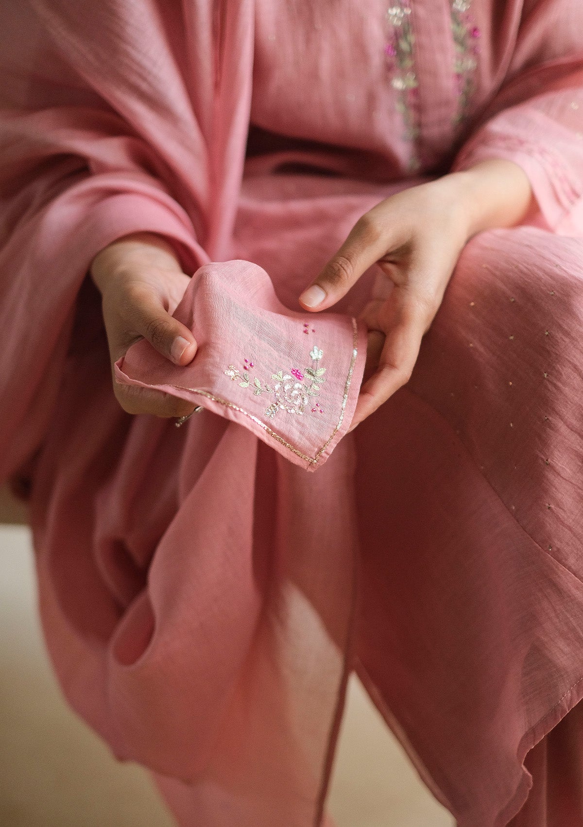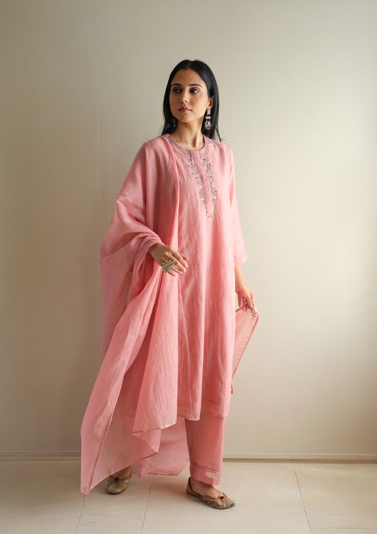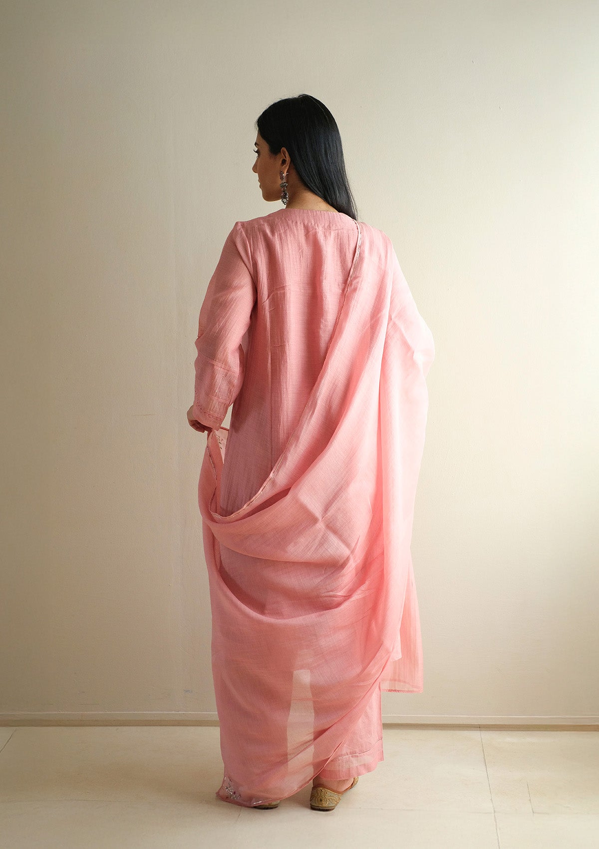 It is paired with a matching farshi detailed with fine stitch lines at the hem, and a sheer Chanderi dupatta finished with a zari border and embroidered accents, bringing the look together with a light, understated finish.