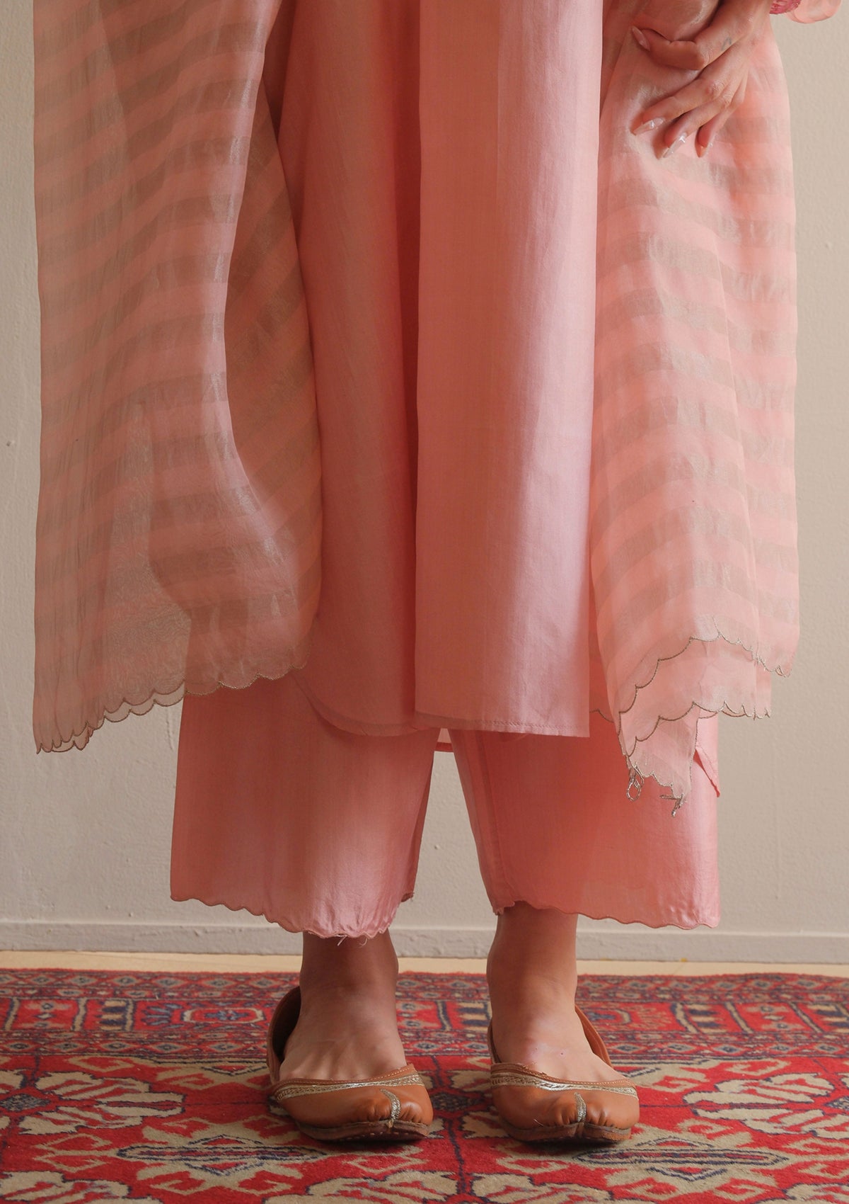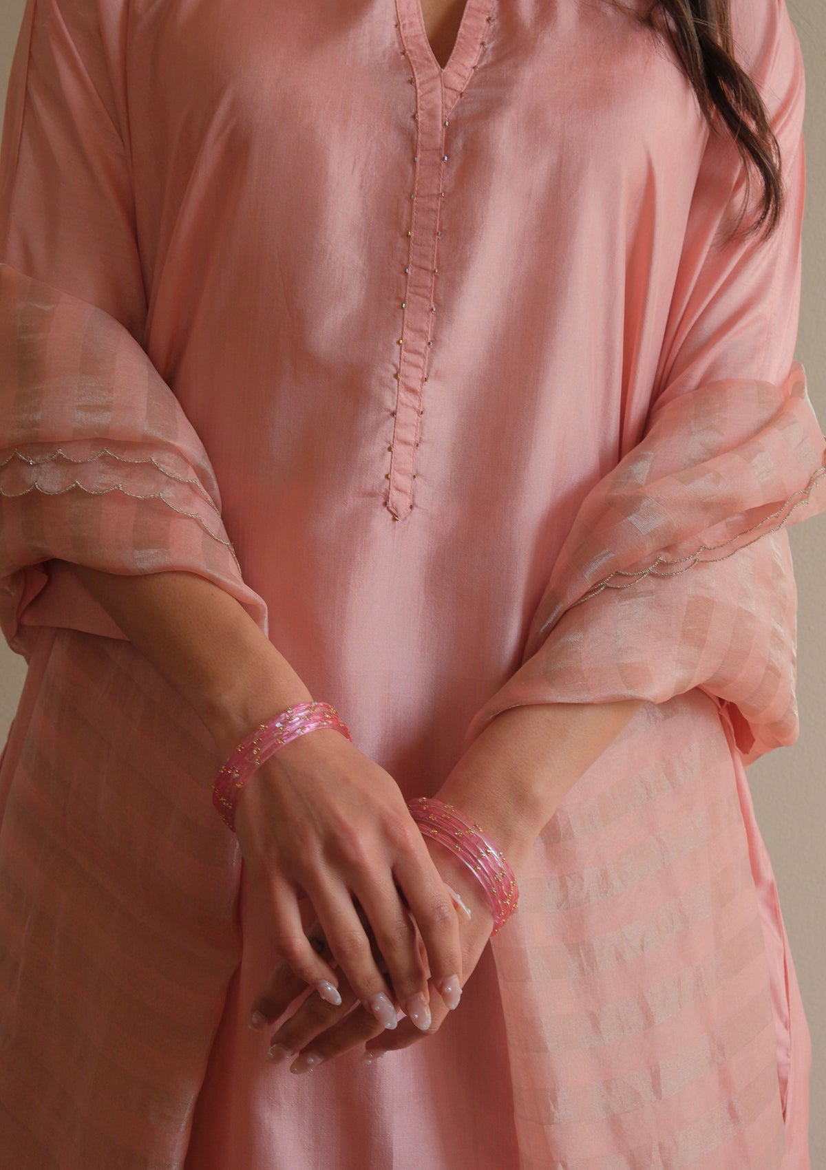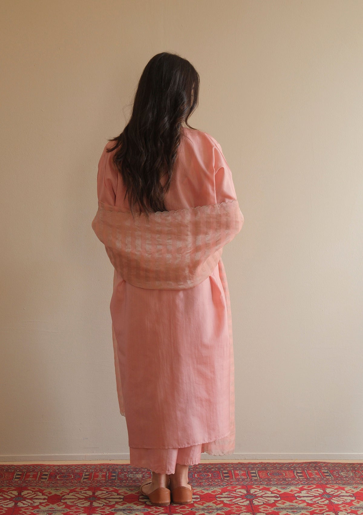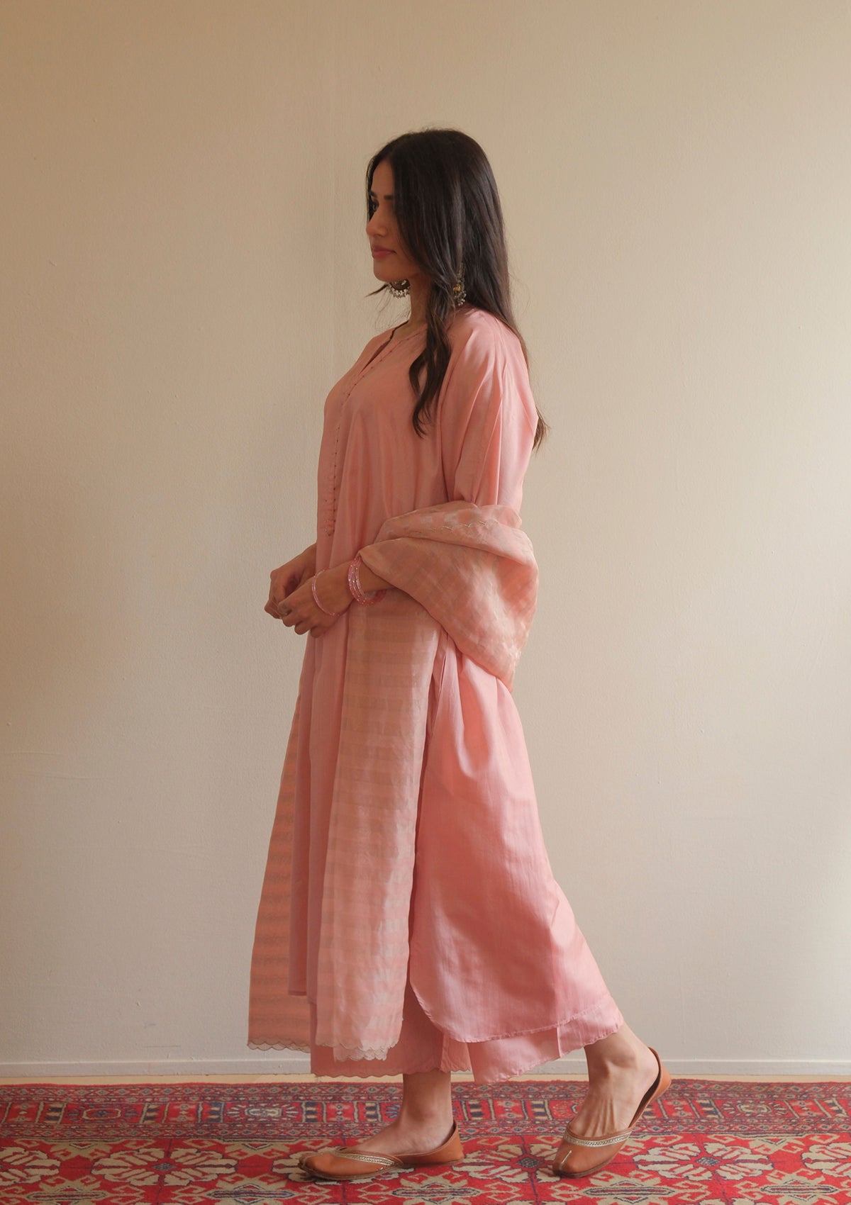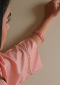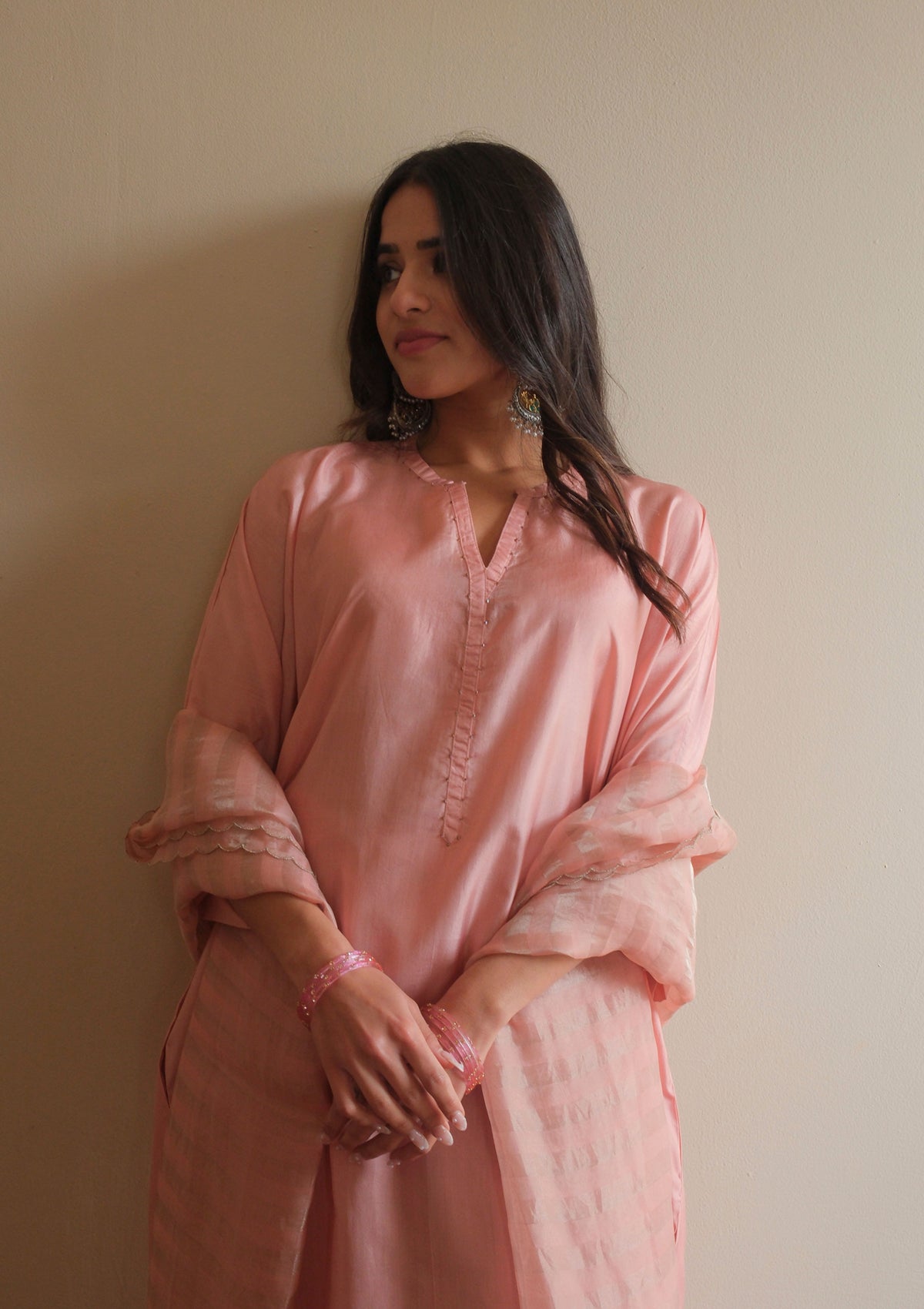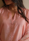Blush Silk Kurta is crafted in soft, flowing silk that drapes gracefully. Its voluminous sleeves, finished with delicate detailing, bring a subtle statement to the silhouette, while the breezy fit ensures effortless comfort. Paired with a matching farshi, it’s a timeless addition to any wardrobe.