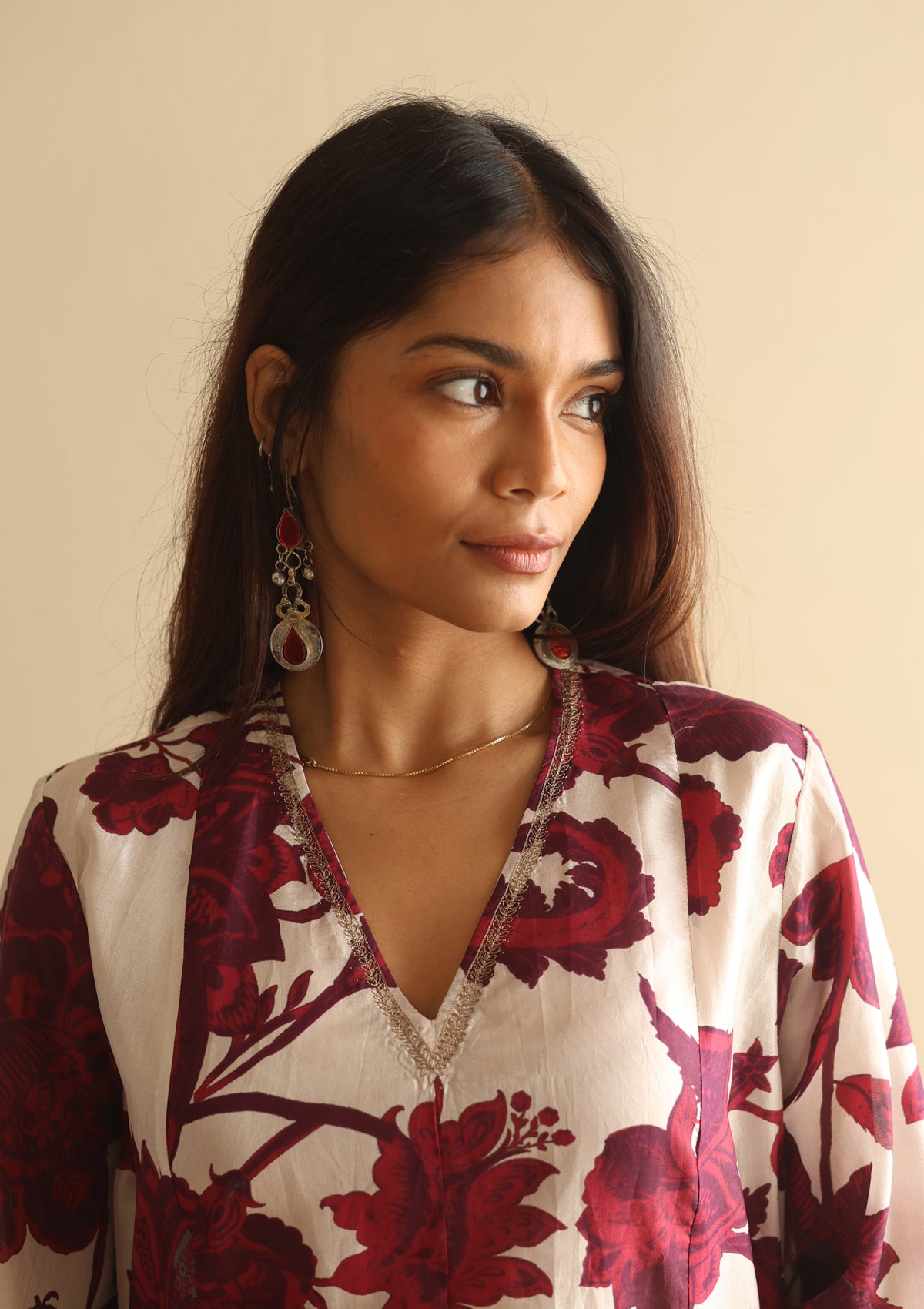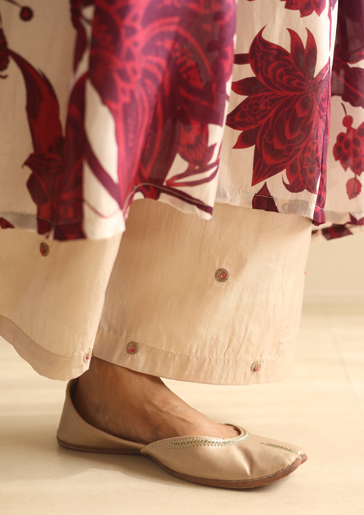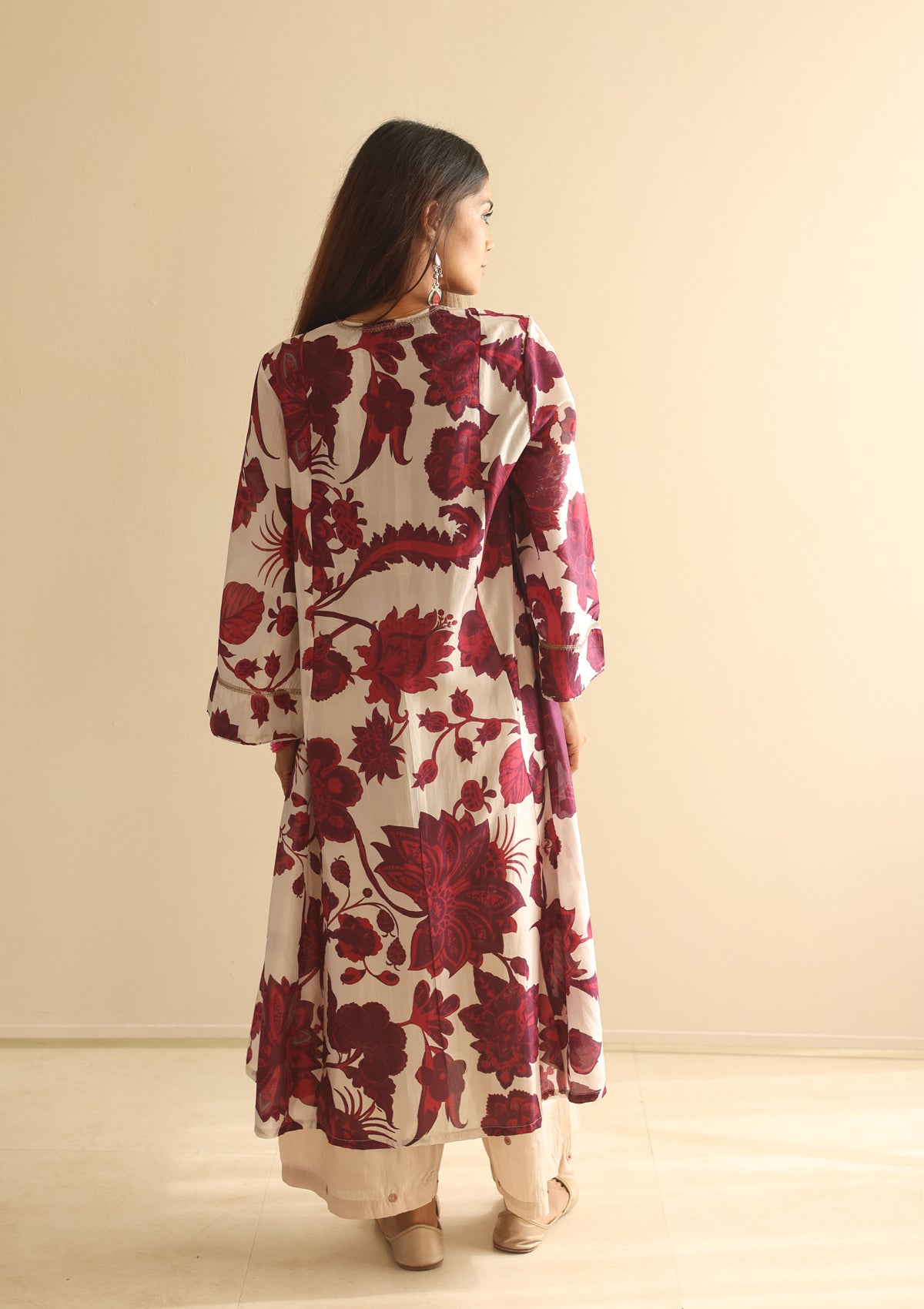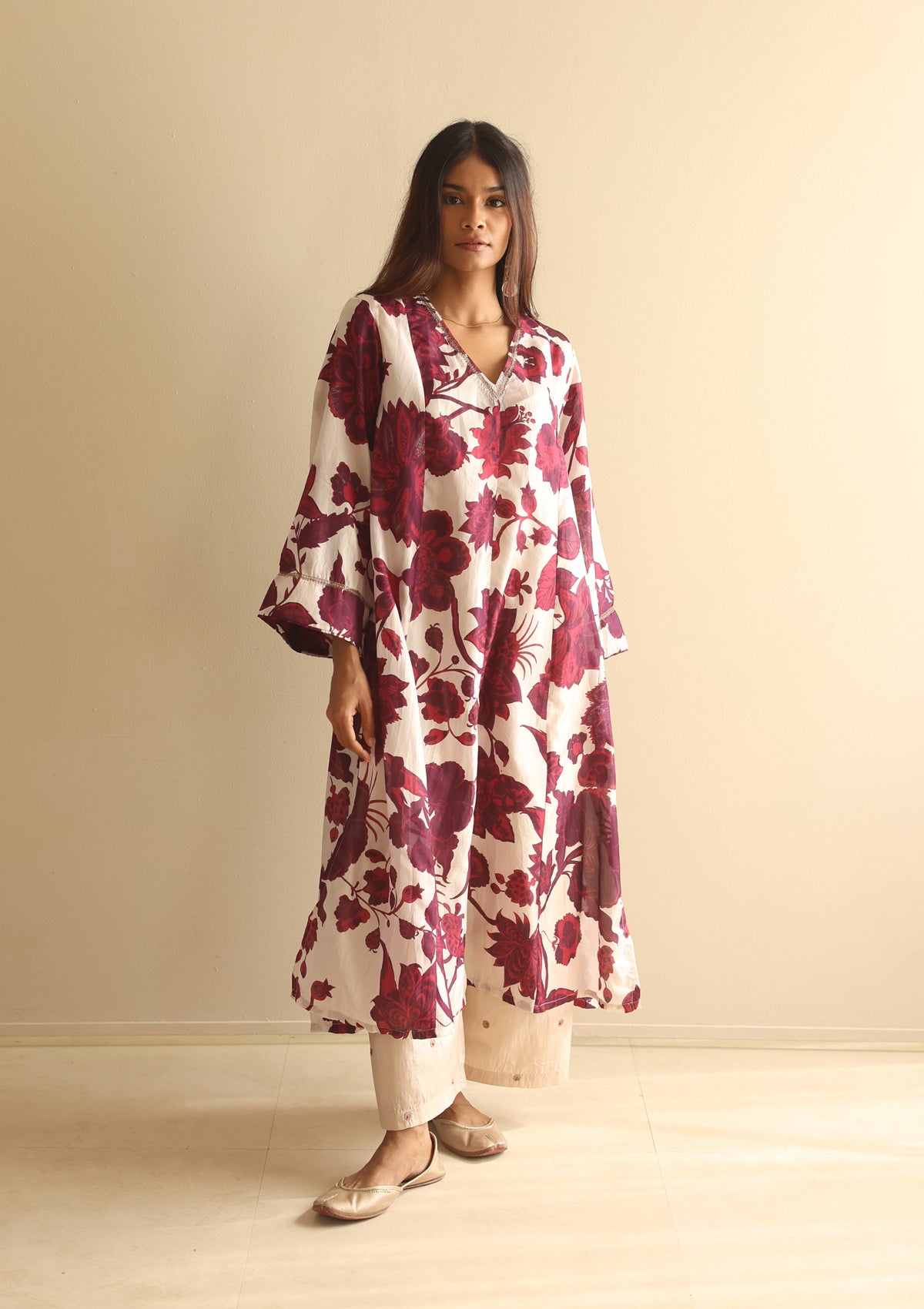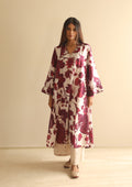 Crafted in fine silk, the Burgundy Bloom Co-ord Set is adorned with scattered floral prints that bring subtle vibrance to its rich hue. The kurta features delicate zari embroidery along the neckline and soft voluminous sleeves, striking a balance between comfort and quiet detail. Paired with an ivory embroidered farshi, handcrafted in silk with circular zari motifs, this ensemble is an effortless choice for festive occasions and refined gatherings.