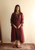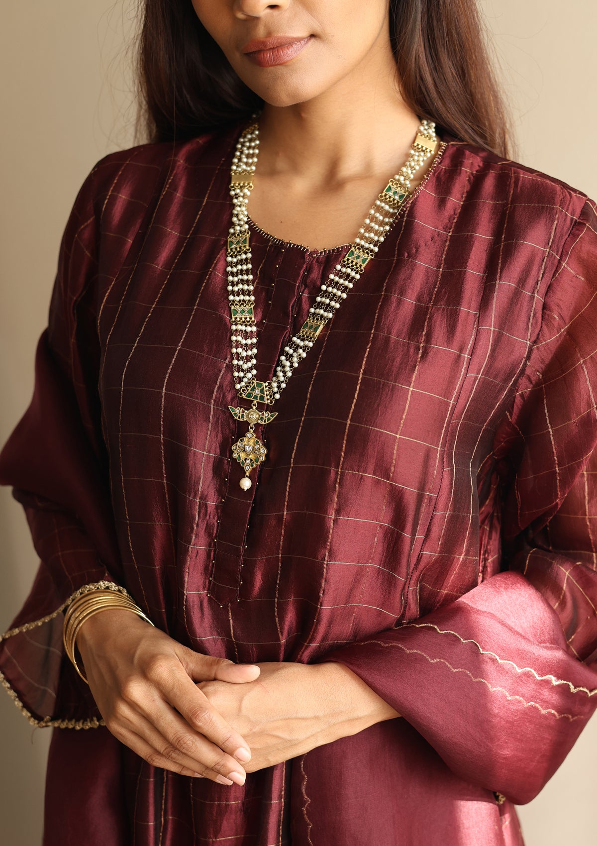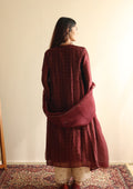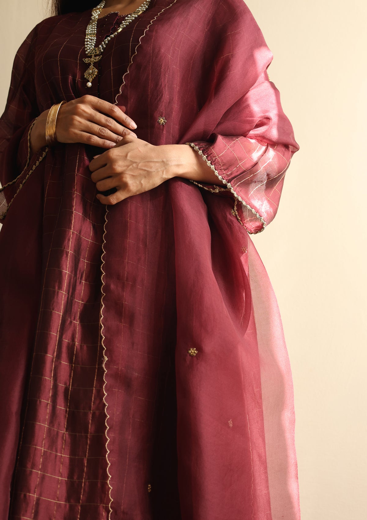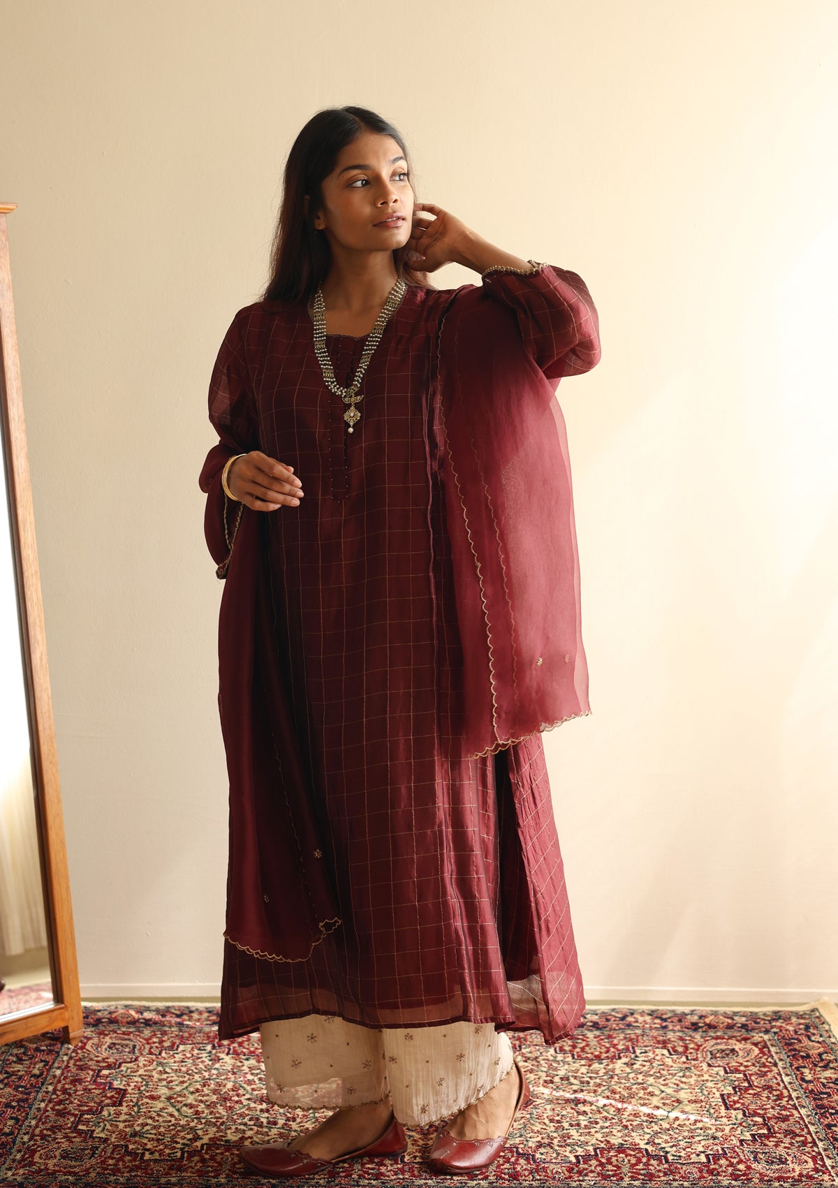 he Burgundy Checkered Kurta Set features voluminous sleeves adorned with zari along the cuffs and a buttoned neckline that adds gentle definition. Paired with an ivory zari farshi, shimmering softly along the hem with scattered motifs, and a sheer dupatta traced with scallops and beaded accents, it carries a graceful charm meant for quiet celebrations.