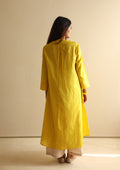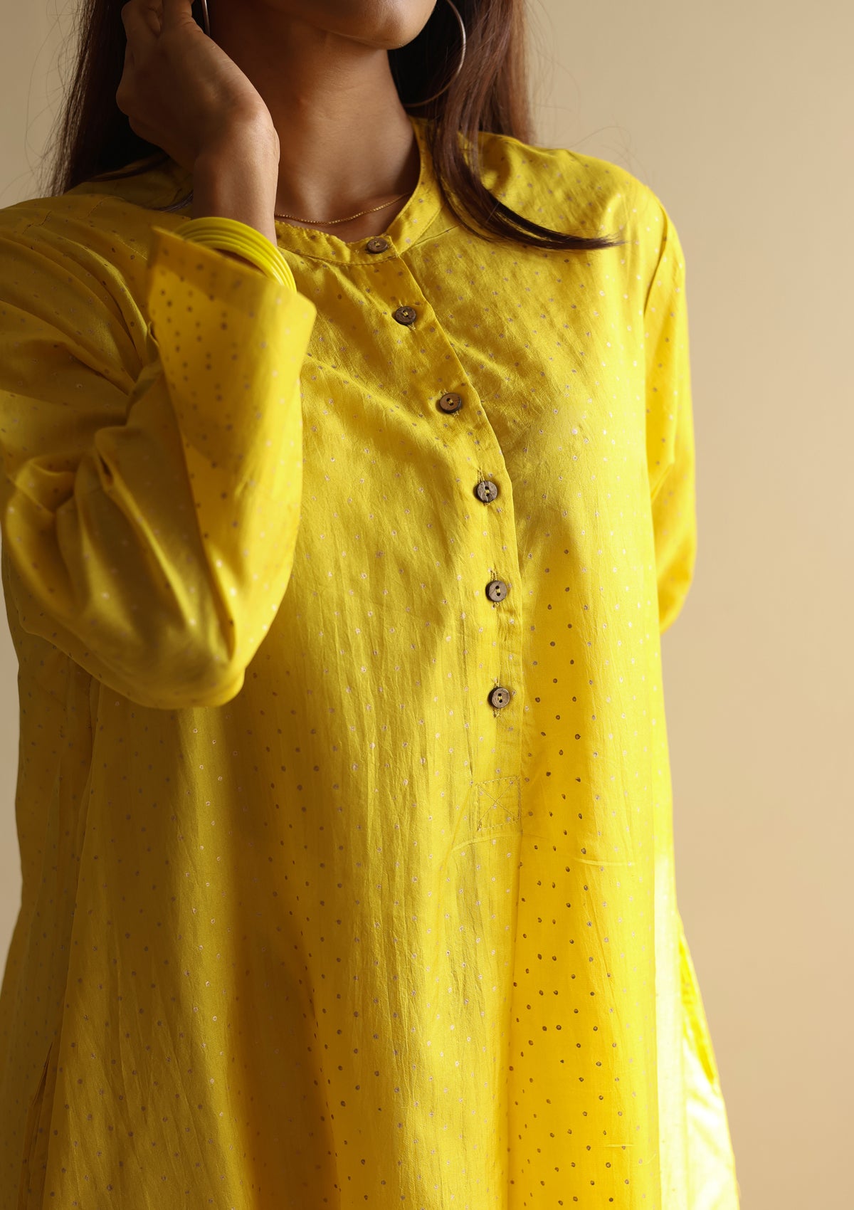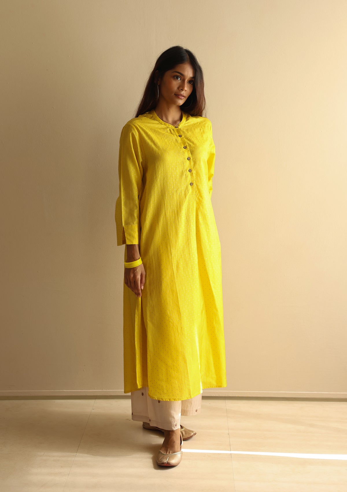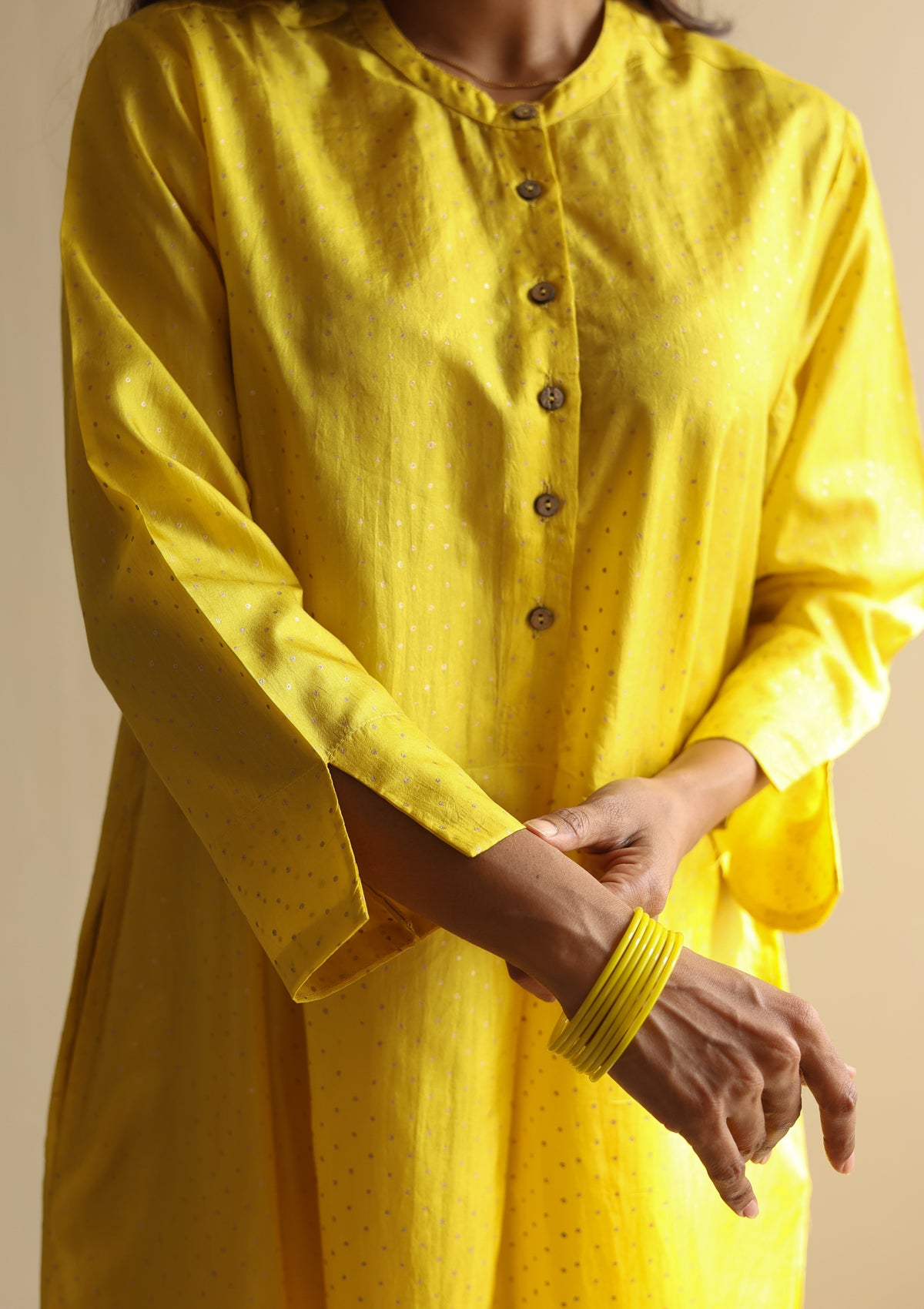 Radiating warmth and ease, the Canary Hand Blockprint Kurta in fine silk brings a soft glow to everyday dressing. Hand blockprinted gold dots lend a festive shimmer, while the button-down neckline, slit sleeves, and side pockets add comfort and flow.
