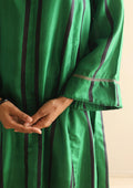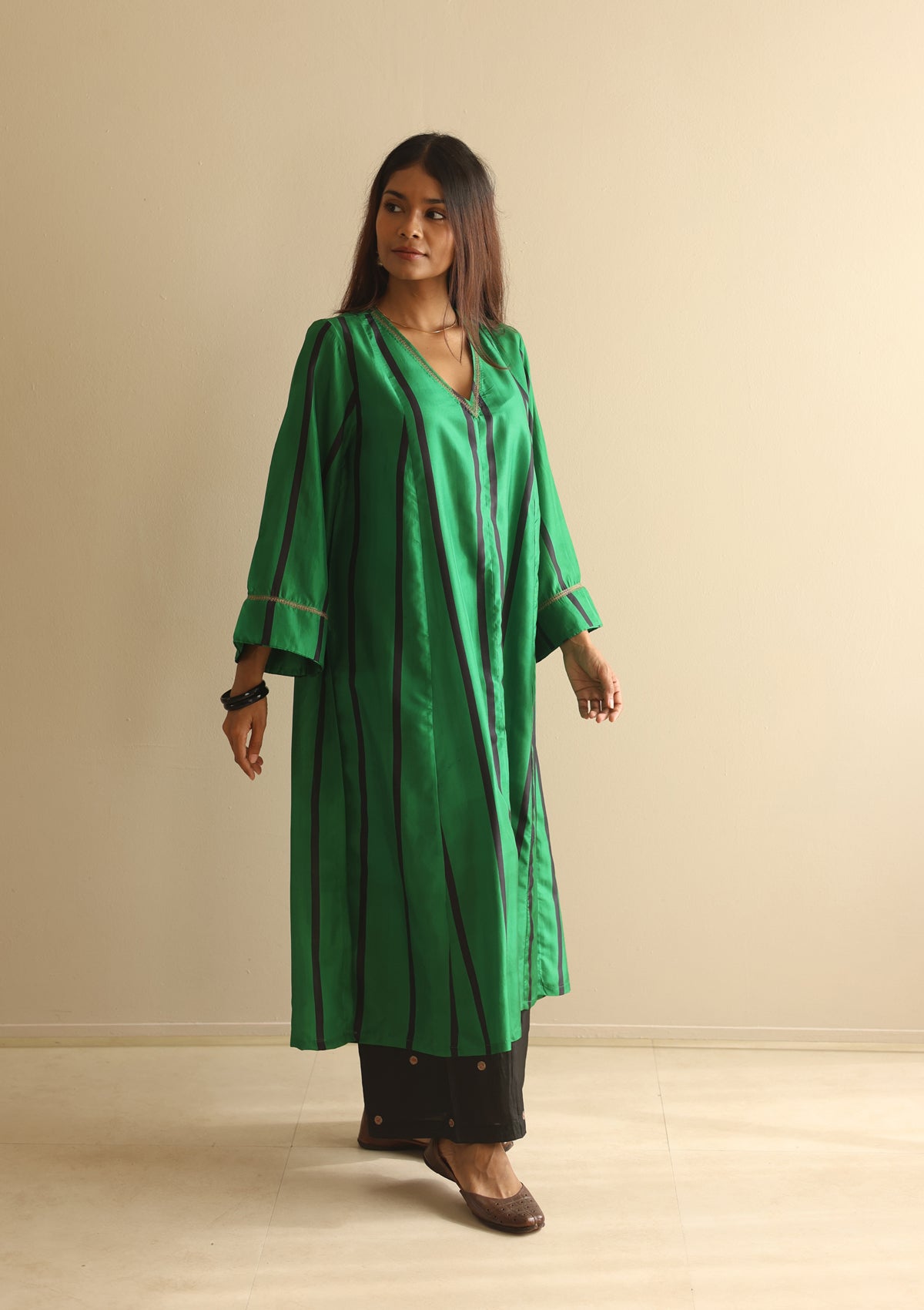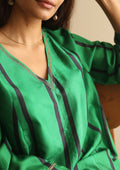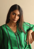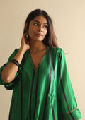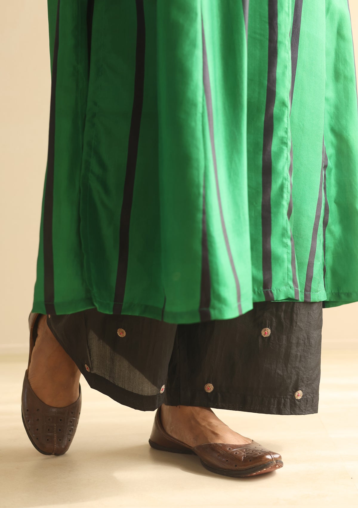 Tailored in luxurious silk, the Midnight Black and Blue Bloom Co-ord Set captures the allure of twilight tones with blooms scattered across its surface. The kurta features fine zari embroidery around the neckline and softly gathered sleeves, lending it a refined, fluid charm. It is paired with midnight black embroidered farshi pants, handcrafted in silk with circular zari motifs — a timeless pairing that moves effortlessly from festive evenings to elegant gatherings.