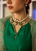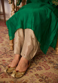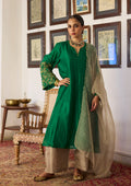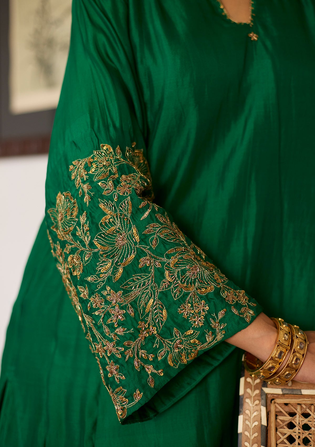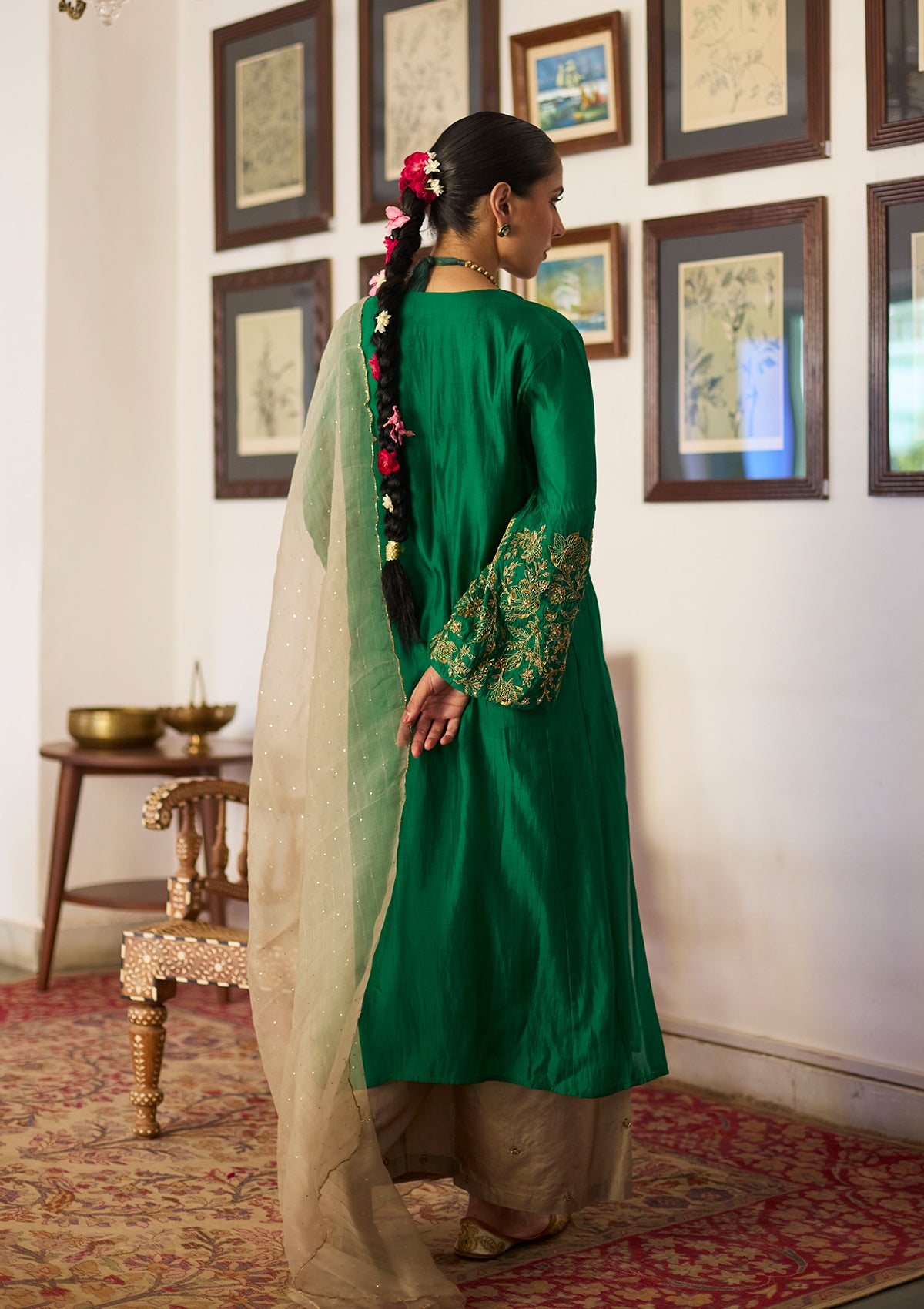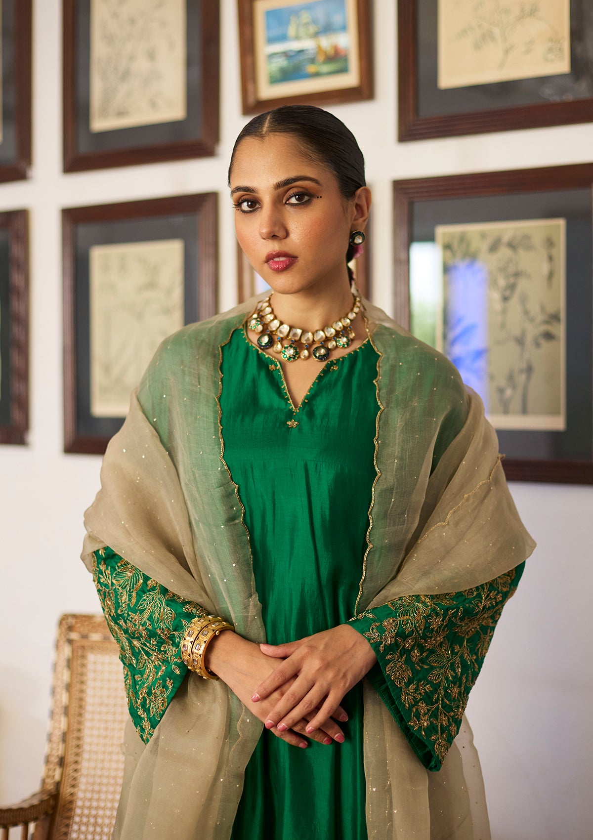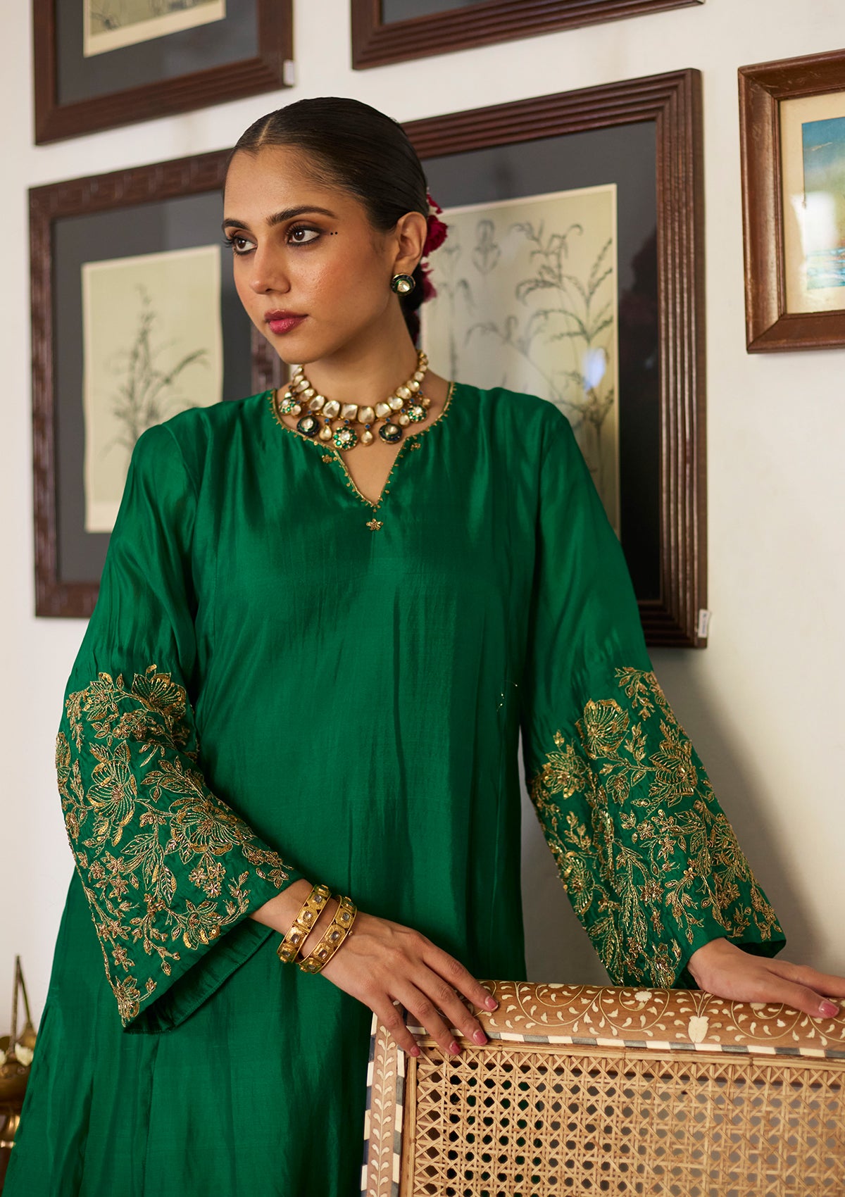 The Emerald Green Zardozi Kurta Set features voluminous sleeves detailed with intricate zardozi embroidery and a neckline accented with delicate zari. Designed for special evenings, it is paired with a contrasting farshi, and complete with an organza mukaish dupatta edged in zari, adding subtle shimmer.