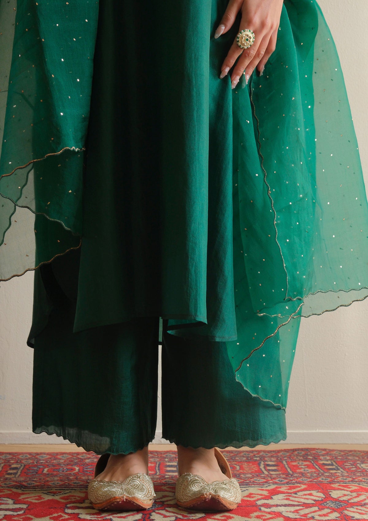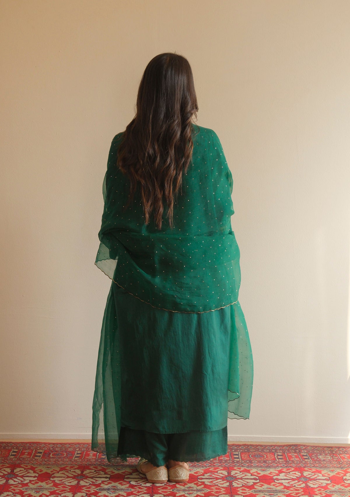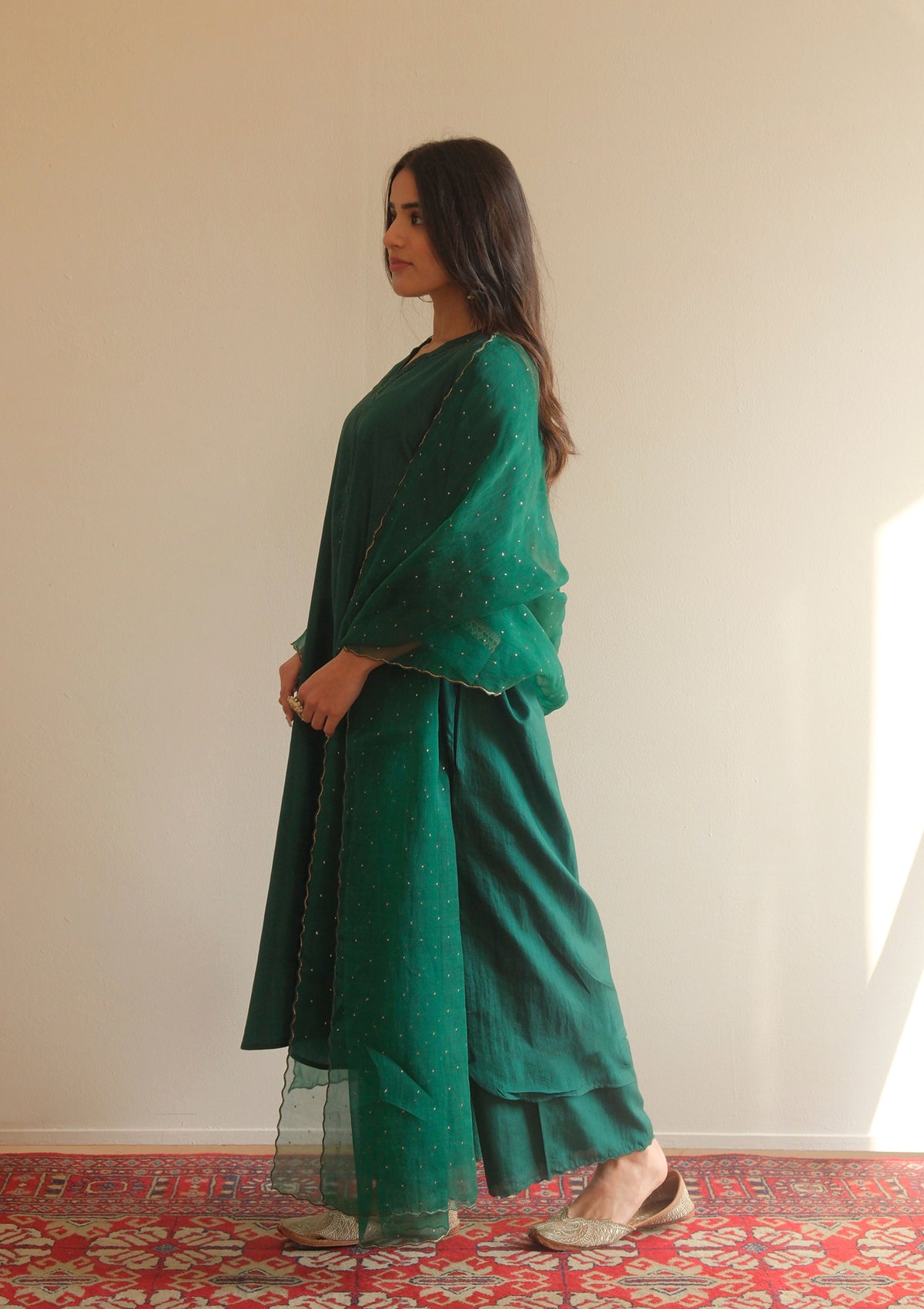 The Forest Green Kurta Set is crafted in soft silk that drapes effortlessly. Voluminous sleeves with delicate detailing add a subtle statement to the silhouette, while the breezy fit ensures comfort and ease. The look is completed with a matching farshi, making it a timeless and versatile addition to your wardrobe.