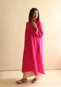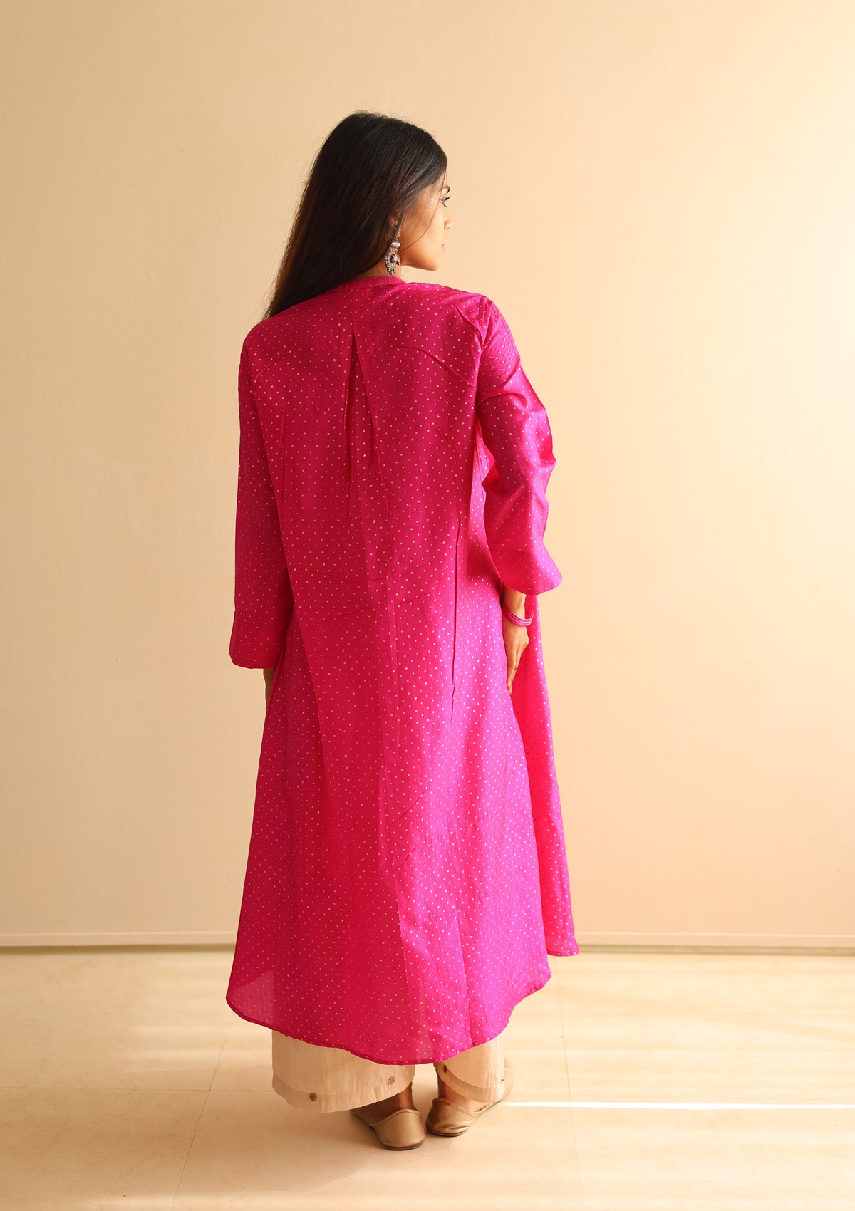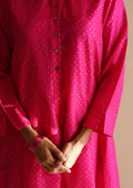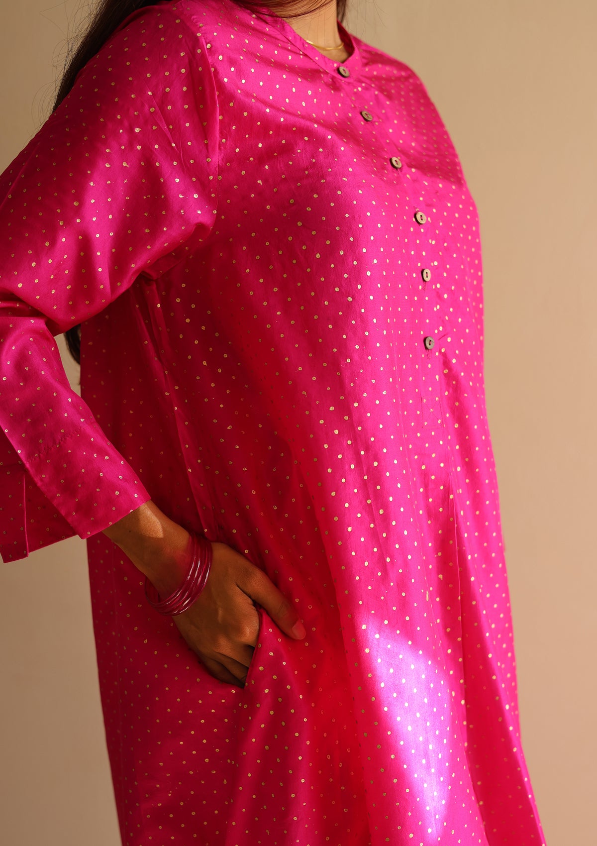 Crafted in lustrous silk, the Fuchsia Hand Blockprint Kurta captures the vibrance of color and the grace of structure. The kurta features hand blockprinted gold dots scattered across its surface, a buttoned neckline, slit sleeves, and pockets that add quiet ease to its refined form.