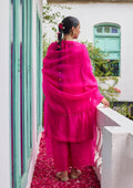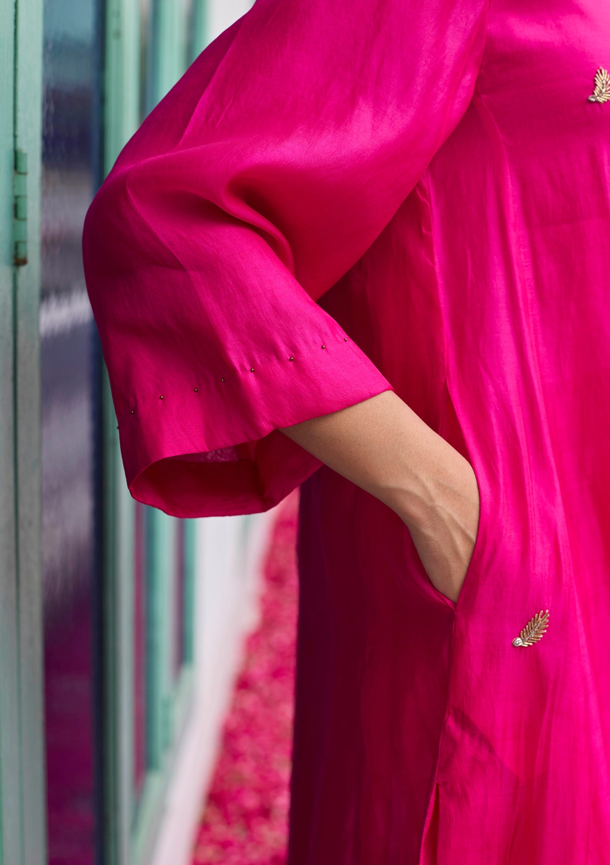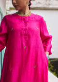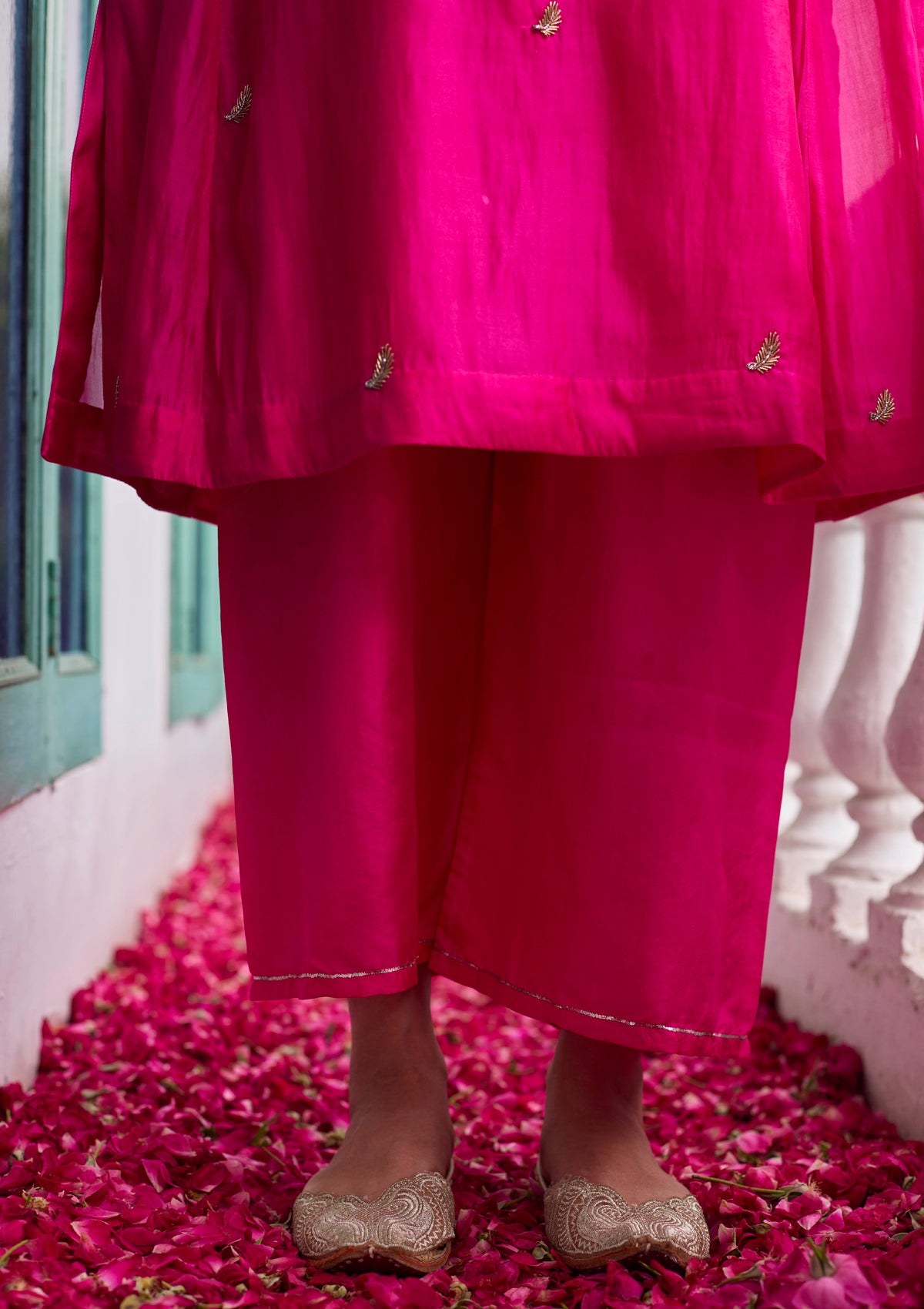 The Fuchsia Silk Embroidered Kurta Set features a buttoned neckline and a surface scattered with delicate leaf embroidery. It is paired with a matching farshi with zari accents. The dupatta in sheer organza is finished with delicate embroidery along the edges and a leaf pattern to match. This set combines brings festive elegance to your wardrobe.
