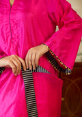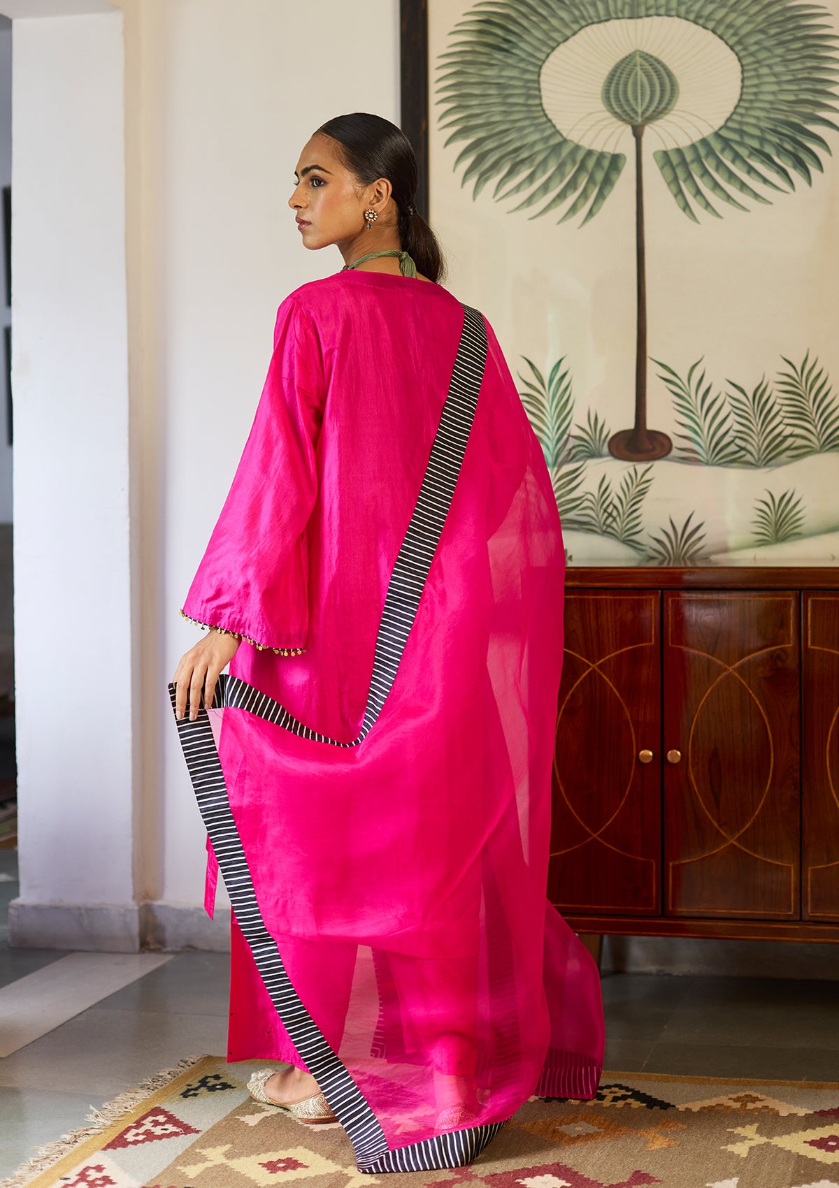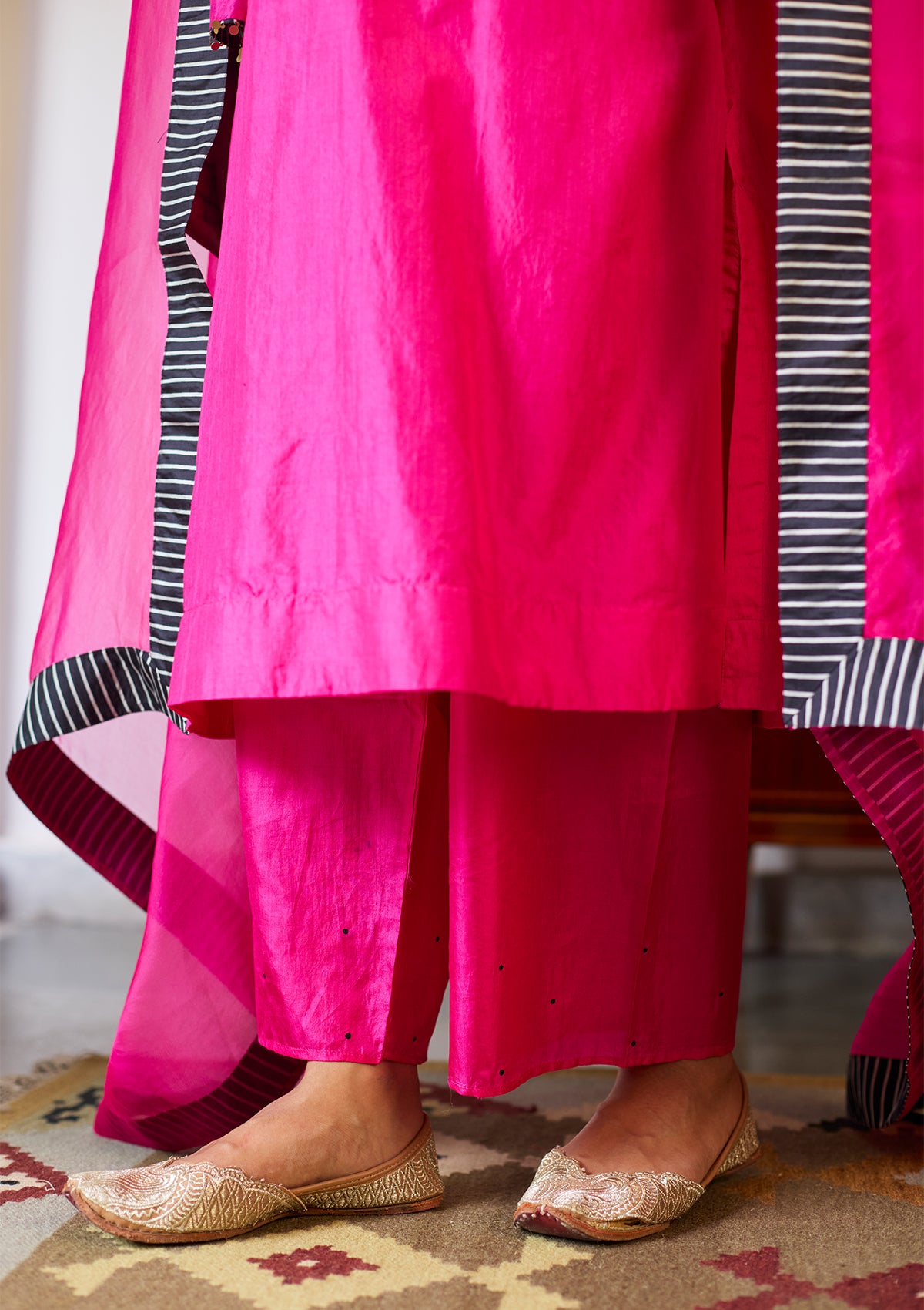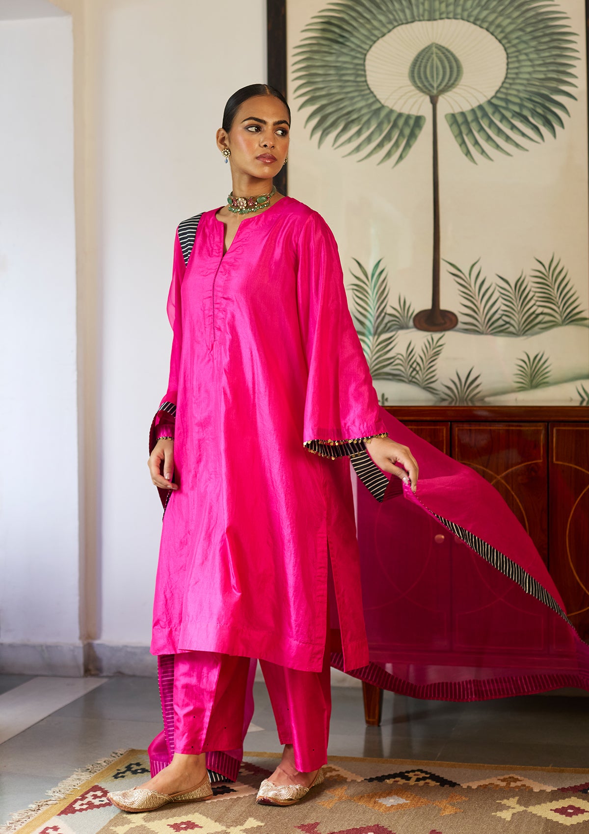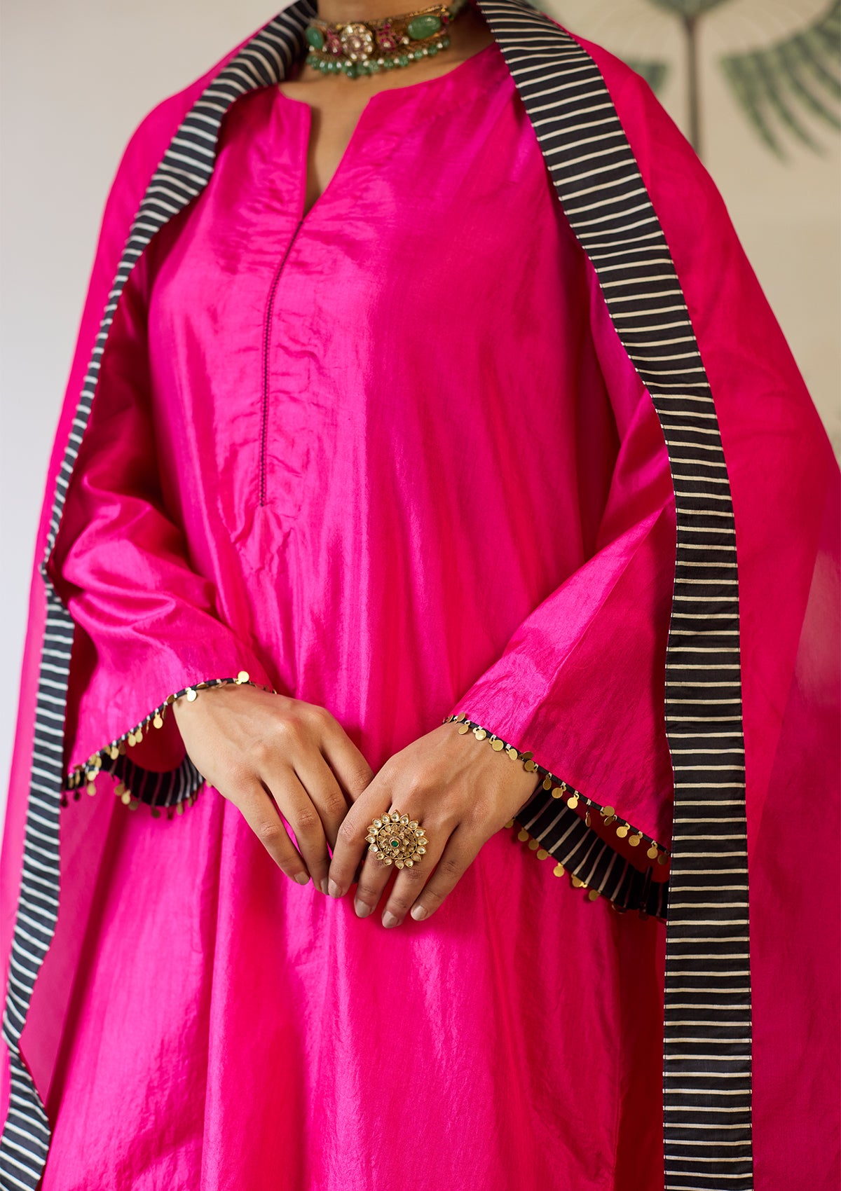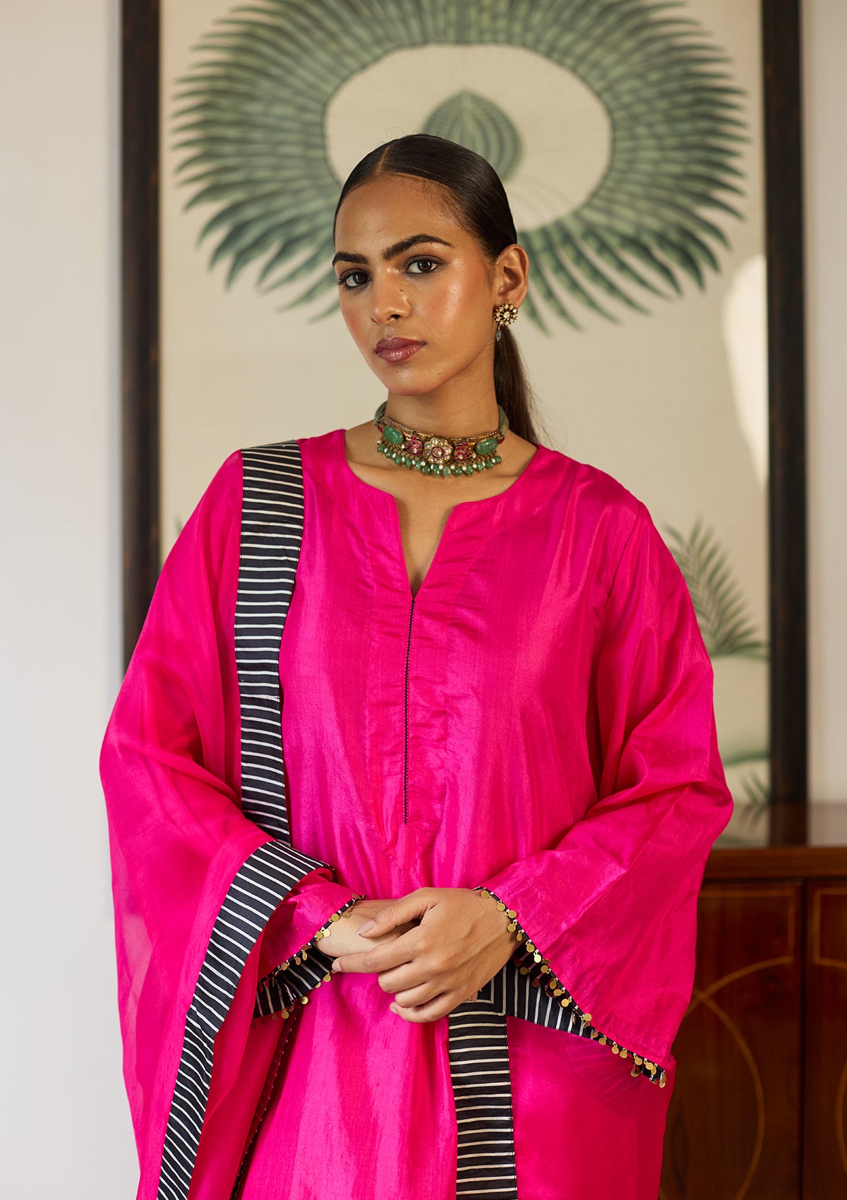 Crafted in soft silk, this fuschia kurta set flows with ease. The voluminous sleeves end in playful tassels, bringing a soft statement to the silhouette. Complete the look with a matching farshi and a flowy dupatta with a contrasting striped border.