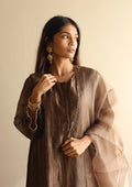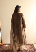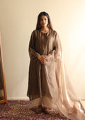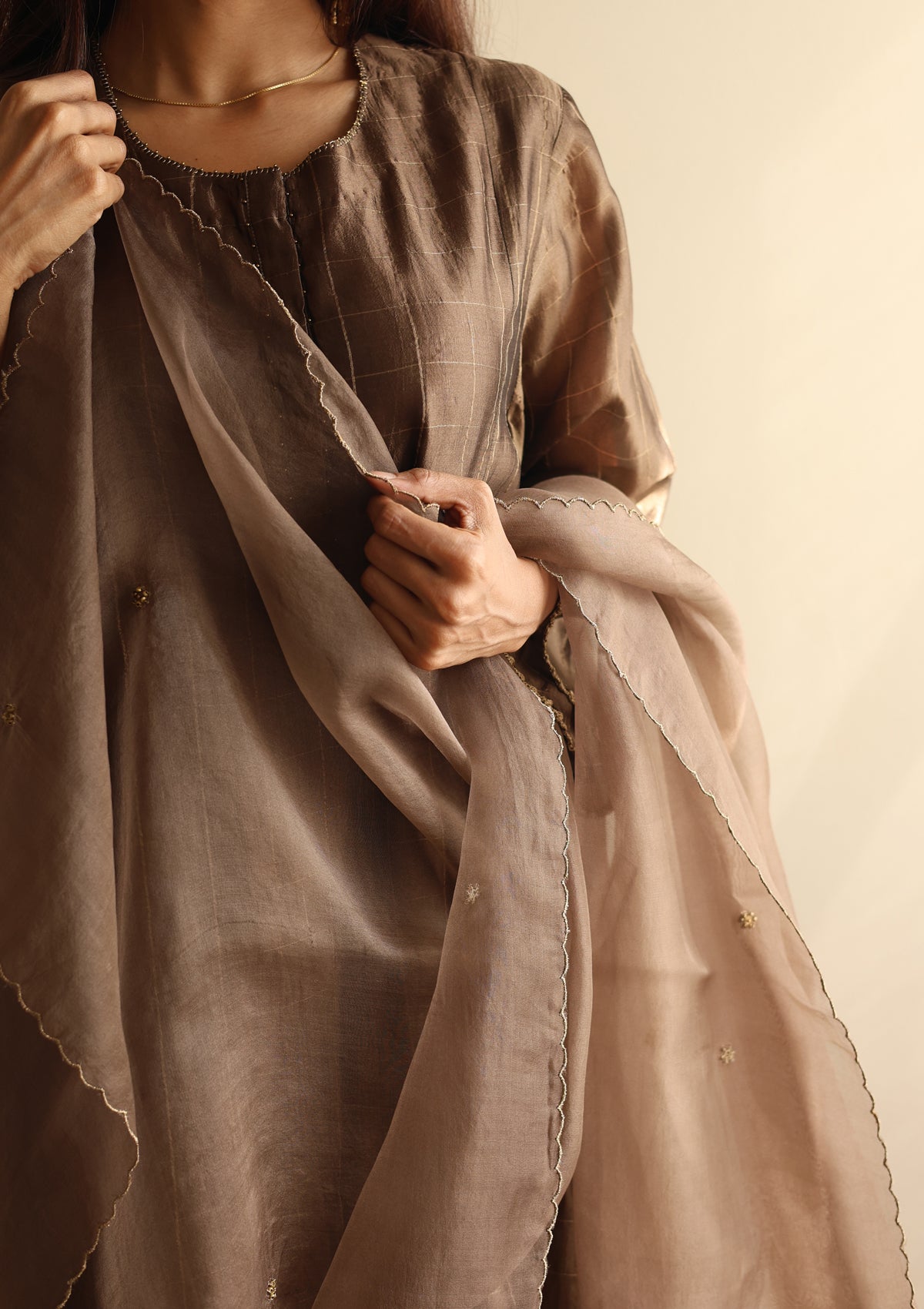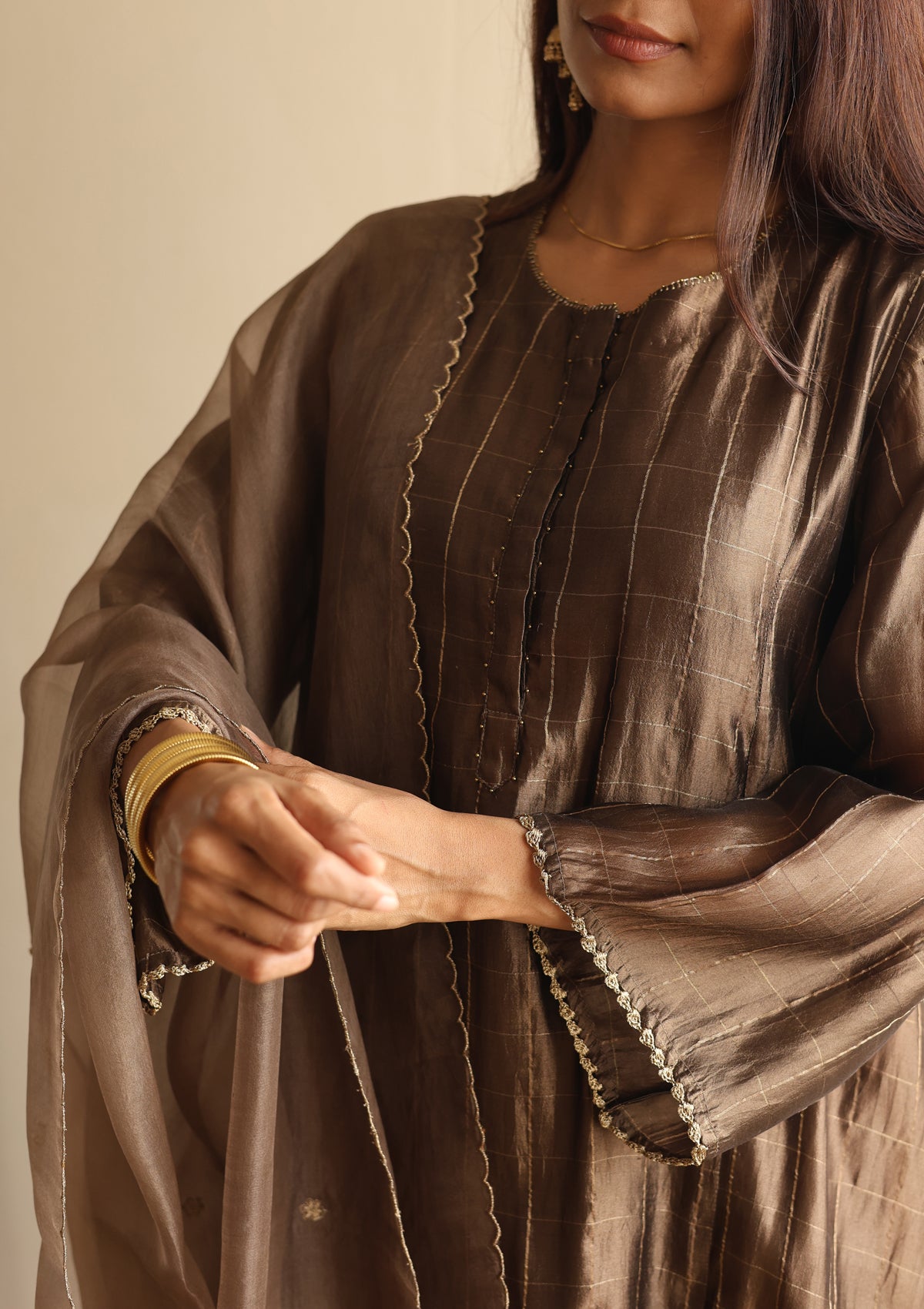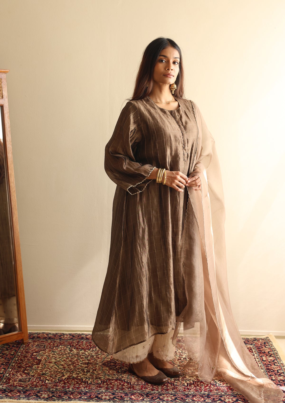 Soft checks meet earthy undertones in a silhouette touched with zari and quiet sheen. The Hazel Checkered Kurta Set features voluminous sleeves finished with zari-detailed cuffs and a buttoned neckline that adds refined structure. It is paired with an ivory zari farshi, detailed with shimmer along the hem and scattered motifs, and a sheer dupatta edged with scallops and adorned with delicate beaded accents — an effortless nod to festive elegance.