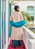 The set is paired with a striped zari farshi and a flowing organza mukaish dupatta. A graceful choice for festive gatherings and quiet celebrations.
