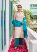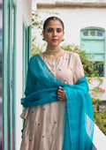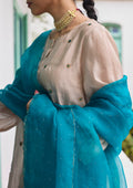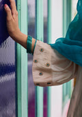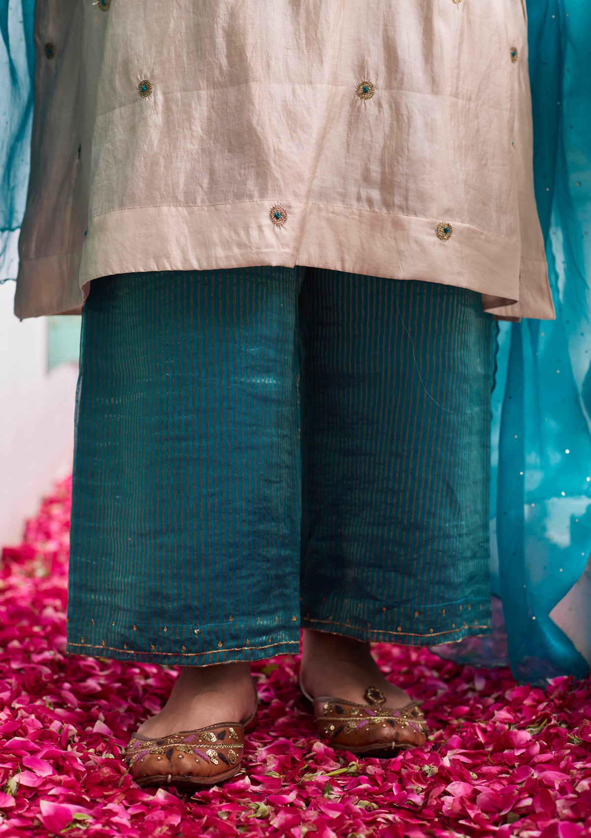 The Ivory and Blue Embroidered Kurta Set is crafted in fine silk, with delicate buta embroidery scattered across the kurta. The voluminous sleeves mirror the embroidery and are finished with zari-trimmed cuffs.