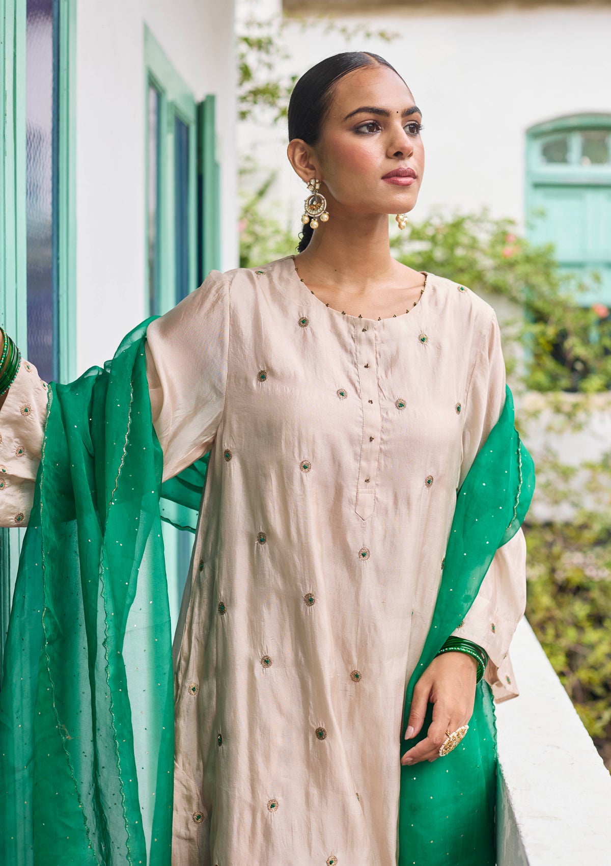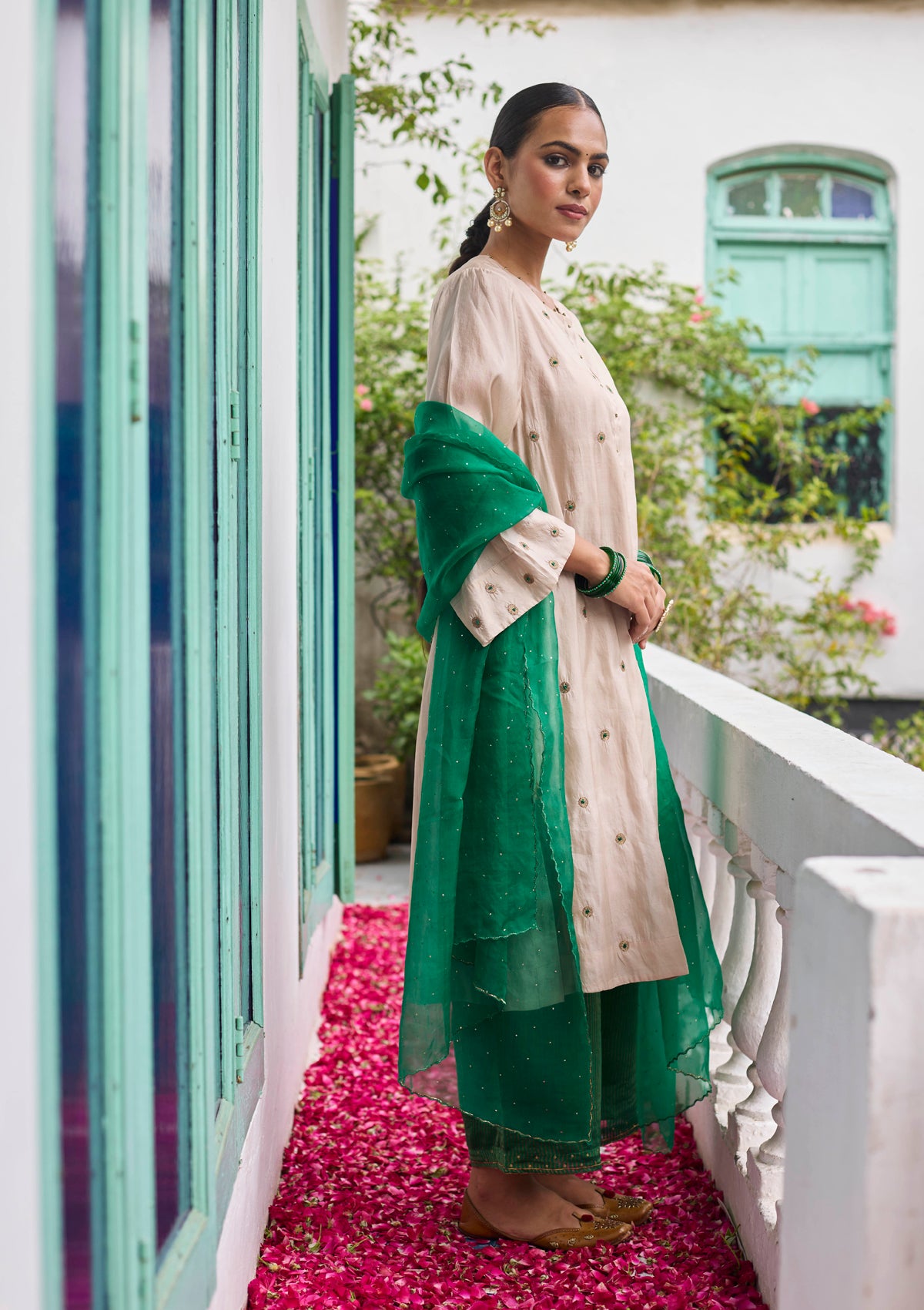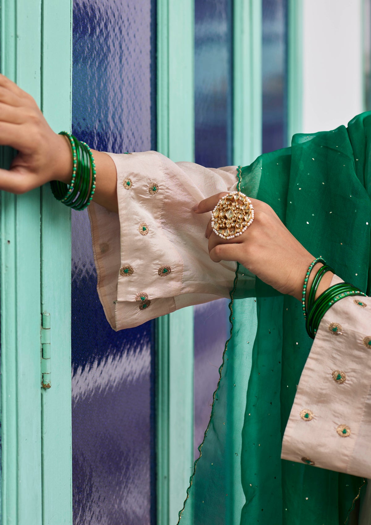 The Ivory and Emerald Embroidered Kurta Set is crafted in fine silk, with delicate buta embroidery scattered across the kurta. The voluminous sleeves mirror the embroidery and are finished with zari-trimmed cuffs.
