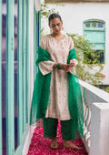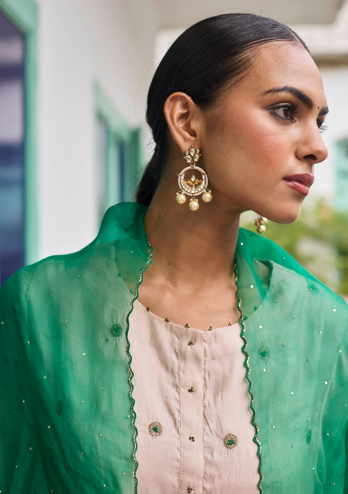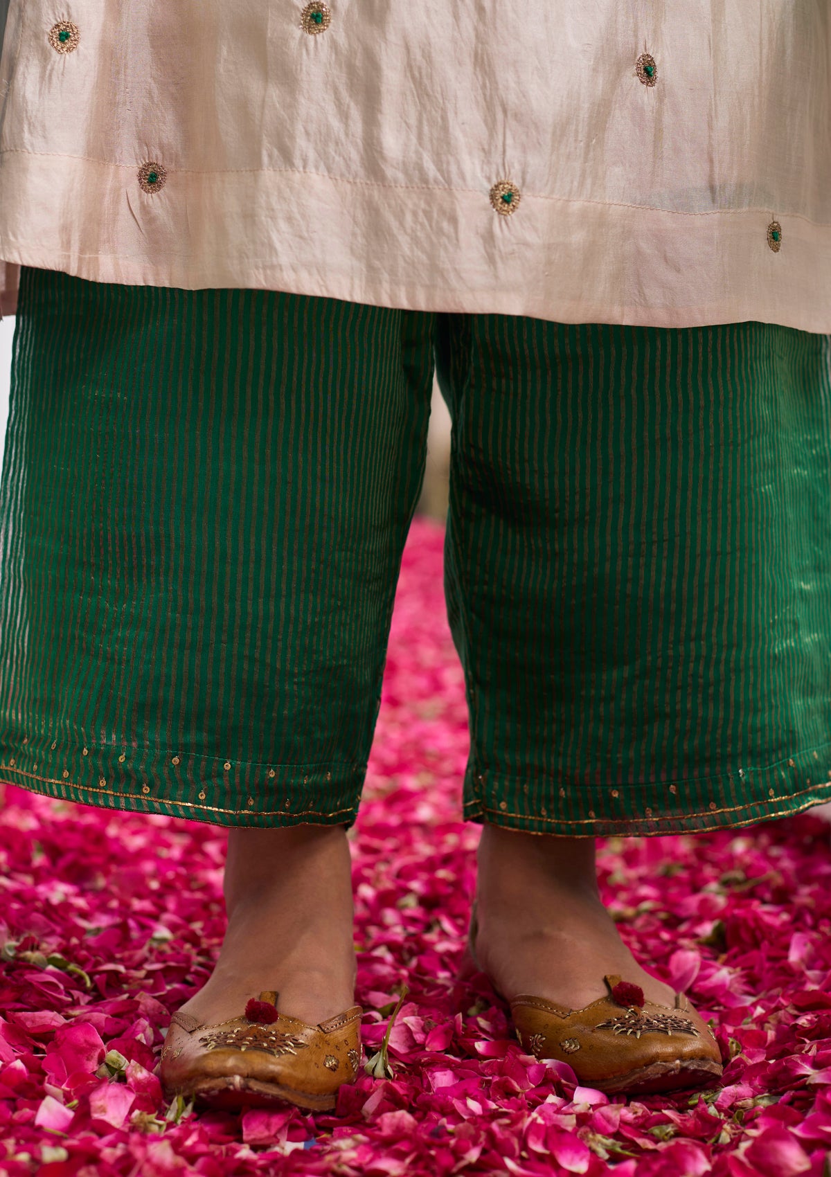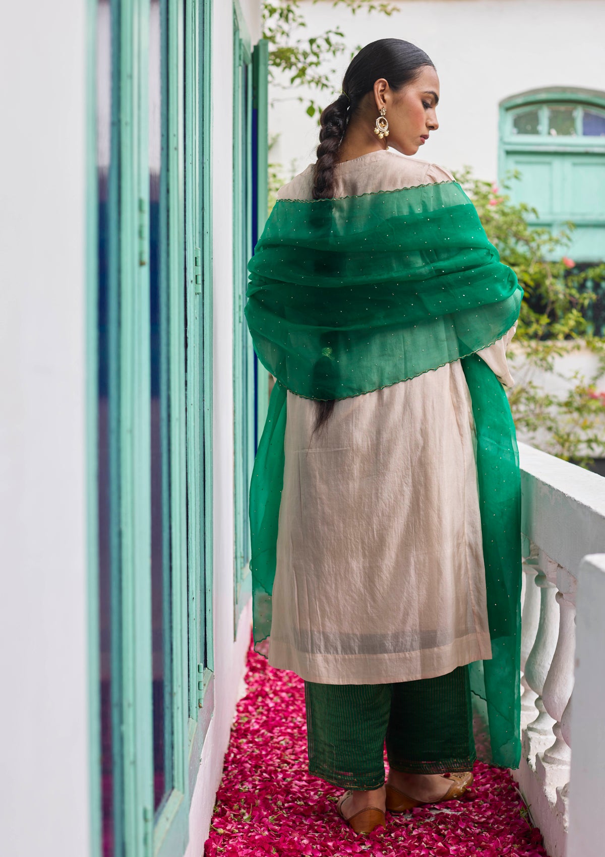 The Ivory and Emerald Embroidered Kurta Set is crafted in fine silk, with delicate buta embroidery scattered across the kurta. The voluminous sleeves mirror the embroidery and are finished with zari-trimmed cuffs.