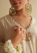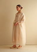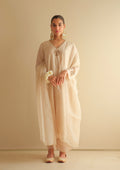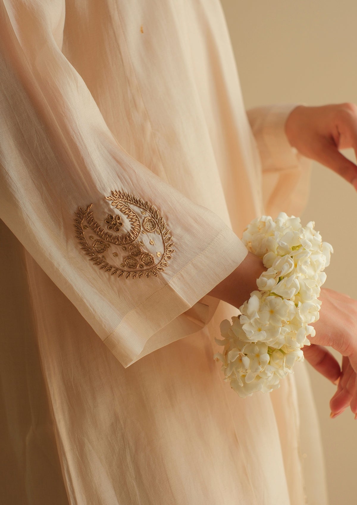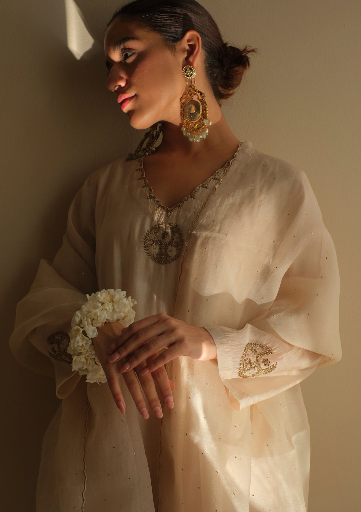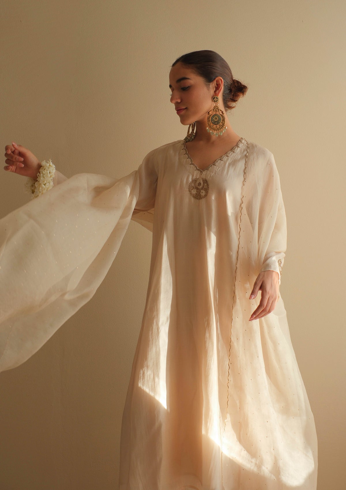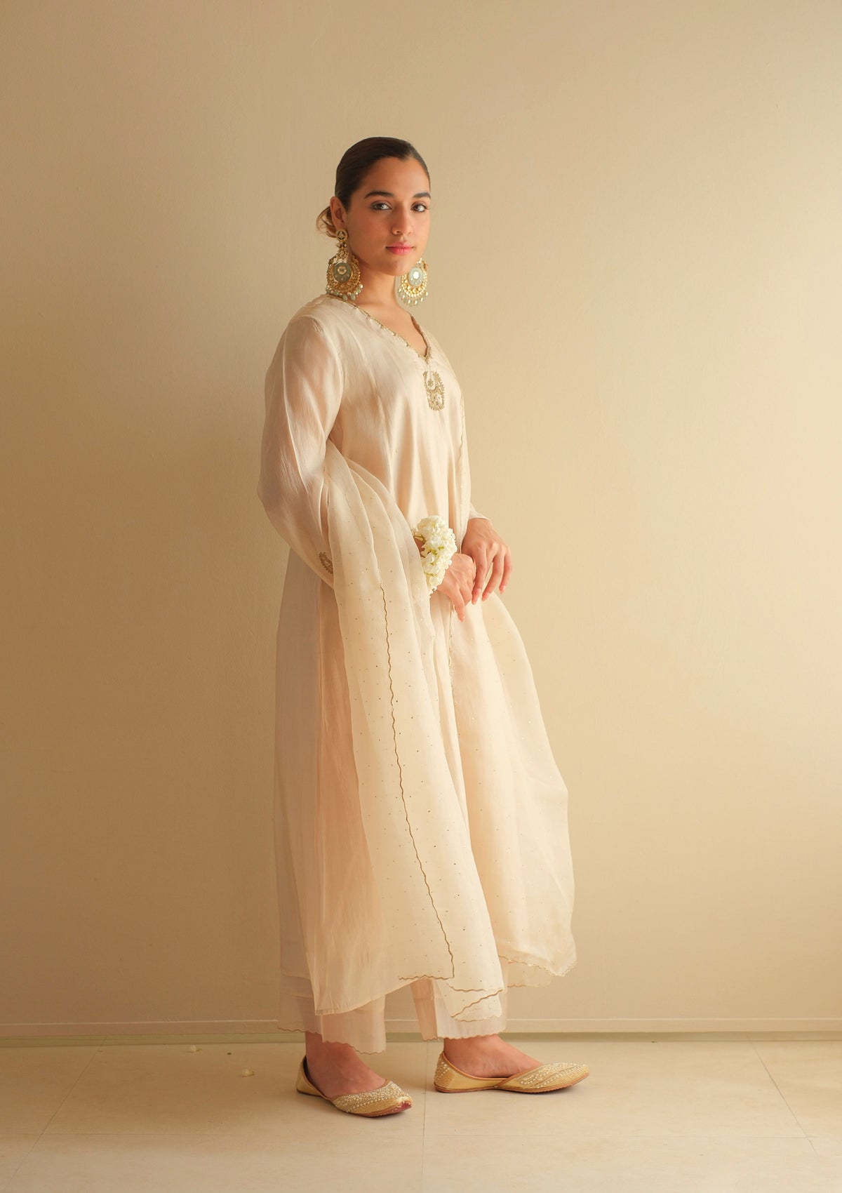 The Ivory Chand Buta Kurta Set showcases elegant Chand motifs in shimmering zardozi along the yoke, with delicate floral accents. It is paired with a coordinating zardozi-embroidered farshi and a soft organza dupatta scattered with mukaish for a graceful finish.