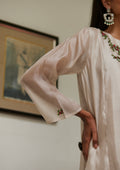 The Ivory kurta in handwoven chanderi features details of delicate sequinned florals on the neck. The kurta is paired with a matching scalloped edged dupatta and farshi detailed with sequin to complete the look.