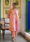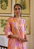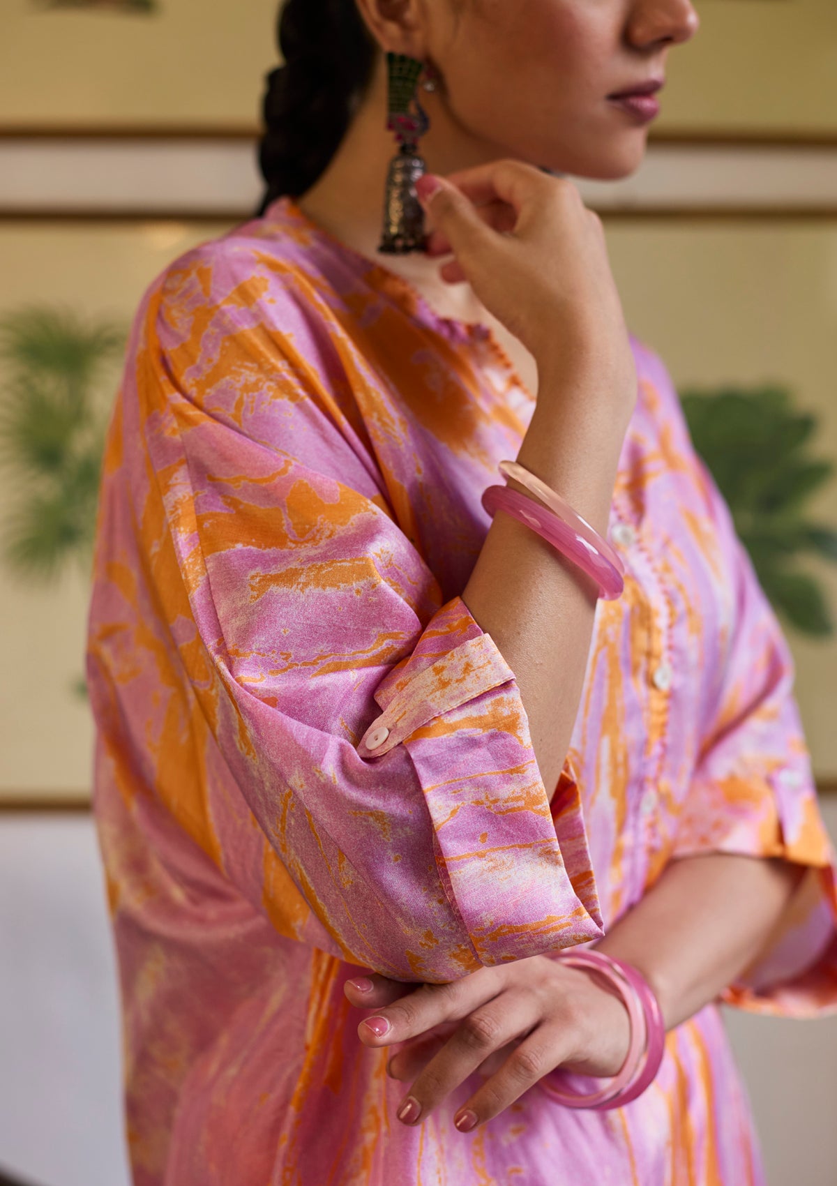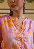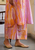 The Lavender Marble Co-ord Set is crafted in airy Silk and brushed with an abstract marble print in shades of lavendar and orange. Featuring a buttoned neckline, roll-up sleeves, and side pockets, it falls in a relaxed silhouette. Paired with a matching farshi, it’s a vibrant choice for festive mornings or slow afternoons.
