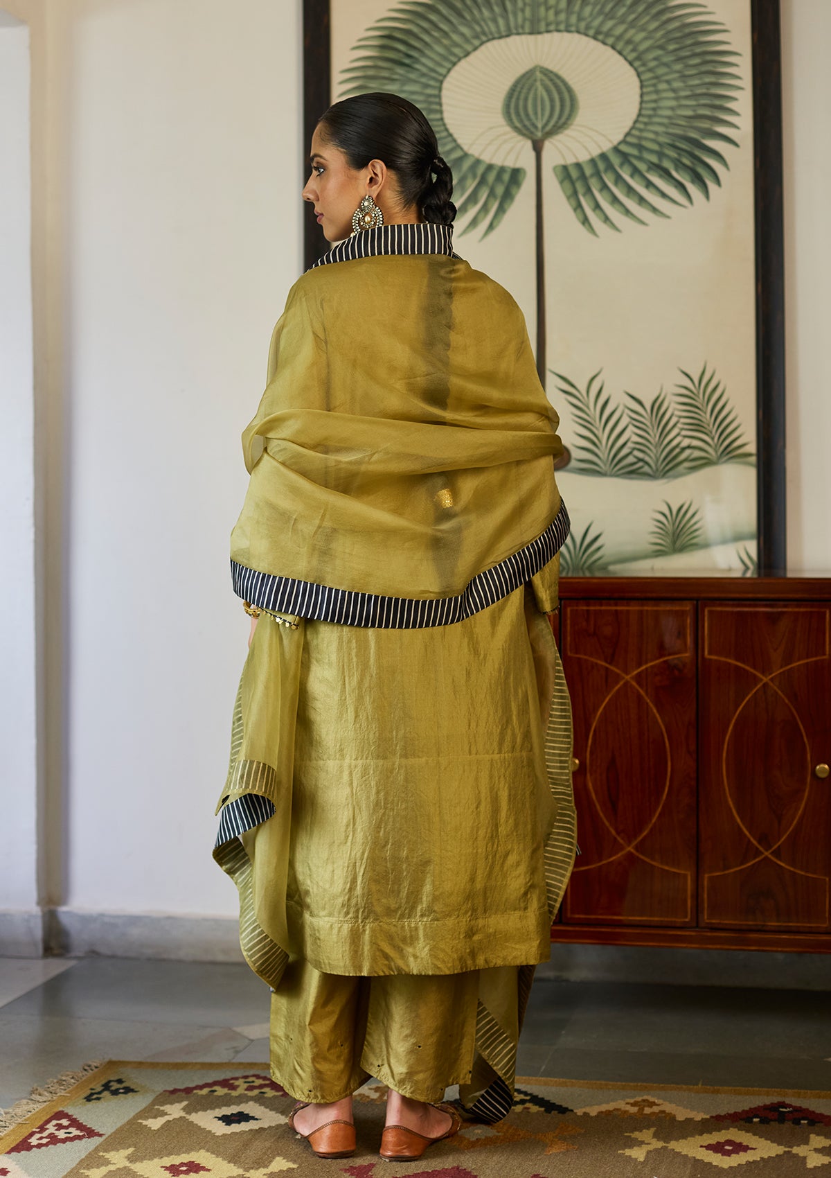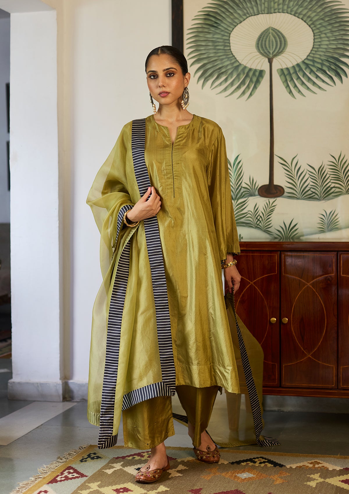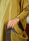 Crafted in soft silk, this green kurta set flows with ease. The voluminous sleeves end in playful tassels, bringing a soft statement to the silhouette. Complete the look with a matching farshi and a flowy dupatta with a contrasting striped border.
