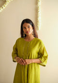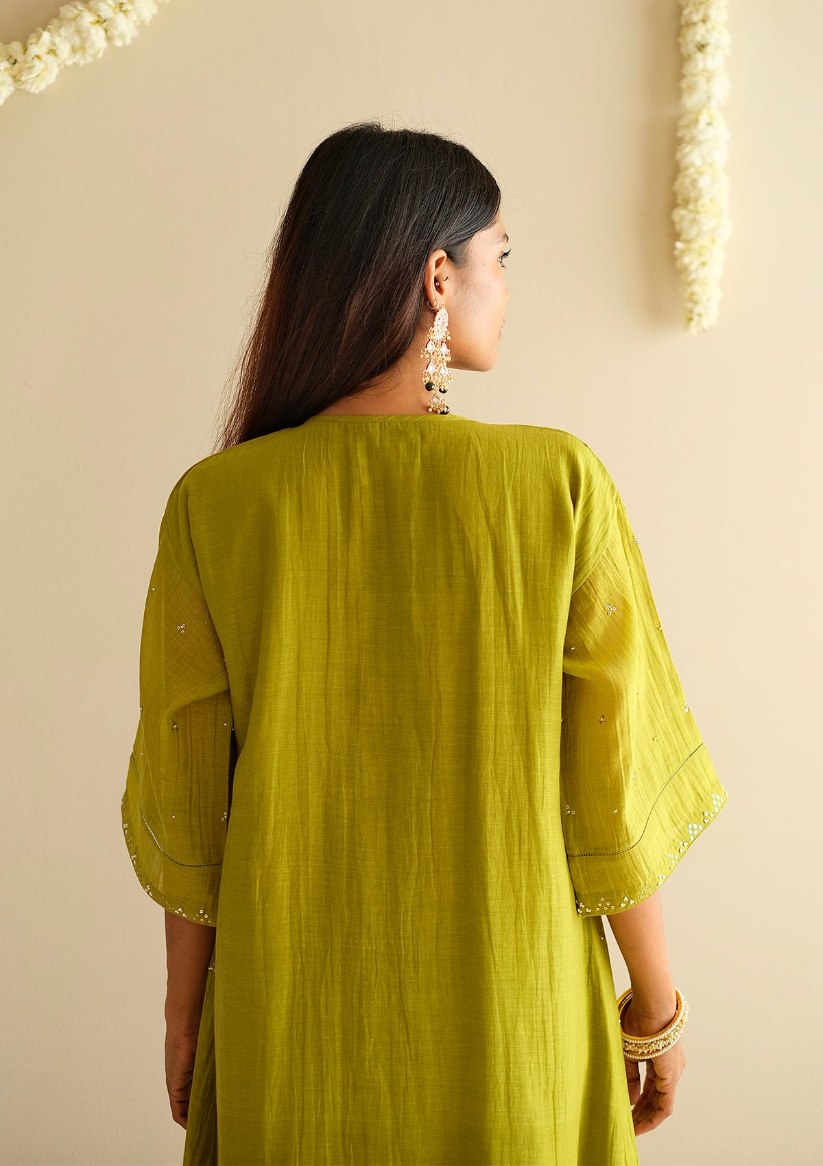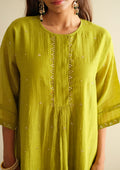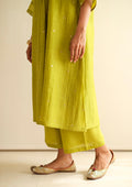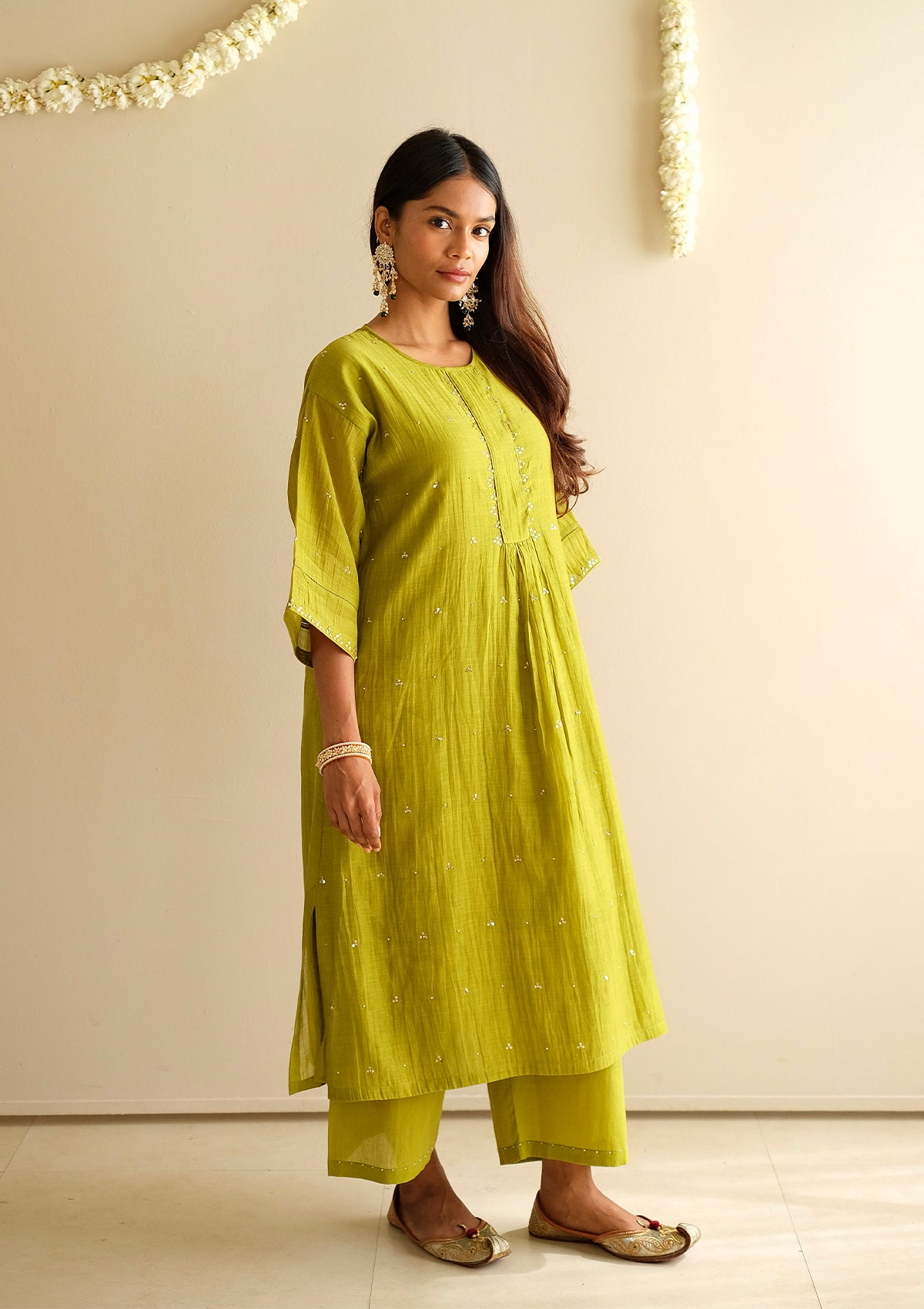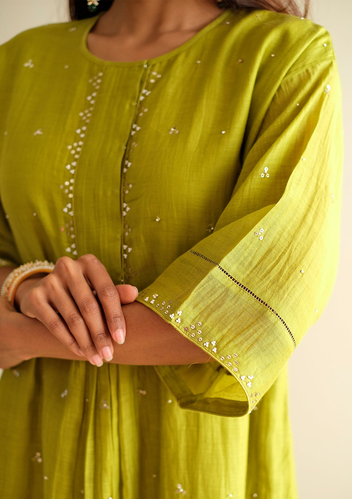 Crafted in chanderi, the Lime Green Sequin Co-ord Set features subtle sequin detailing along the neckline, with delicate scattered embellishments across the front of the kurta. Soft gathers at the front add gentle movement, while voluminous sleeves are further adorned with sequins, lending a soft hint of shimmer. It is paired with a matching farshi to complete the look with effortless elegance.