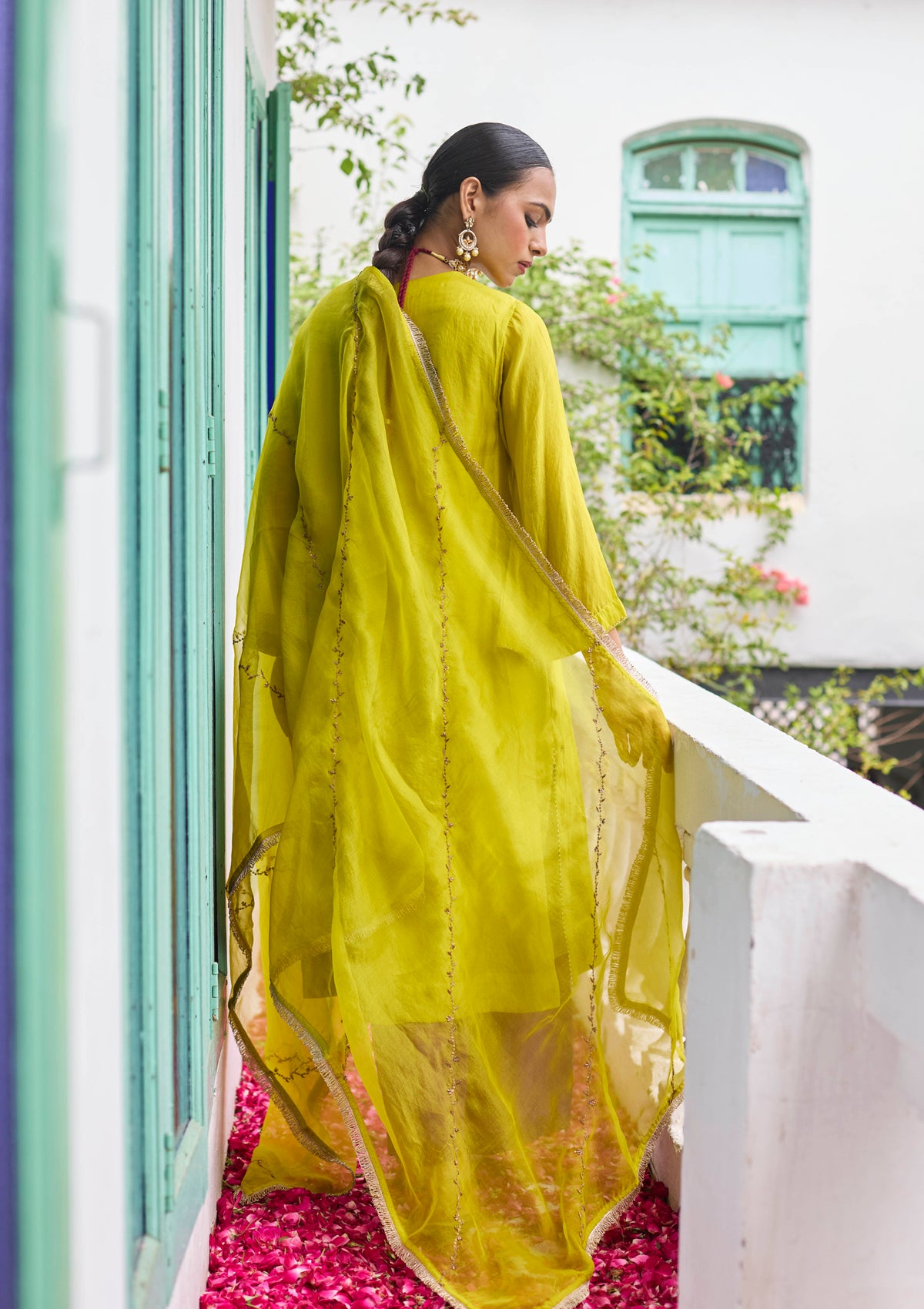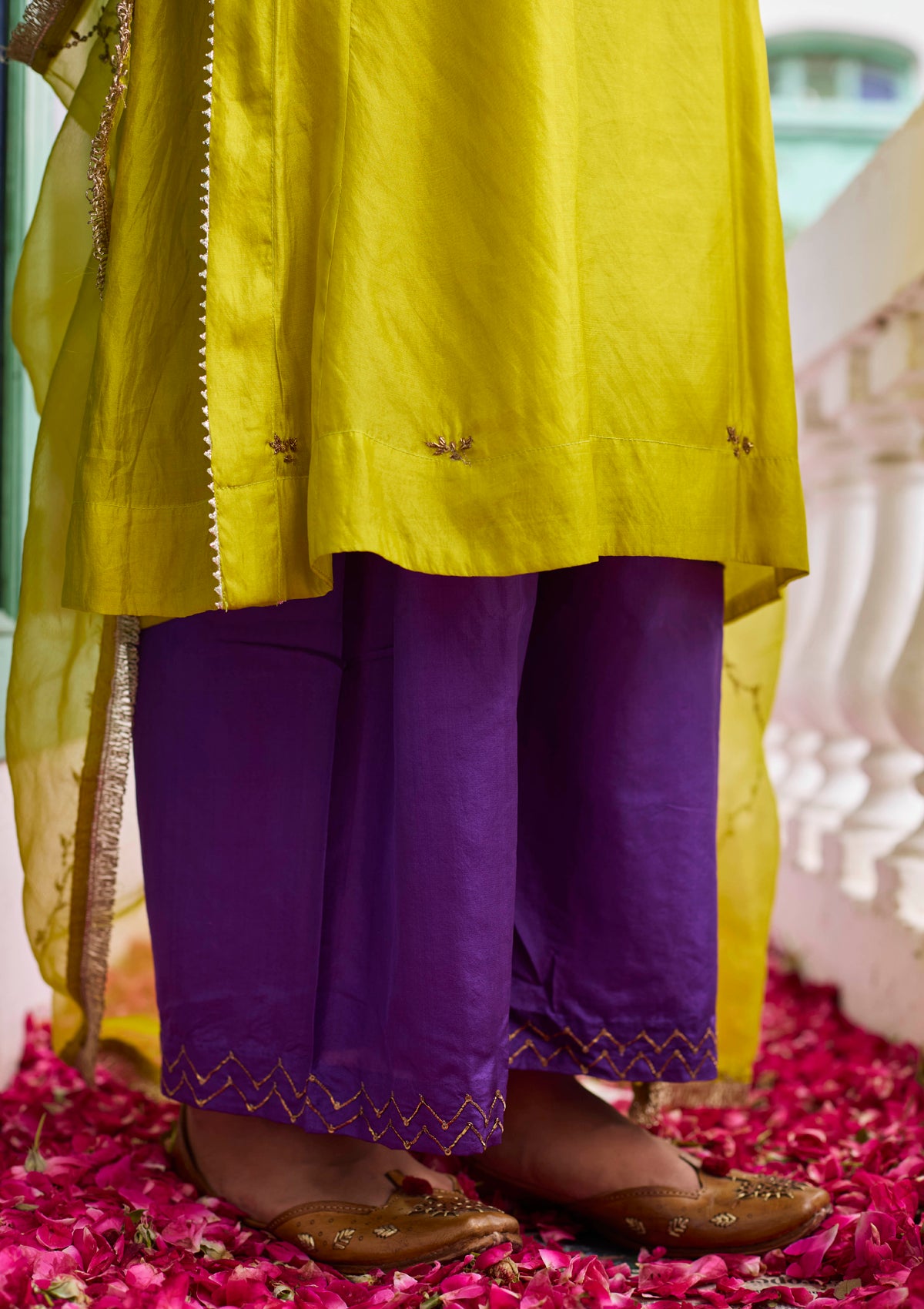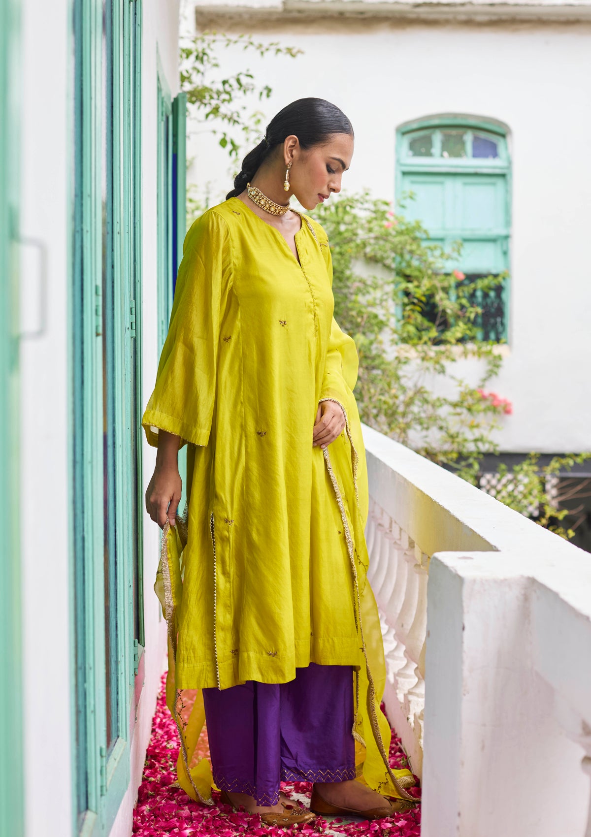 Crafted in fine silk, the Lime Zardozi Embroidered Kurta Set features delicate zardozi embroidered bootis on the kurta. Designed with a relaxed silhouette, the kurta is paired with contrasting purple farshi, finished with subtle embroidery along the hem. The look is completed with a sheer organza dupatta, adorned with zari embroidery and edged with intricate handwork that adds a touch of shimmer.