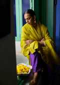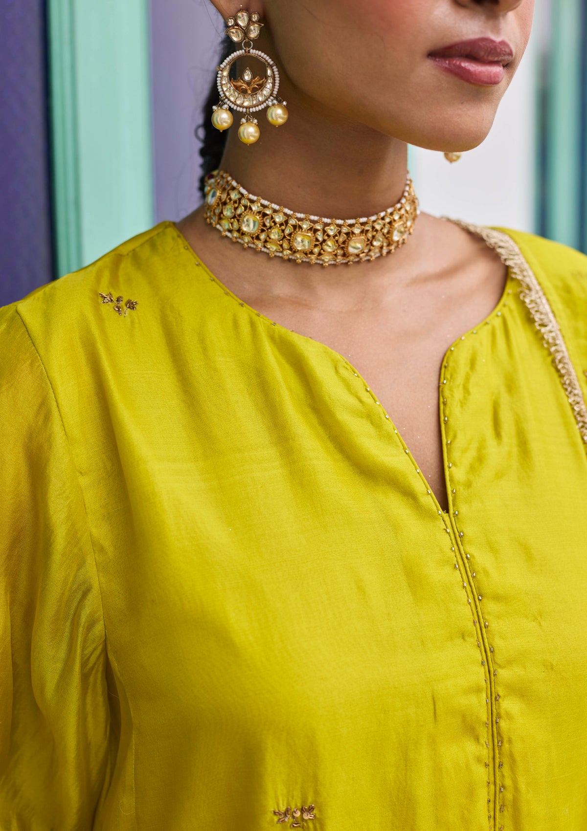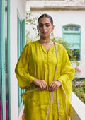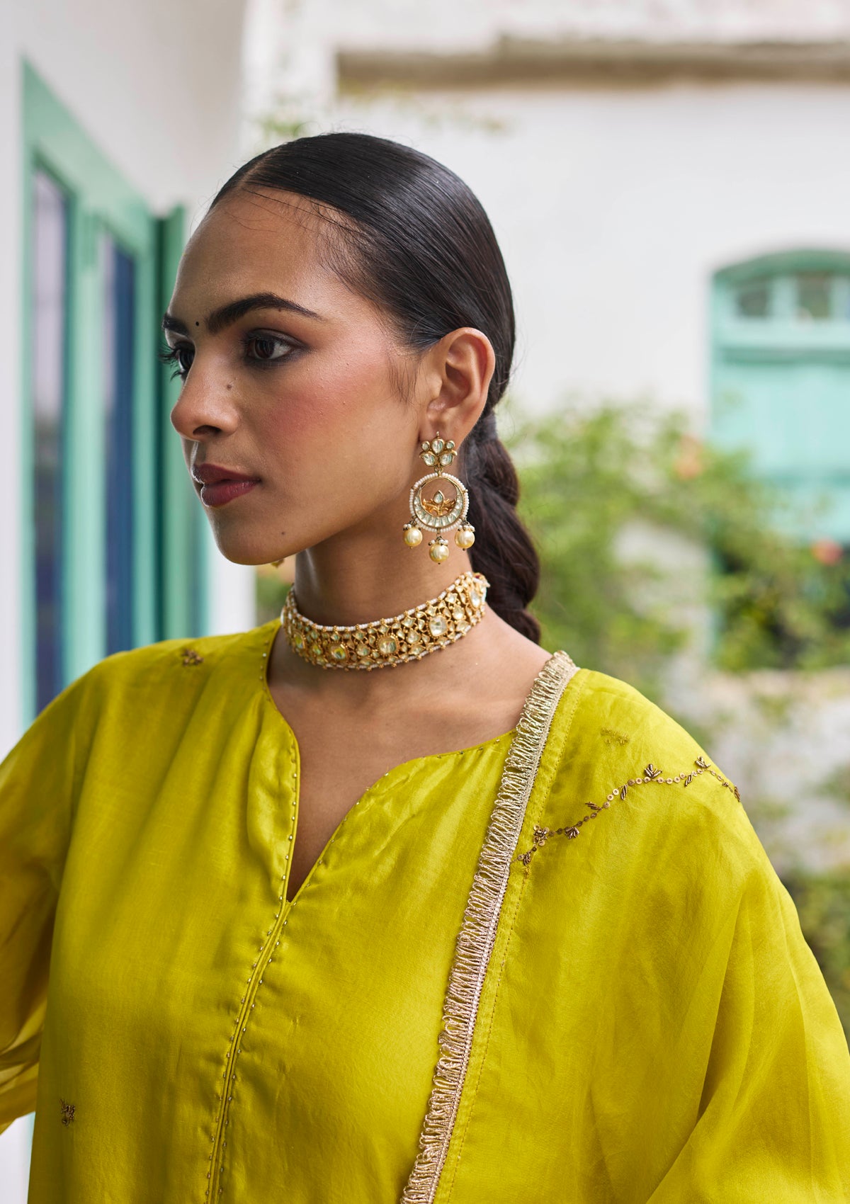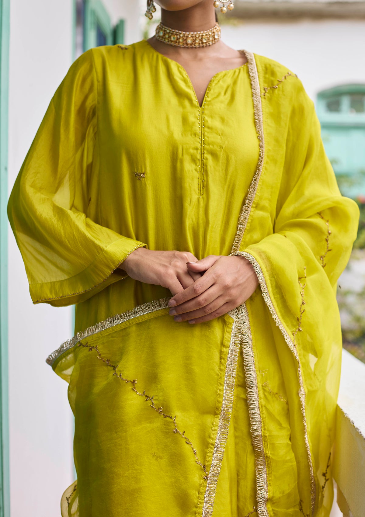 Crafted in fine silk, the Lime Zardozi Embroidered Kurta Set features delicate zardozi embroidered bootis on the kurta. Designed with a relaxed silhouette, the kurta is paired with contrasting purple farshi, finished with subtle embroidery along the hem. The look is completed with a sheer organza dupatta, adorned with zari embroidery and edged with intricate handwork that adds a touch of shimmer.