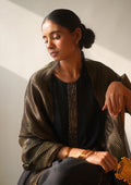 The midnight black kurta handcrafted in fine chanderi features delicate details in gold zari on the yoke and along the kurta. Its breezy silhouettes and easy fit makes this a day to evening classic for your wardrobe. It is paired with a zari striped organza dupatta and a matching farshi to complete the look.