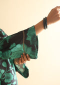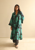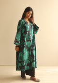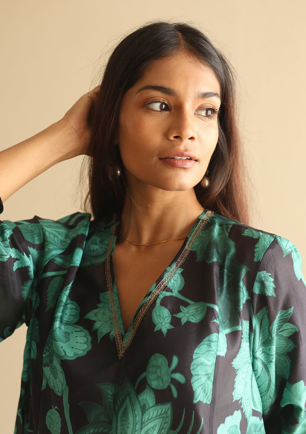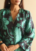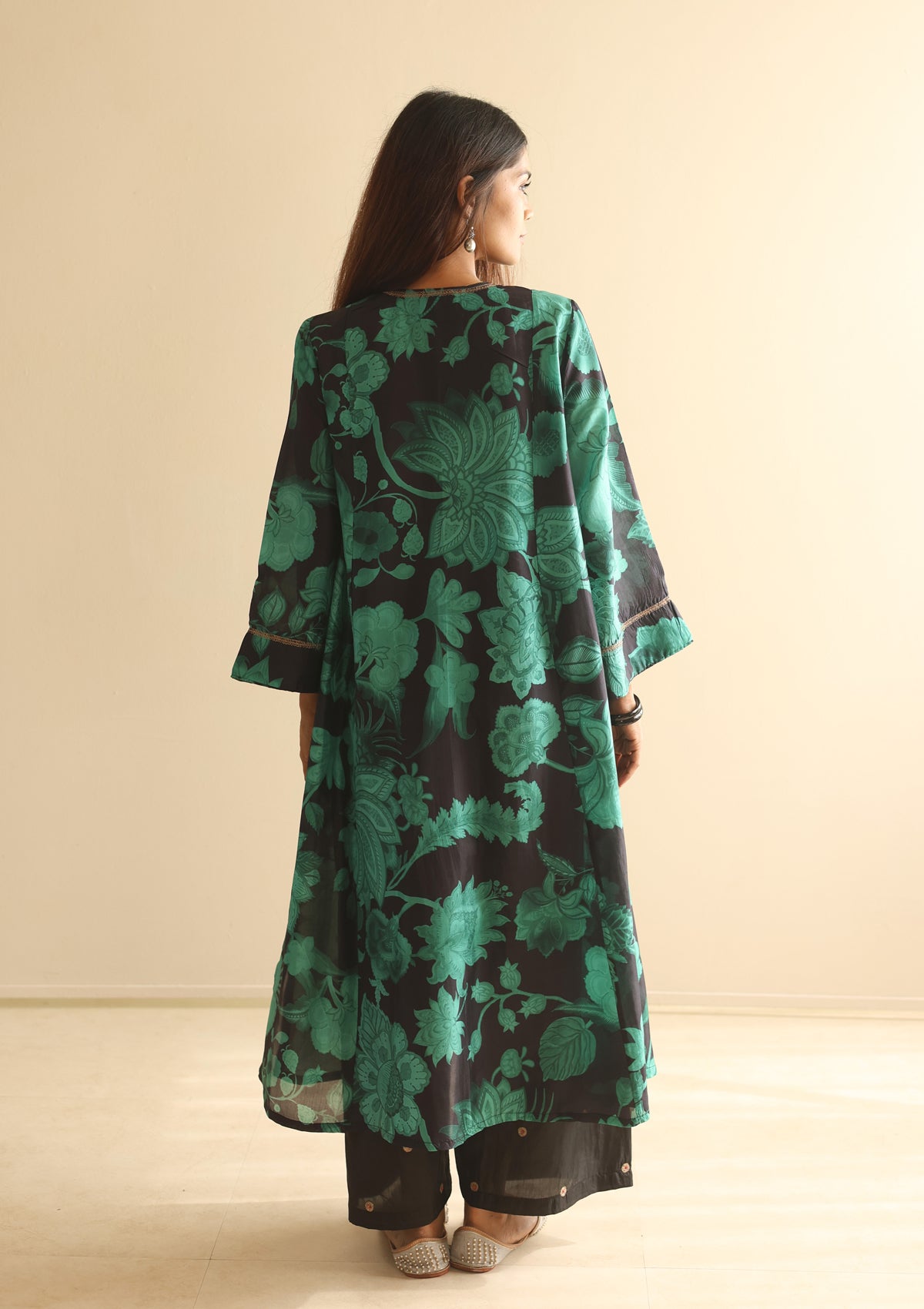 Tailored in luxurious silk, the Midnight Black and Teal Bloom Co-ord Set captures the allure of twilight tones with blooms scattered across its surface. The kurta features fine zari embroidery around the neckline and softly gathered sleeves, lending it a refined, fluid charm. IIt is paired with midnight black embroidered farshi pants, handcrafted in silk with circular zari motifs — an ensemble that balances richness with ease, ideal for festive and evening occasions.