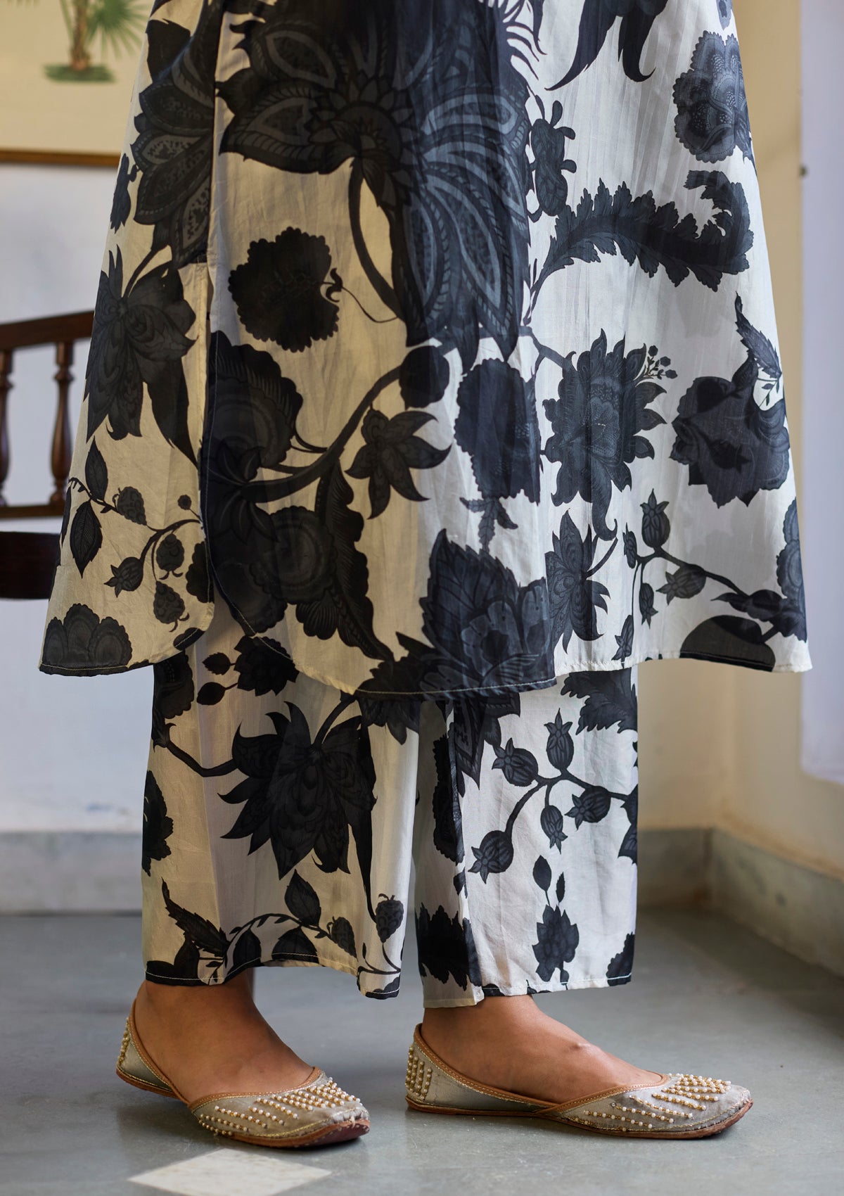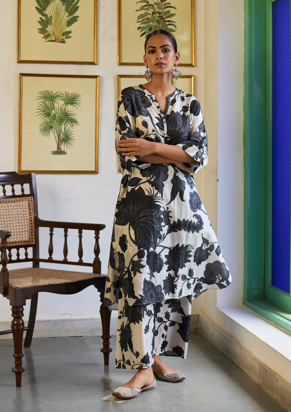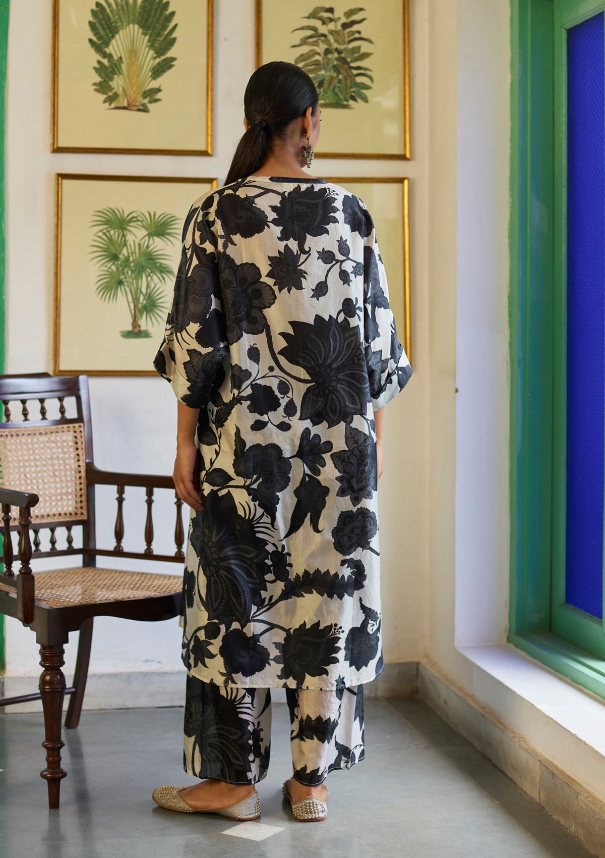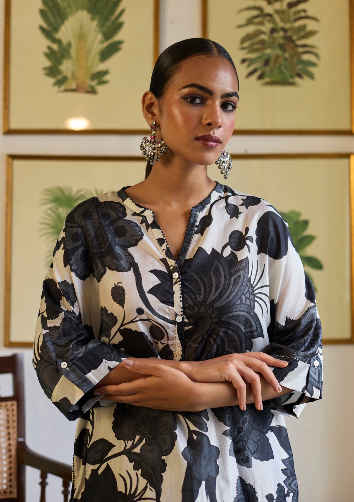 The Midnight Black Bloom Co-ord Set, crafted in fine silk is scattered with bold florals all across. Designed with a button-down front and handy pockets, it comes in a relaxed fit that moves with you. Paired with a matching farshi, it’s an effortless pick for everyday wear or quieter celebrations.