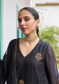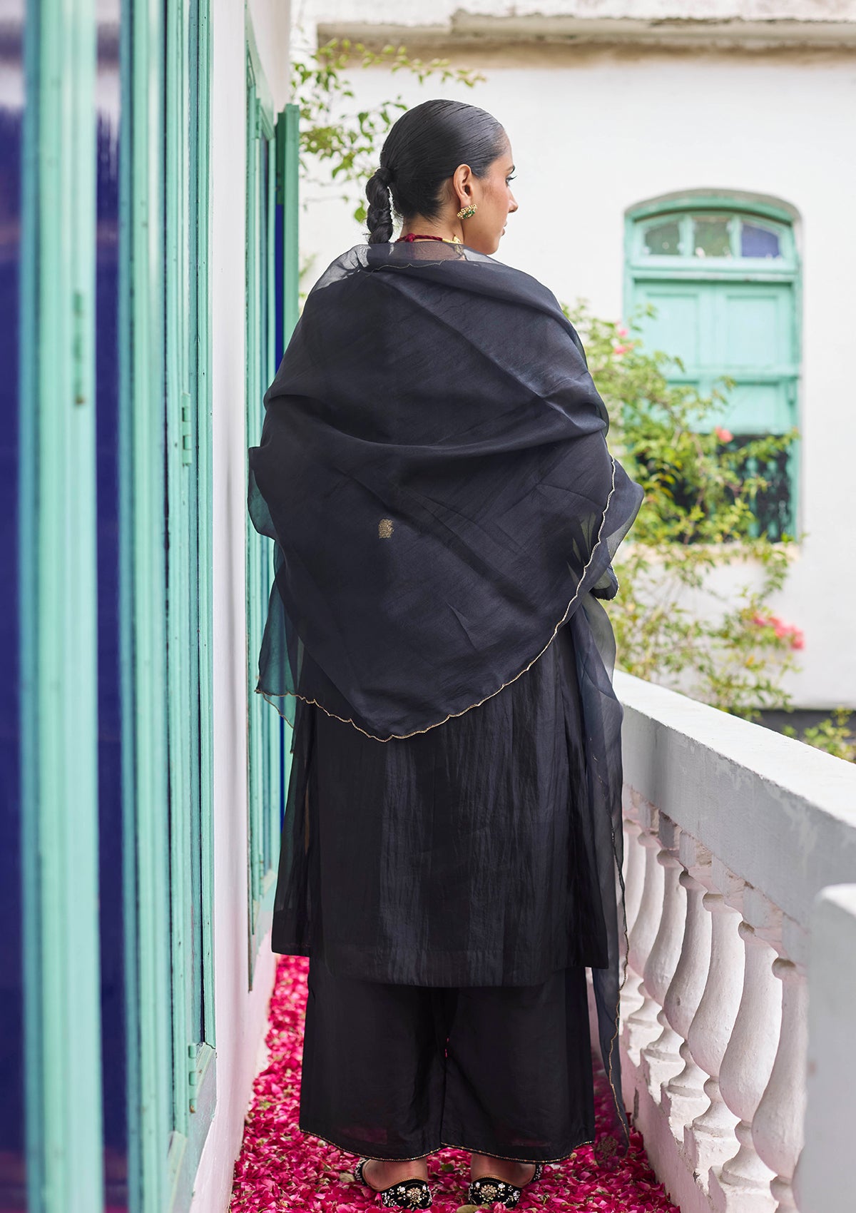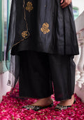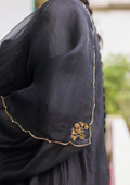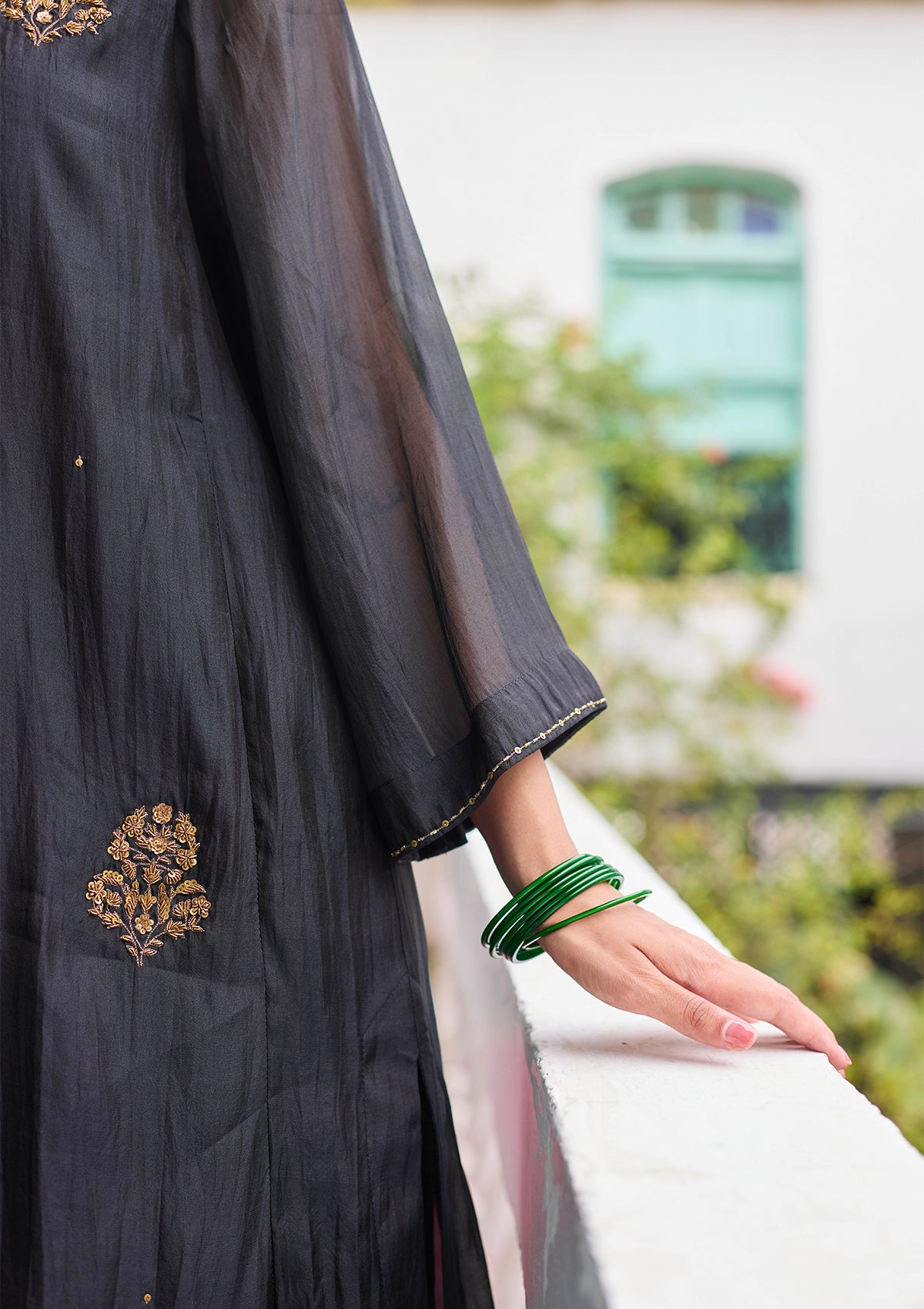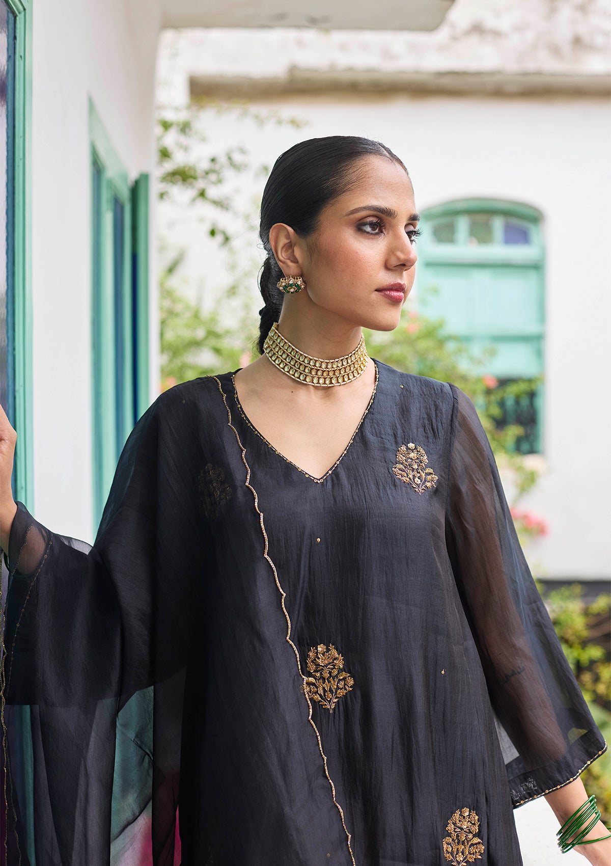The Midnight Black Buta Kurta Set showcases intricate floral zardozi embroidery along with delicate detailing scattered across the kurta. The voluminous sleeves mirror the embroidery, finished with zari-accented cuffs.