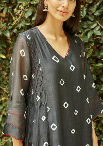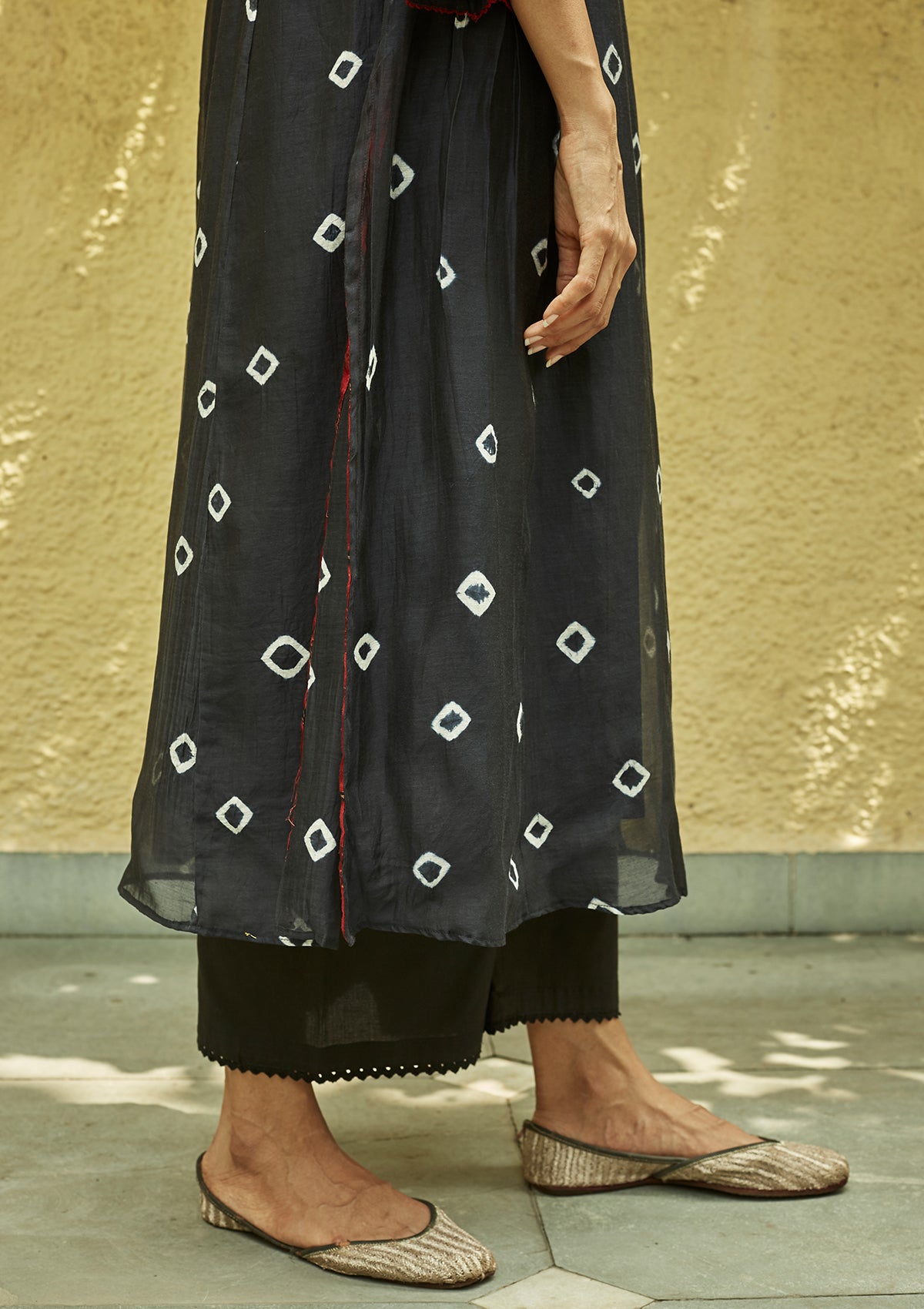 The traditional technique of tie and dye in a contemporary silhouette with our midnight black handwoven chanderi kurta. Smocking and french knot details along the sides give a flattering silhouette to this breezy kurta. Complete the look with our matching farshi in soft cotton and a contrasting burgundy stole.