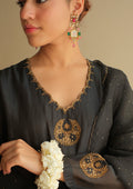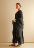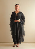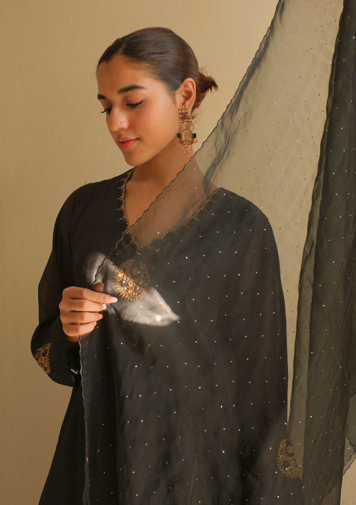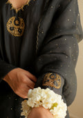 Adorned with luminous zardozi Chand motifs across the yoke and a gentle scatter of florals, the Midnight Chand Buta Kurta Set comes with a matching zardozi-embroidered farshi and an organza dupatta finished with delicate mukaish for a complete festive look.