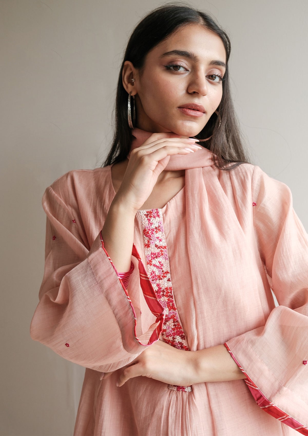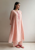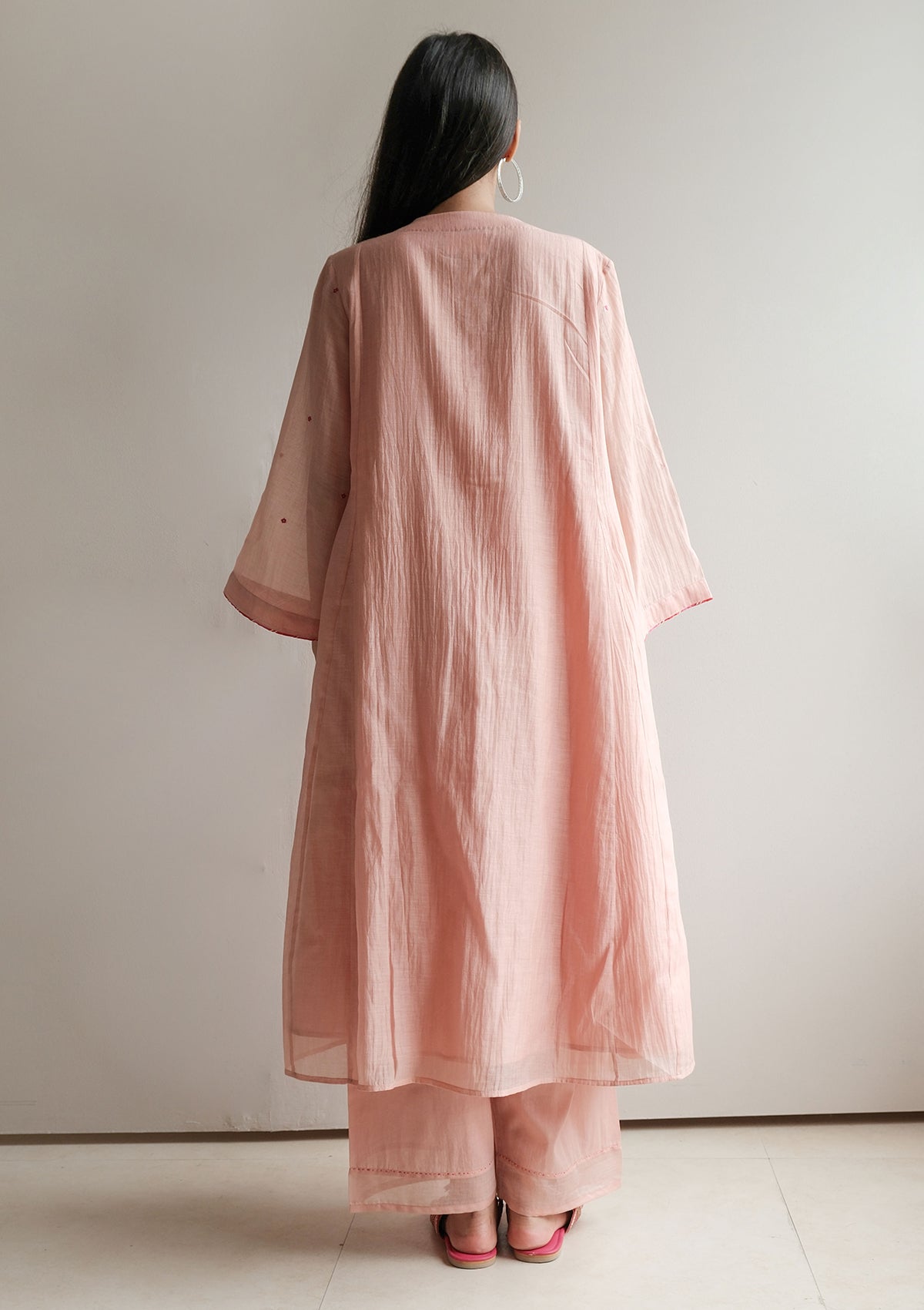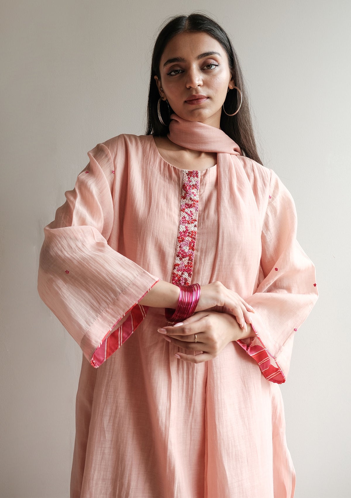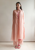 Our Peach Beaded Kurta Set is crafted in handwoven chanderi and features delicate beadwork along the yoke and sleeves. With its easy, breezy silhouette, it’s perfect for effortless everyday dressing. Paired with matching farshi pants and a stole to complete the look.