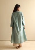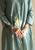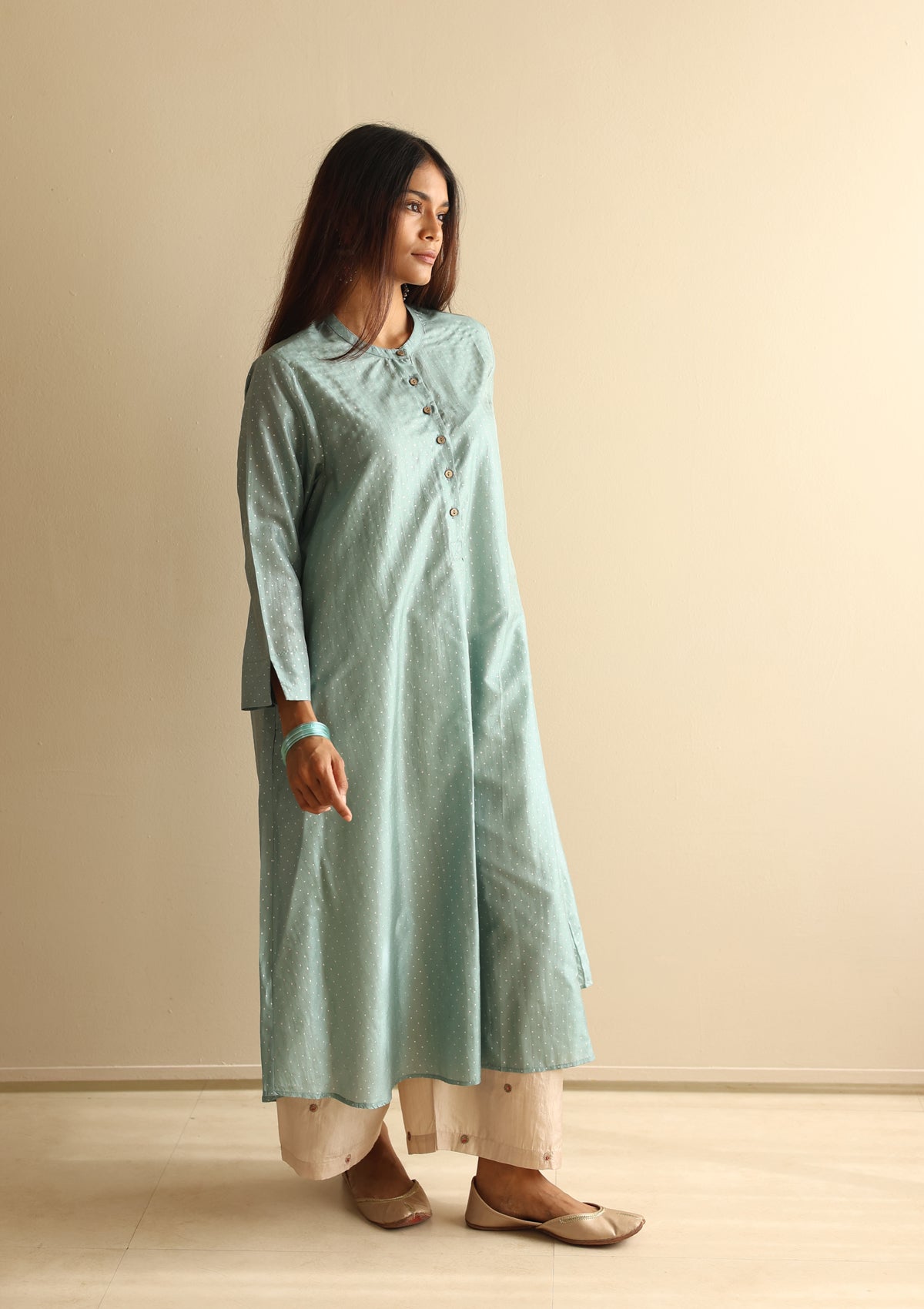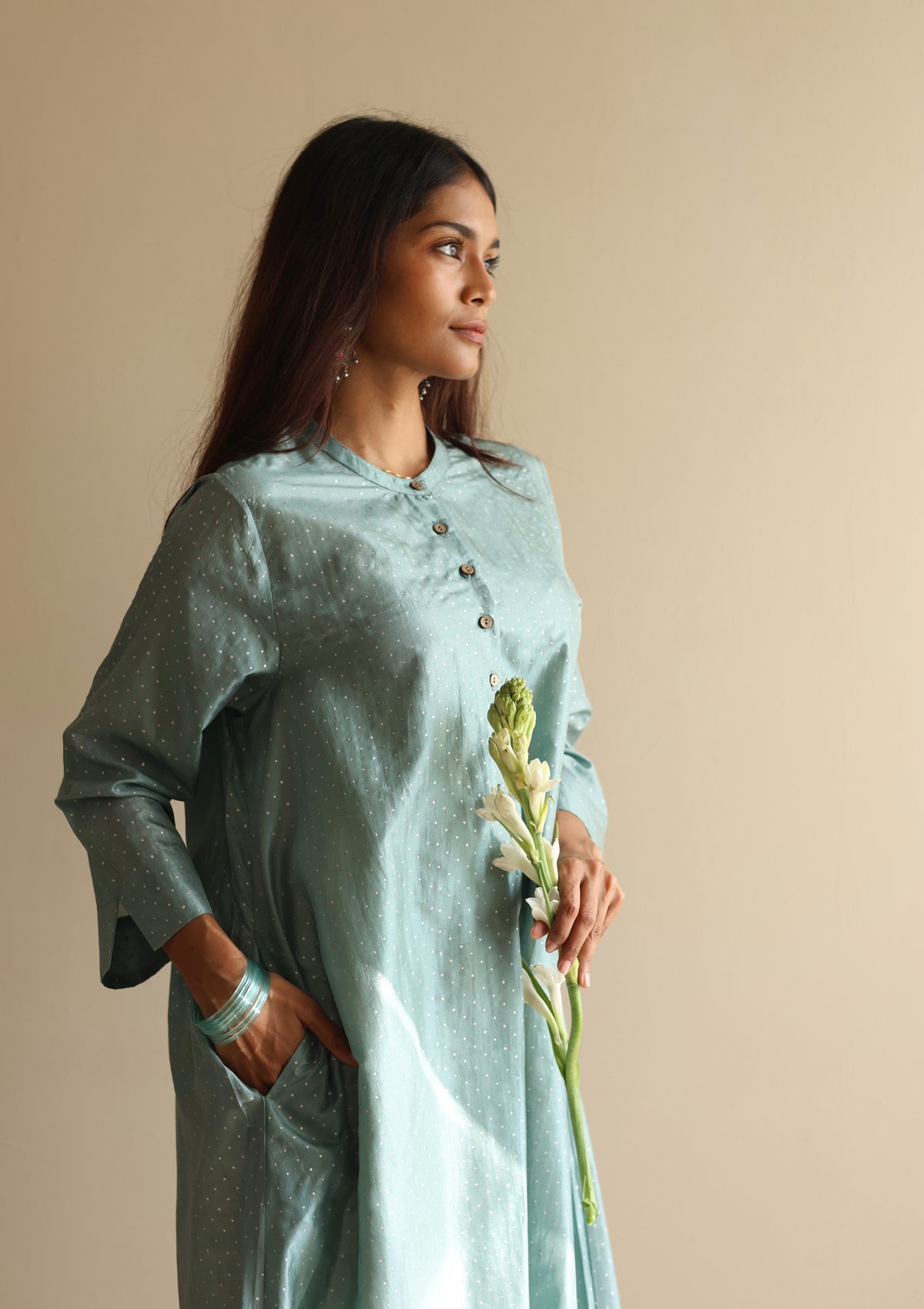 In soft silk and a serene hue, the Powder Blue Hand Blockprint Kurta brings together calm elegance and everyday ease. Hand blockprinted gold dots add a gentle shimmer, while the buttoned neckline, slit sleeves, and pockets lend comfort and movement.