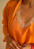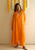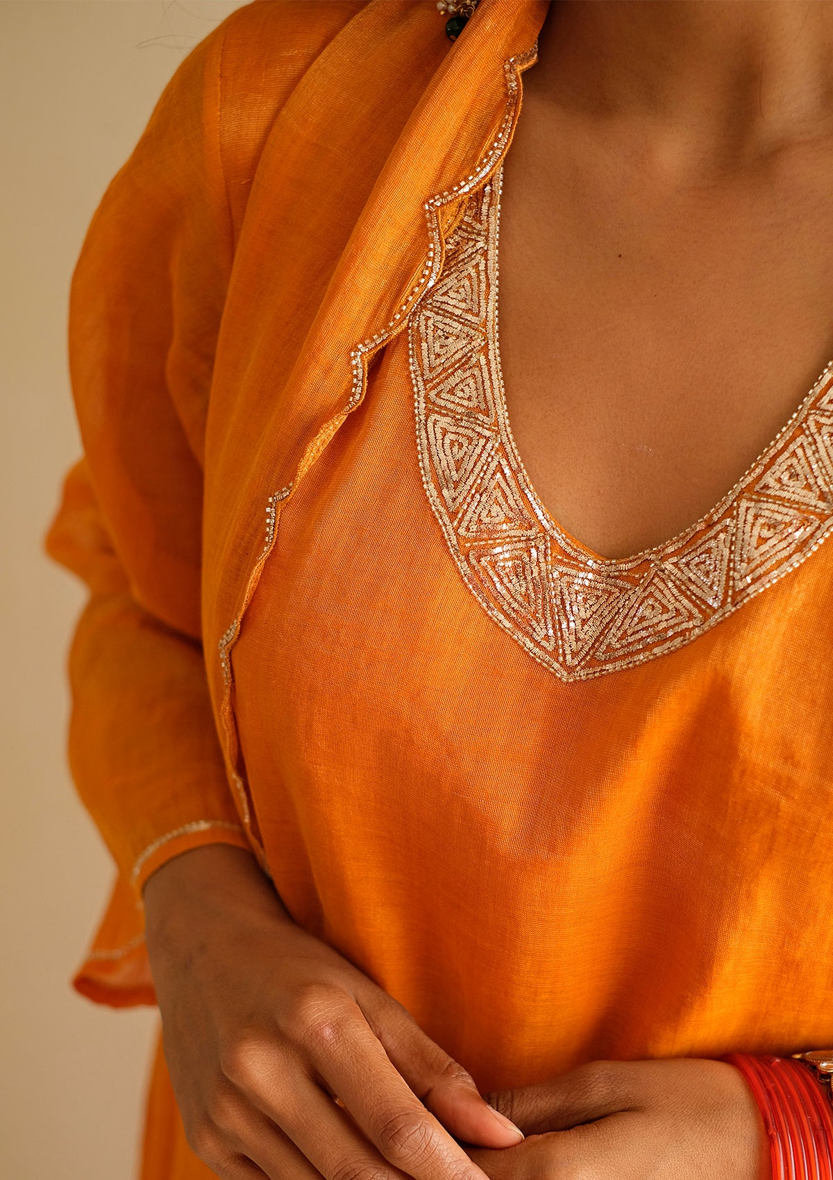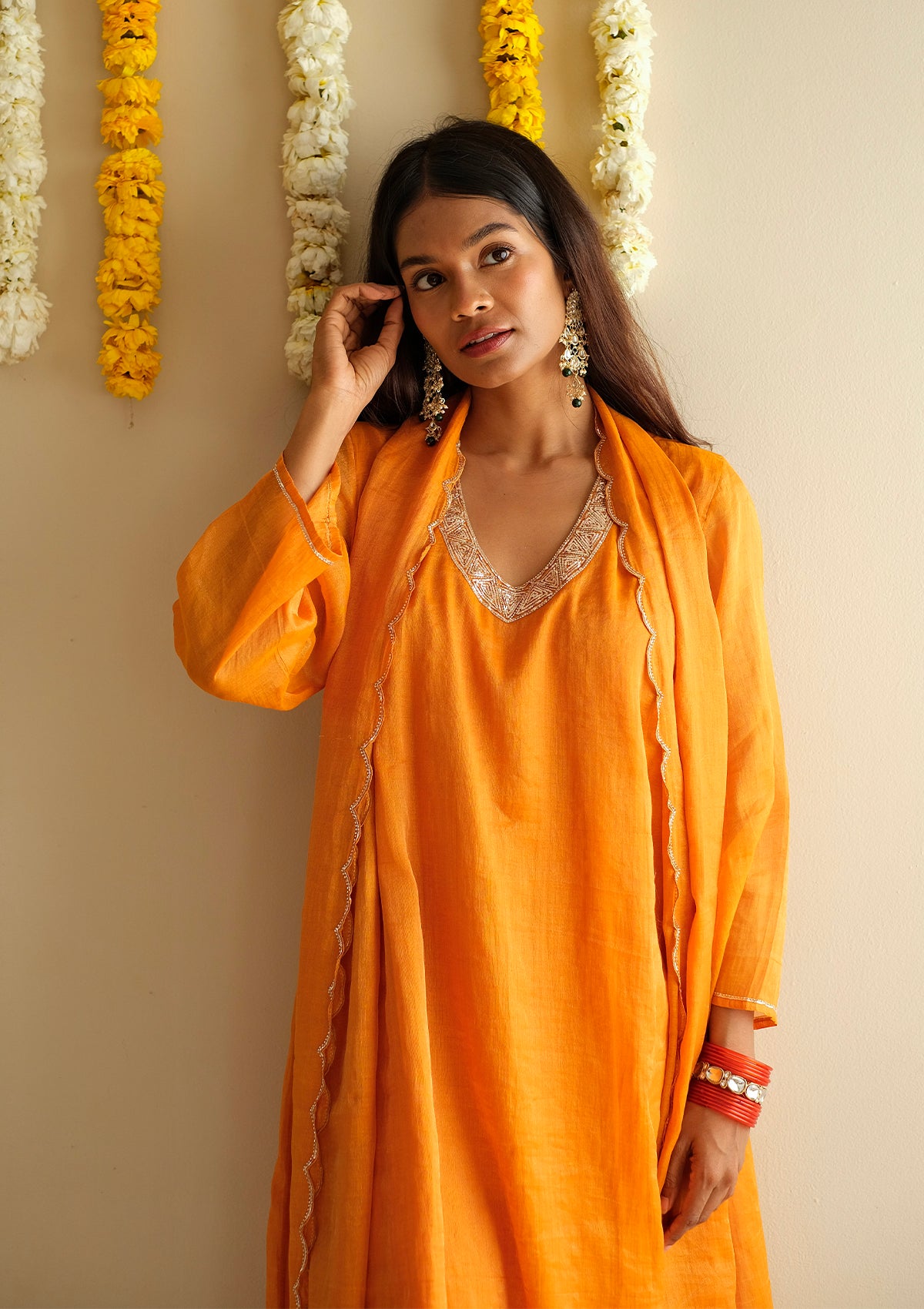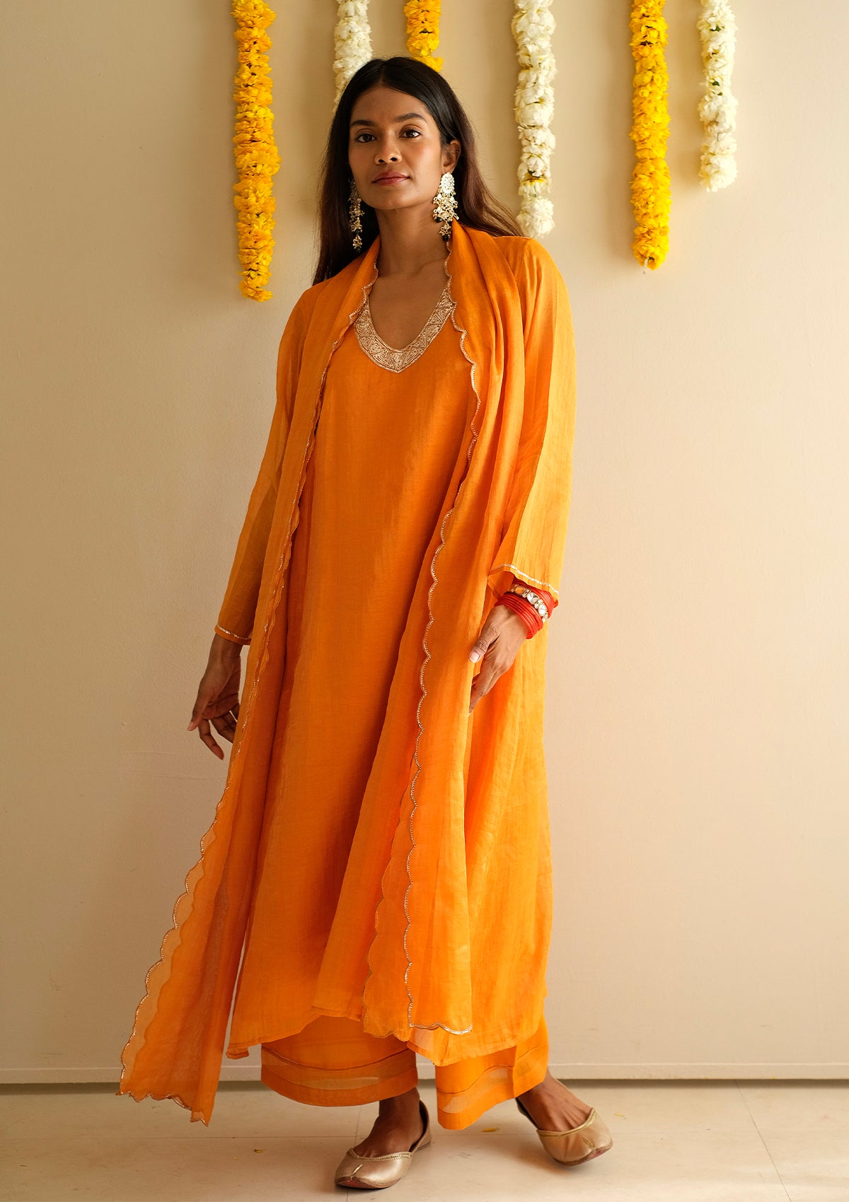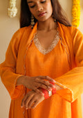 Bathed in a warm saffron hue, the kurta set is crafted in handcrafted tissue with a soft, luminous finish. Subtle shimmery zardozi embroidery traces the neckline, while voluminous sleeves detailed with fine zari at the cuffs add gentle dimension. The set is paired with a matching farshi and dupatta with a scalloped, embroidered border.